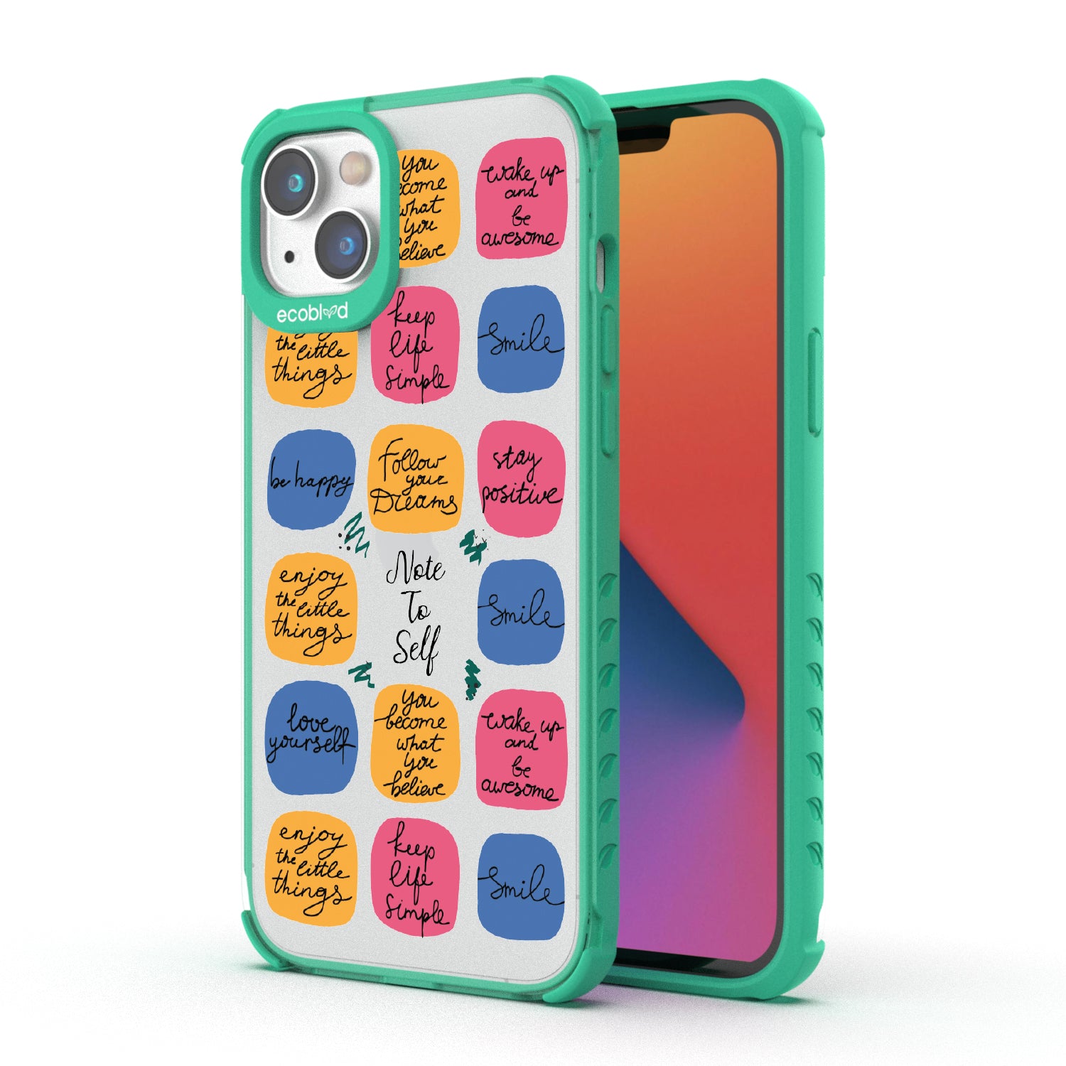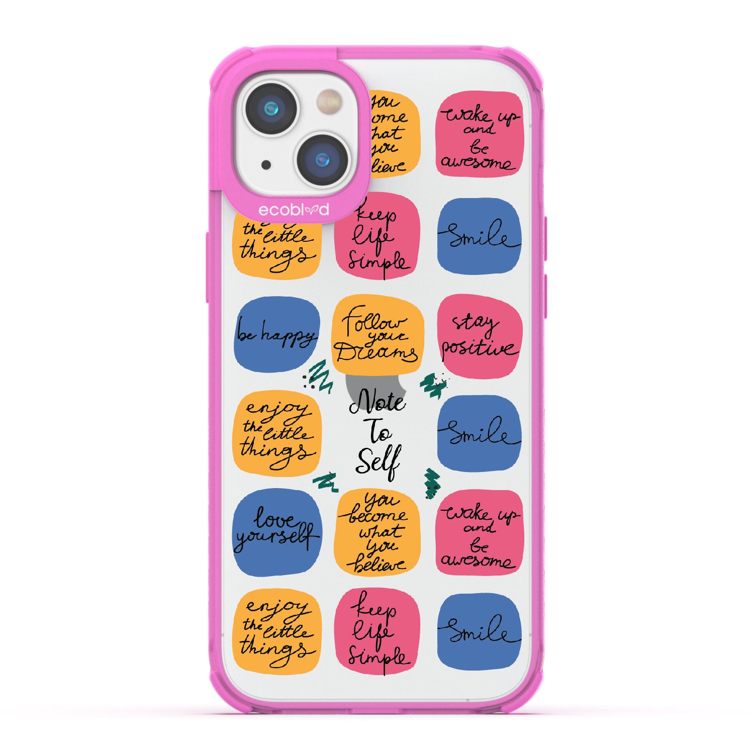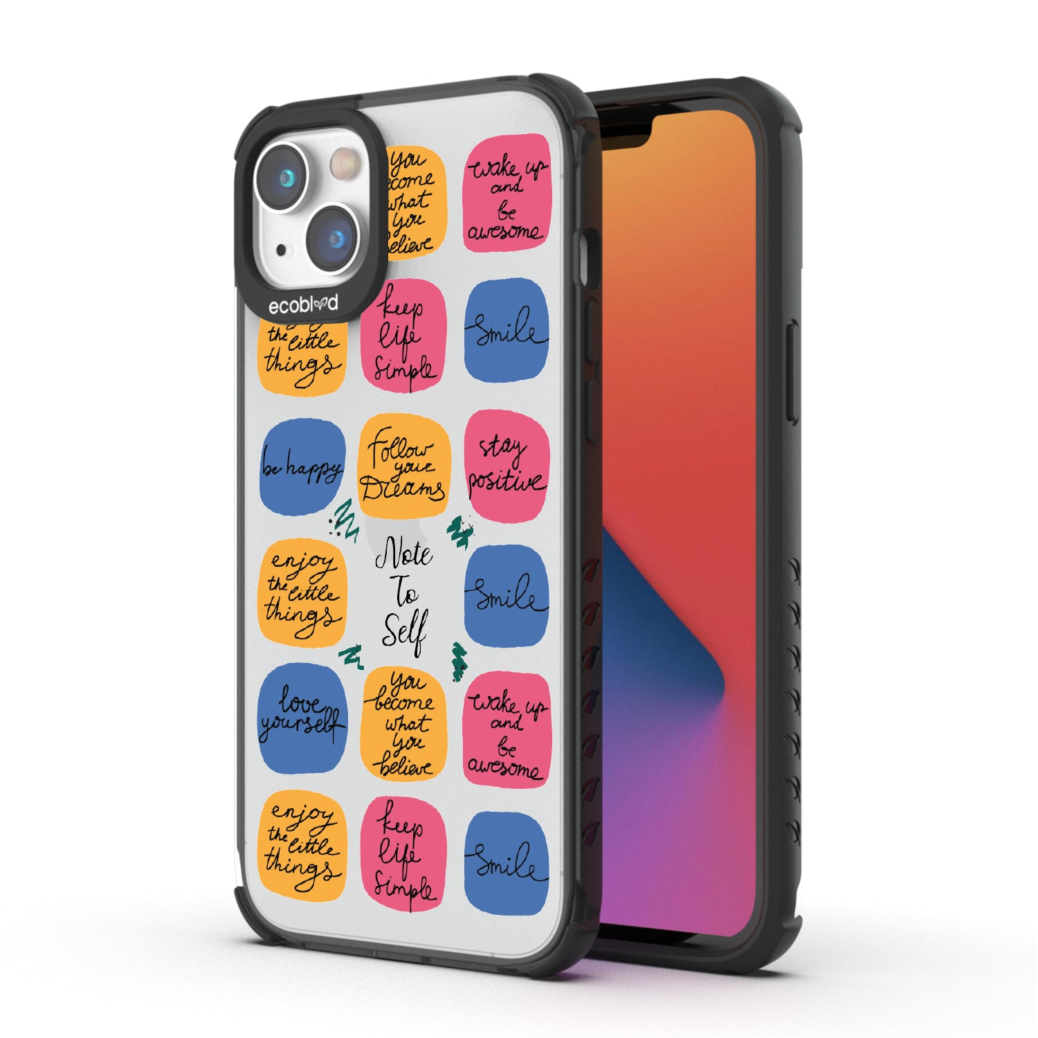 Start your day on a positive note with the Note To Self design on our Laguna clear iPhone 14 Plus case, showcasing vibrant post-it notes with thoughtful and positive affirmations like "wake up and be awesome," "smile," and "follow your dreams," inspiring a mindset that cherishes the little things, practices self-love, and finds joy in happiness.