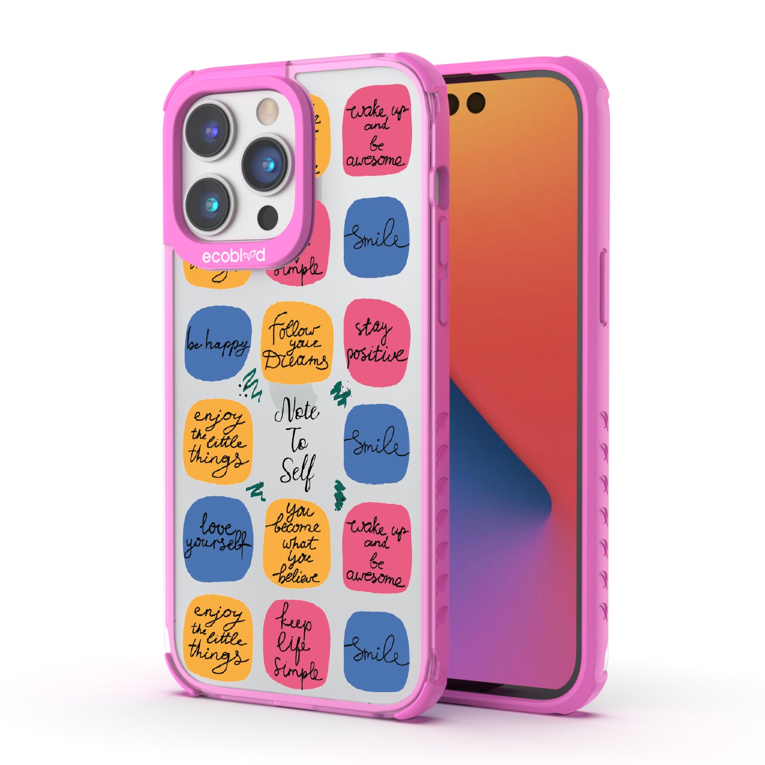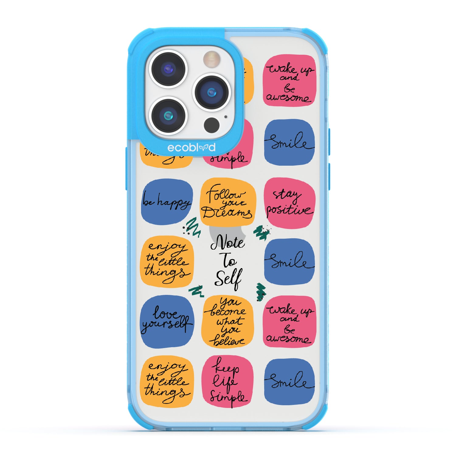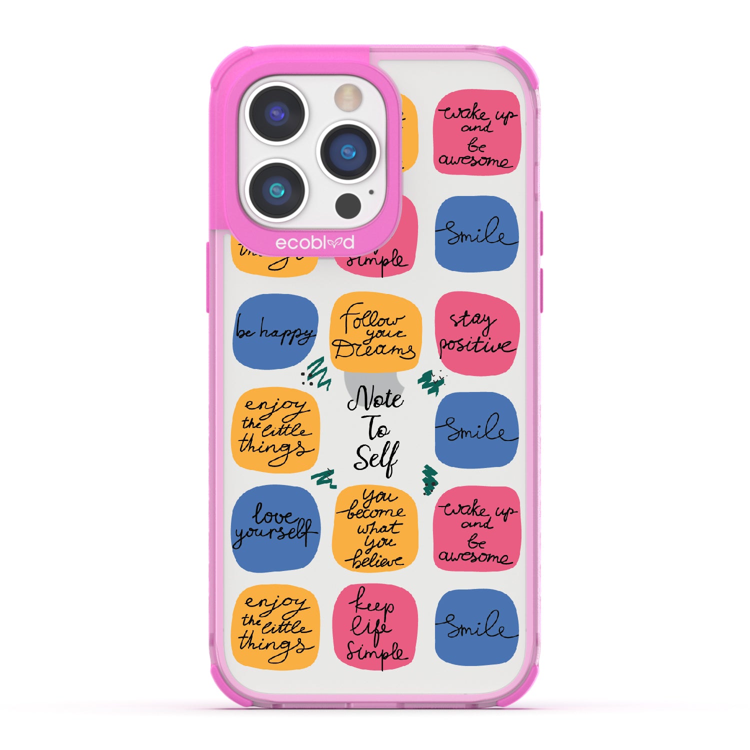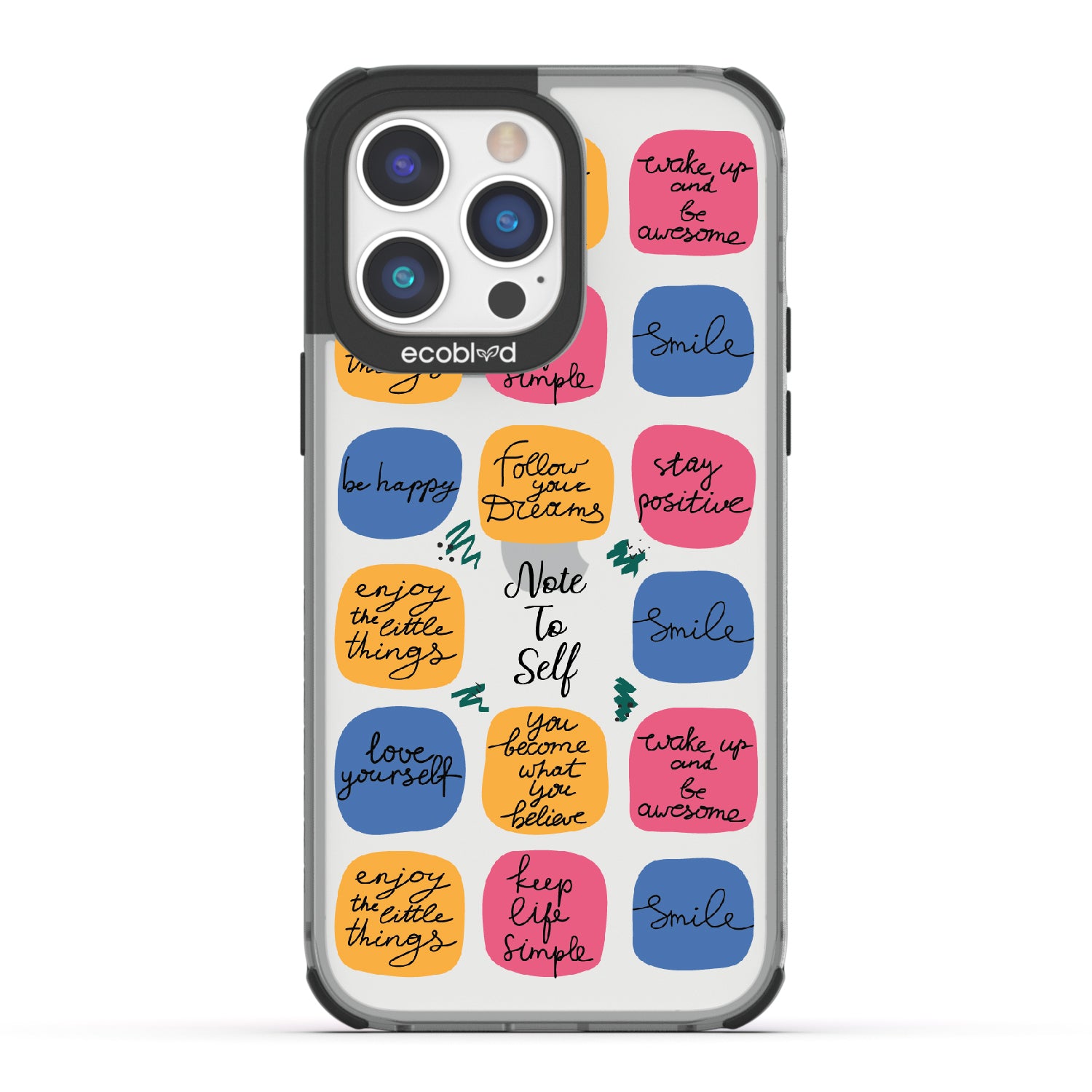 Start your day on a positive note with the Note To Self design on our Laguna clear iPhone 14 Pro case, showcasing vibrant post-it notes with thoughtful and positive affirmations like "wake up and be awesome," "smile," and "follow your dreams," inspiring a mindset that cherishes the little things, practices self-love, and finds joy in happiness.