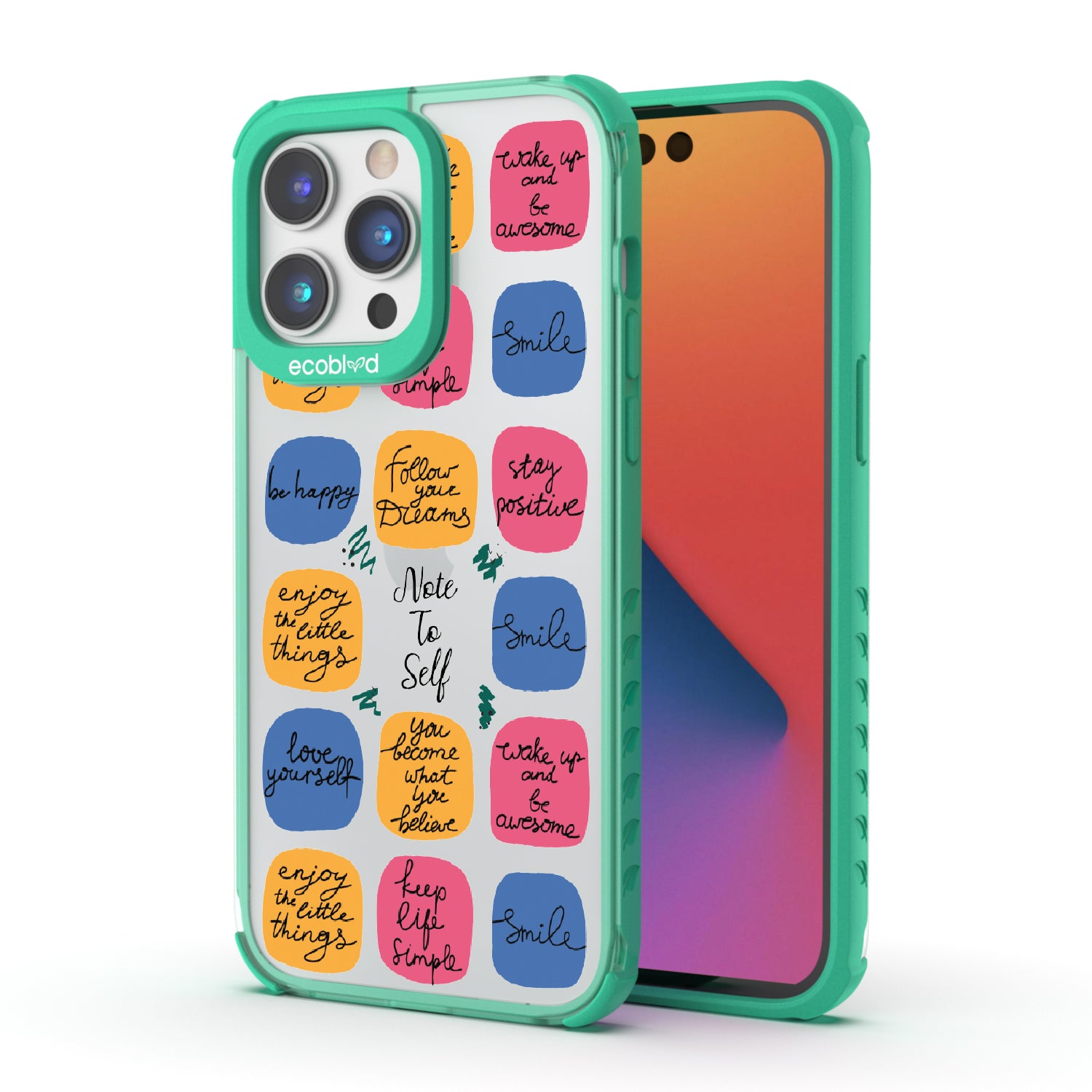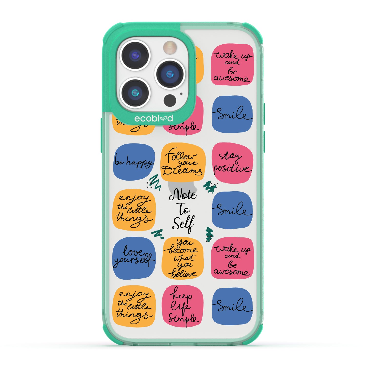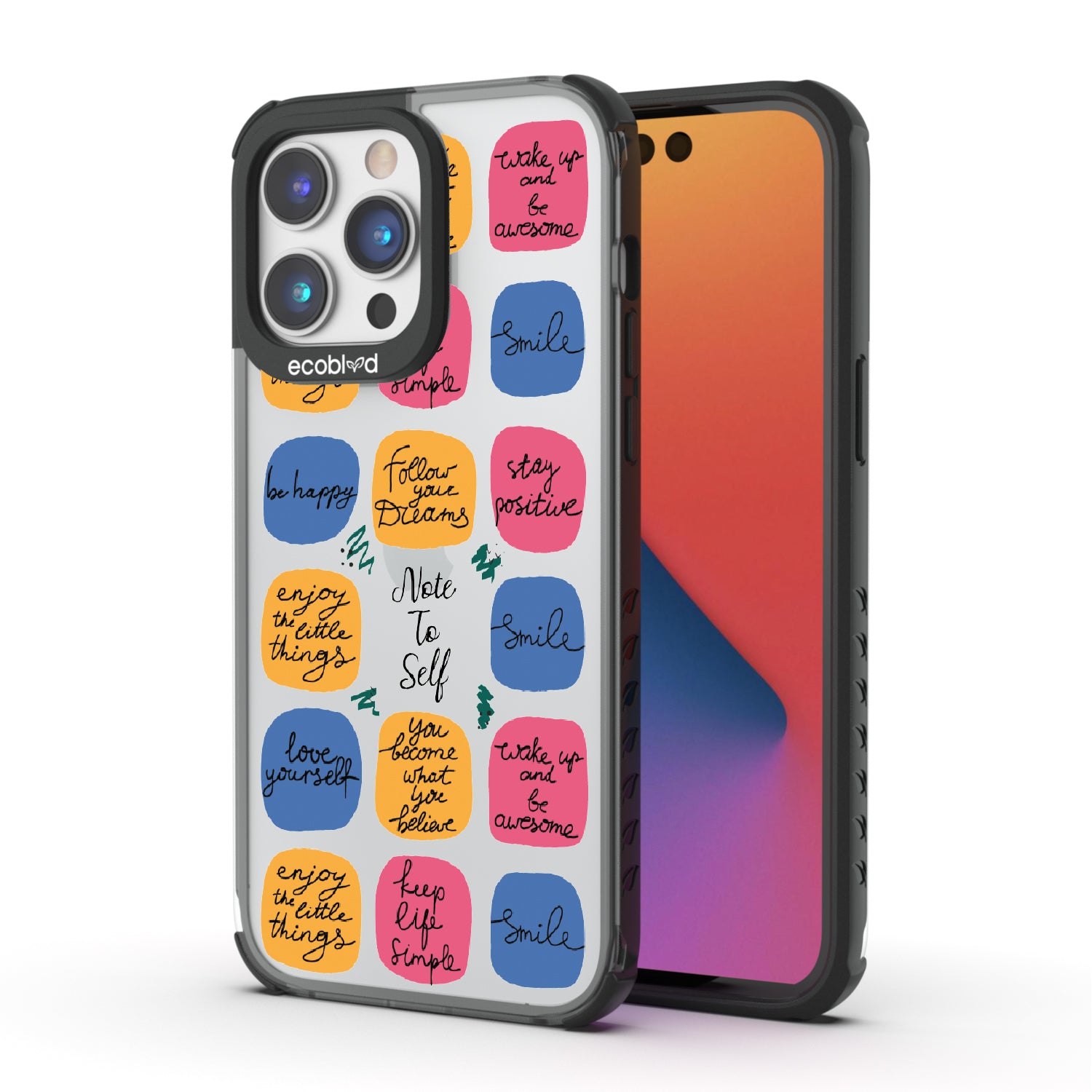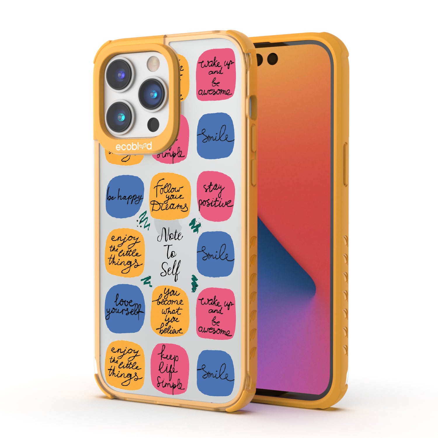 Start your day on a positive note with the Note To Self design on our Laguna clear iPhone 14 Pro case, showcasing vibrant post-it notes with thoughtful and positive affirmations like "wake up and be awesome," "smile," and "follow your dreams," inspiring a mindset that cherishes the little things, practices self-love, and finds joy in happiness.