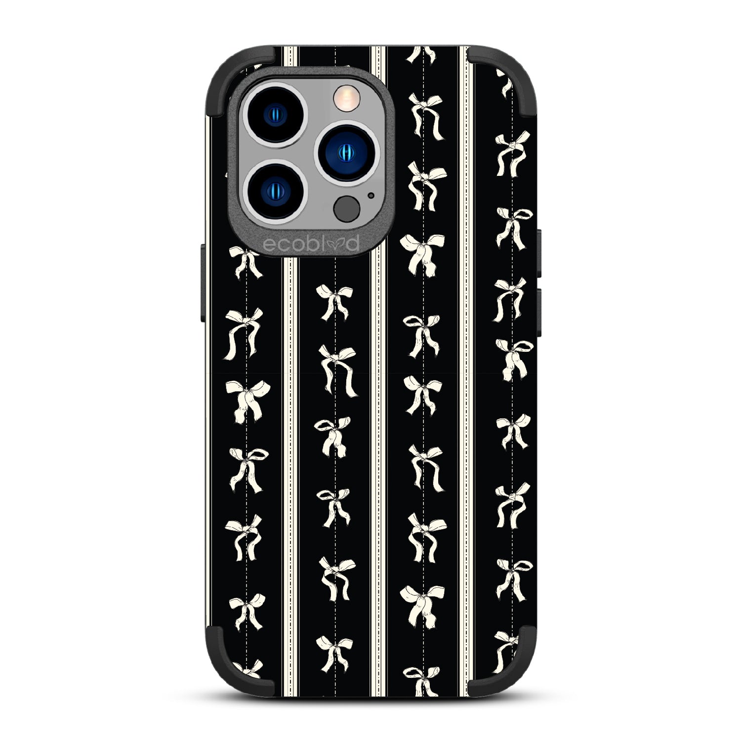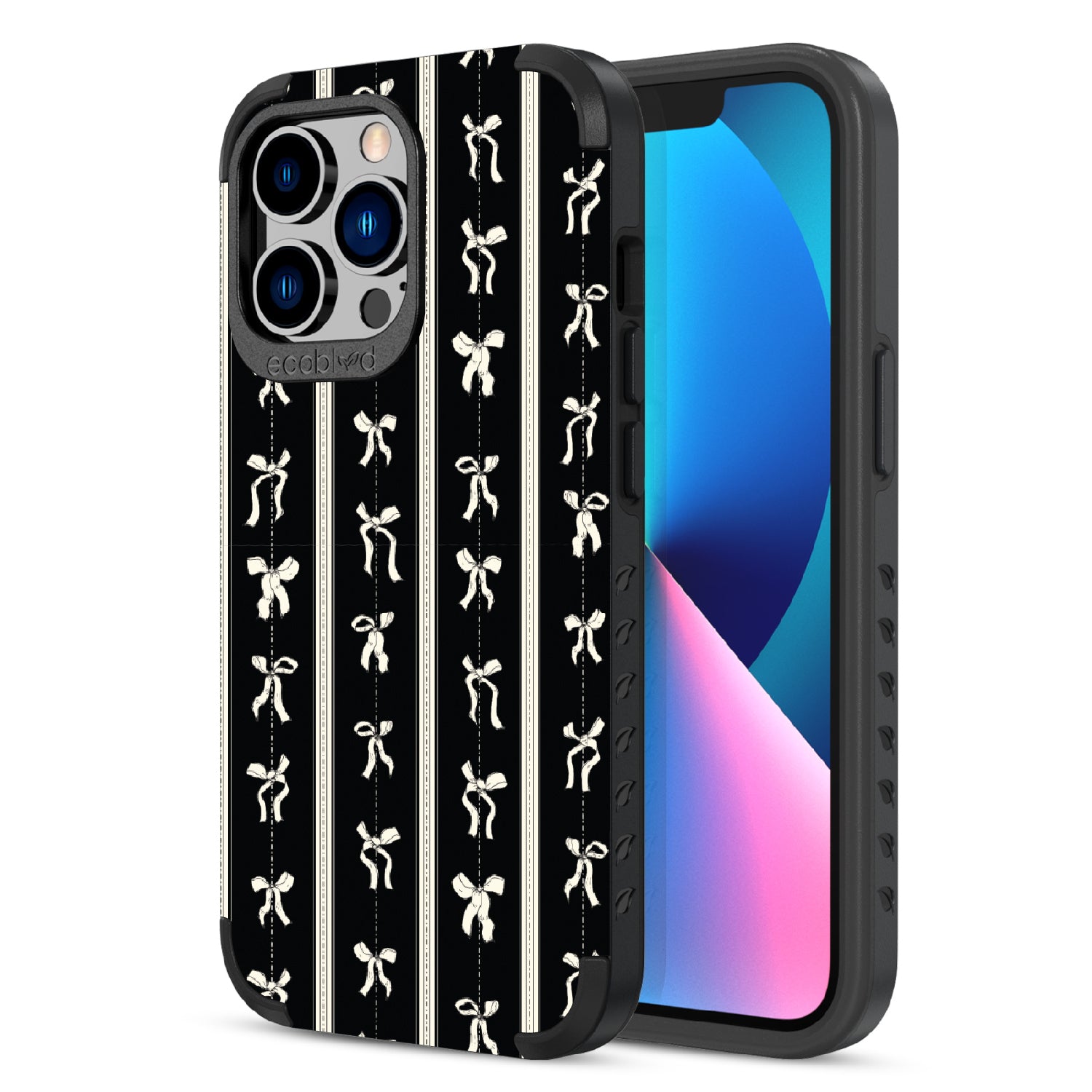 Twirl like no one’s watching with the Ribbon Twirl design on our Mojave rugged and compostable iPhone 13 Pro phone case. Ribbons gracefully swirl on a sleek black lace backdrop, infusing your look with dainty sophistication. These twirling ribbons will make every step feel like a stylish dance.