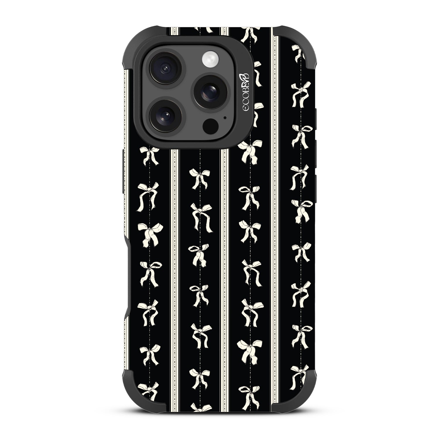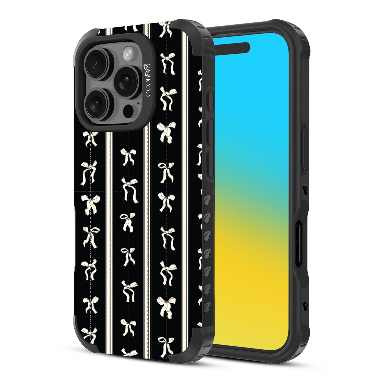 Twirl like no one¡¯s watching with the Ribbon Twirl design on our Reforge rugged iPhone 16 Pro phone case. Ribbons gracefully swirl on a sleek black lace backdrop, infusing your look with dainty sophistication. These twirling ribbons will make every step feel like a stylish dance.