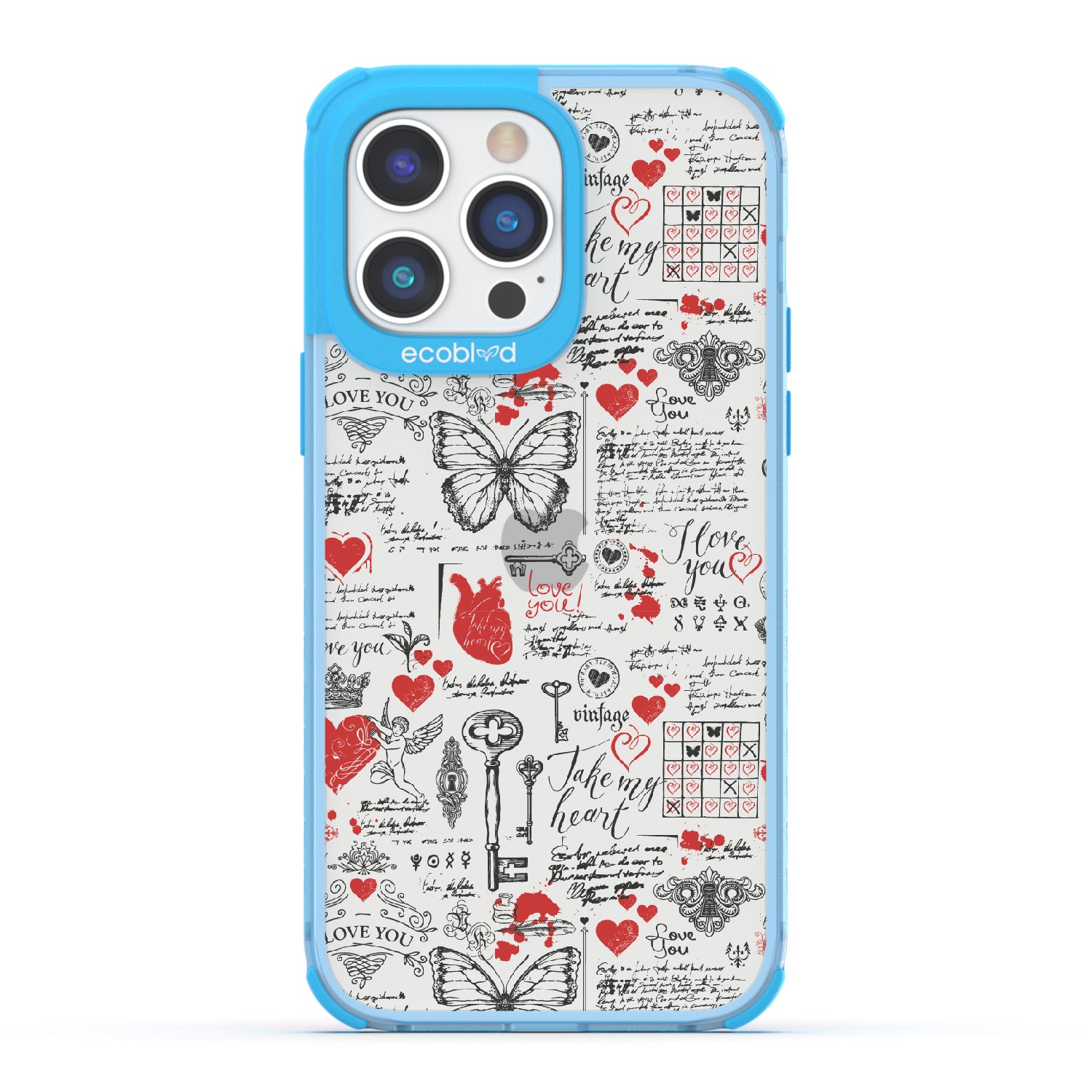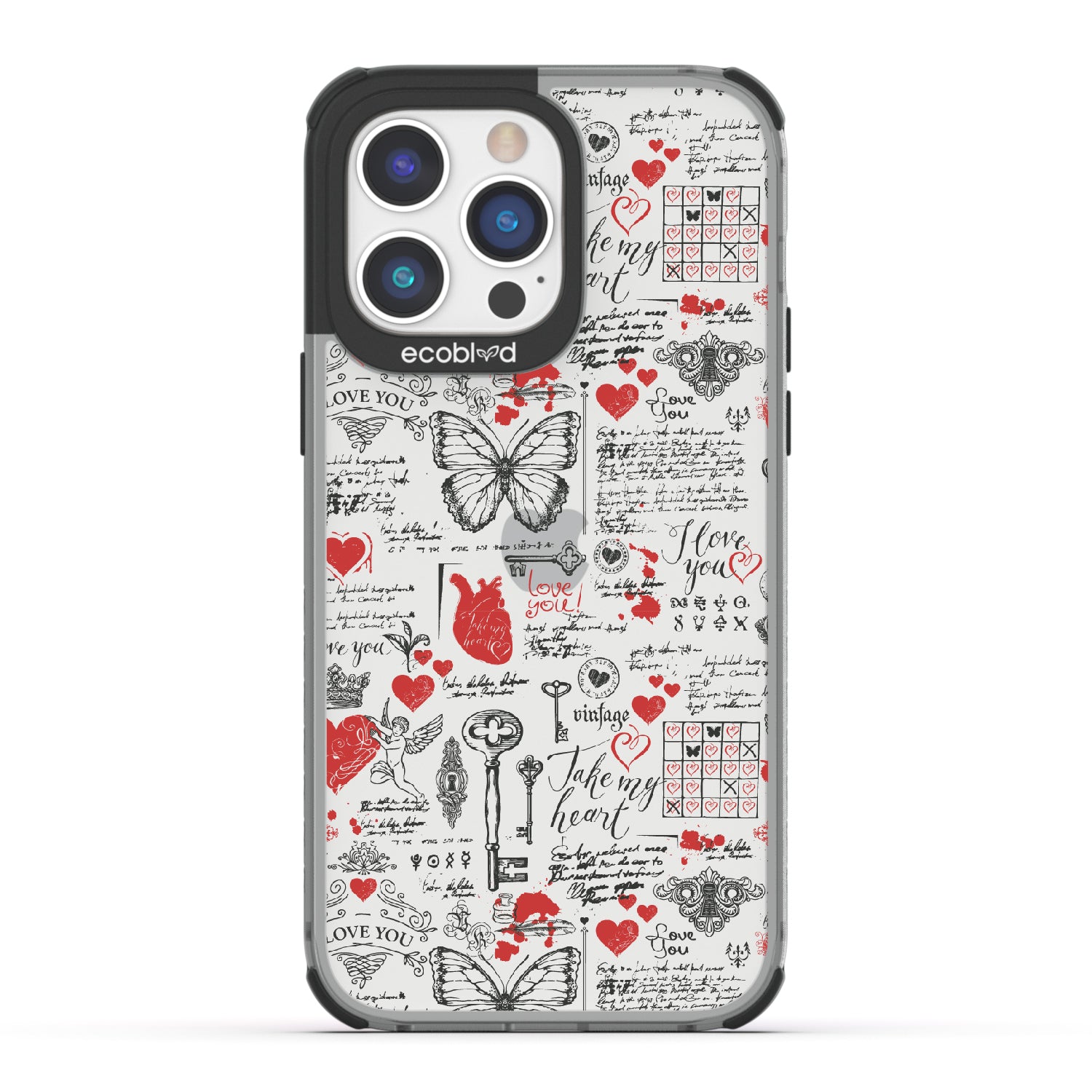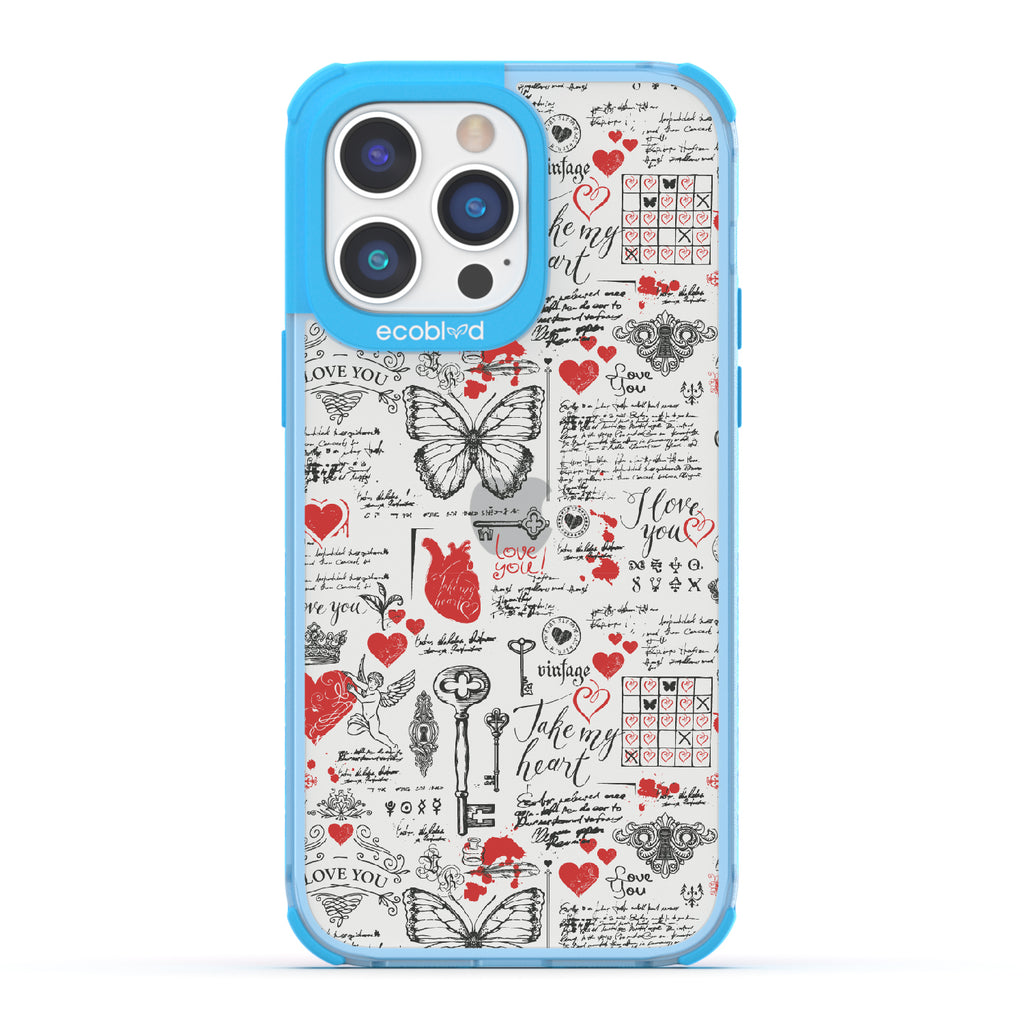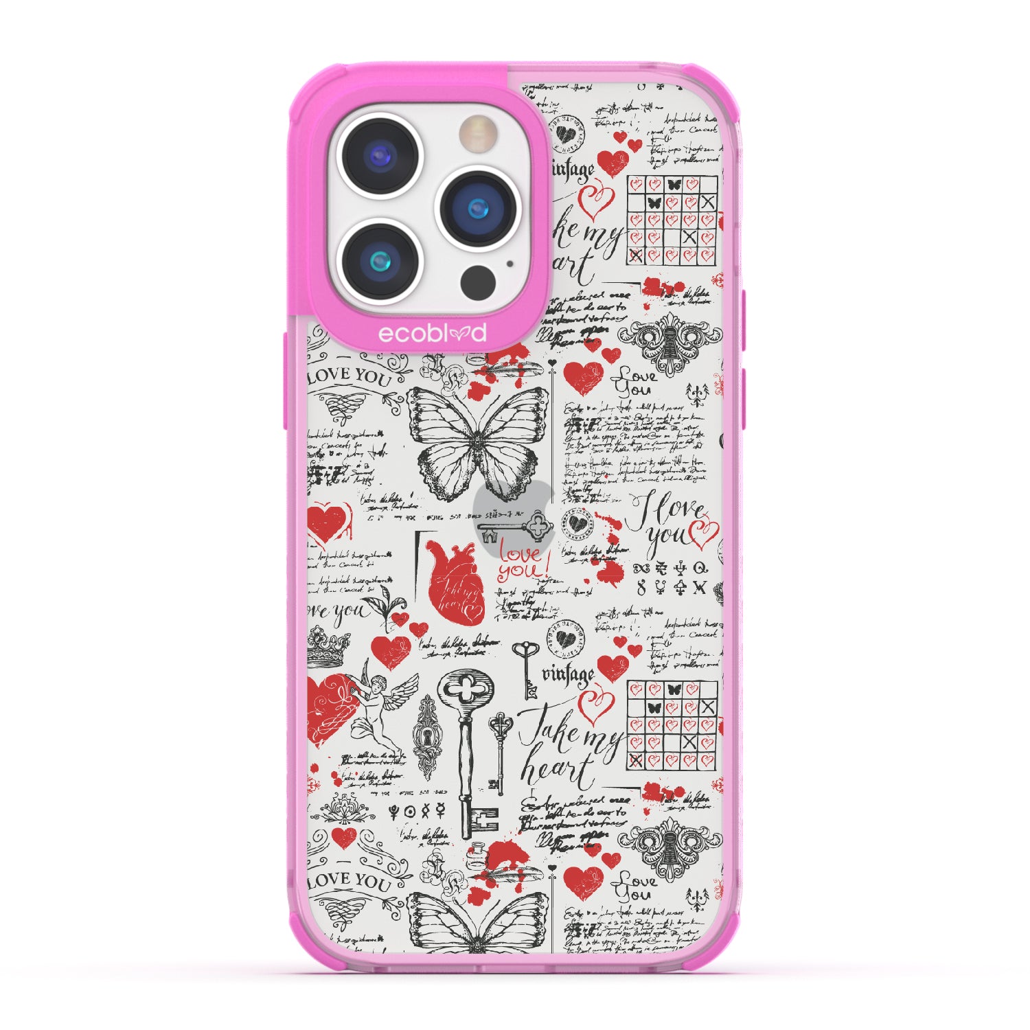 Write your emotions with the Love Notes design on our Laguna clear iPhone 14 Pro Max phone case. This cute scrapbook-style collage, featuring vintage stamps capturing cupid, hearts, butterflies, and phrases like "take my heart" and "I love you," encourages you to express your feelings through written expressions, turning your phone into a cherished collection of love notes.