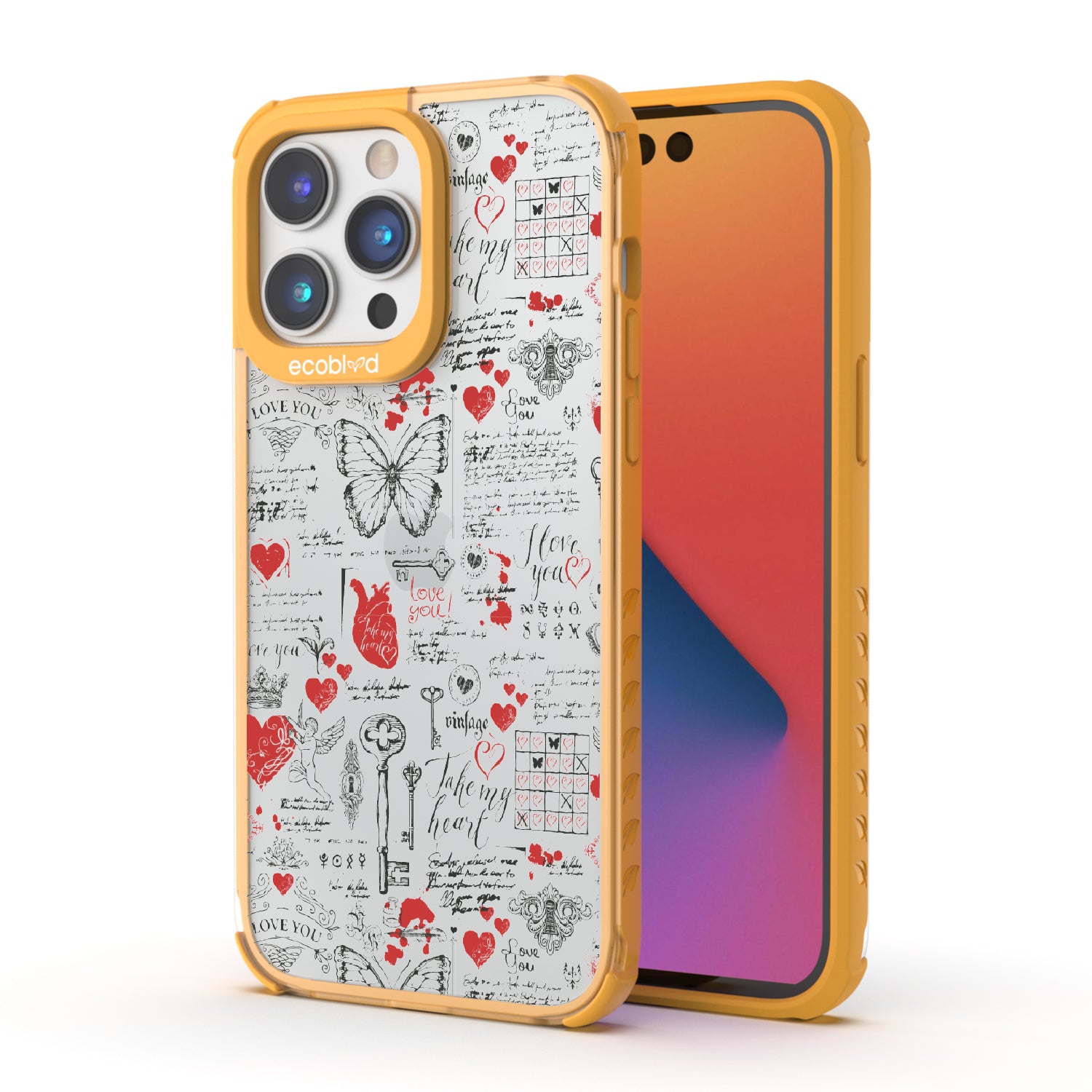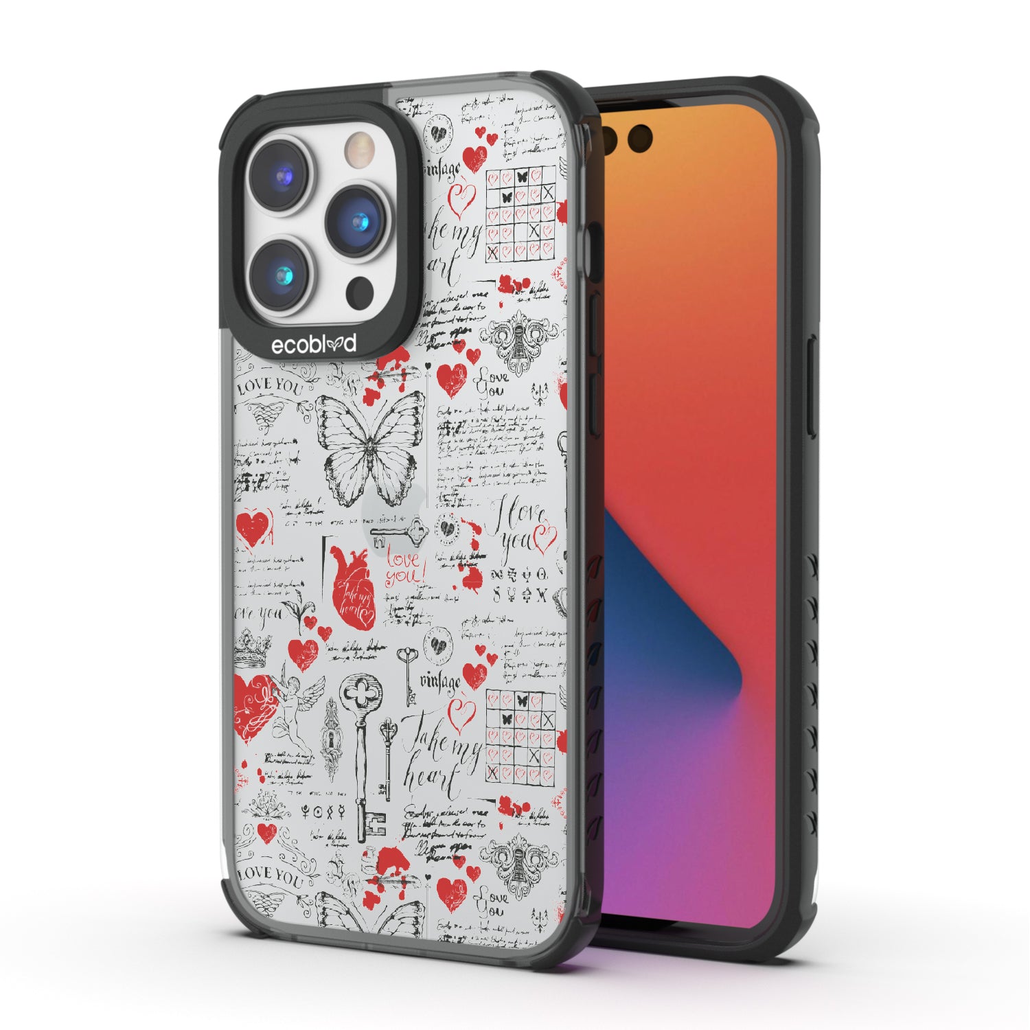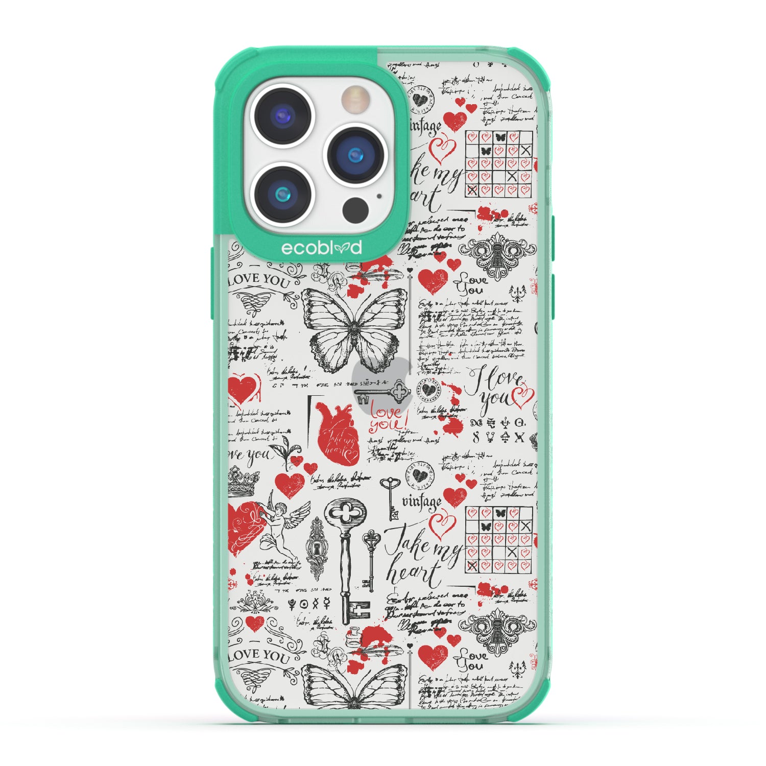 Write your emotions with the Love Notes design on our Laguna clear iPhone 14 Pro Max phone case. This cute scrapbook-style collage, featuring vintage stamps capturing cupid, hearts, butterflies, and phrases like "take my heart" and "I love you," encourages you to express your feelings through written expressions, turning your phone into a cherished collection of love notes.