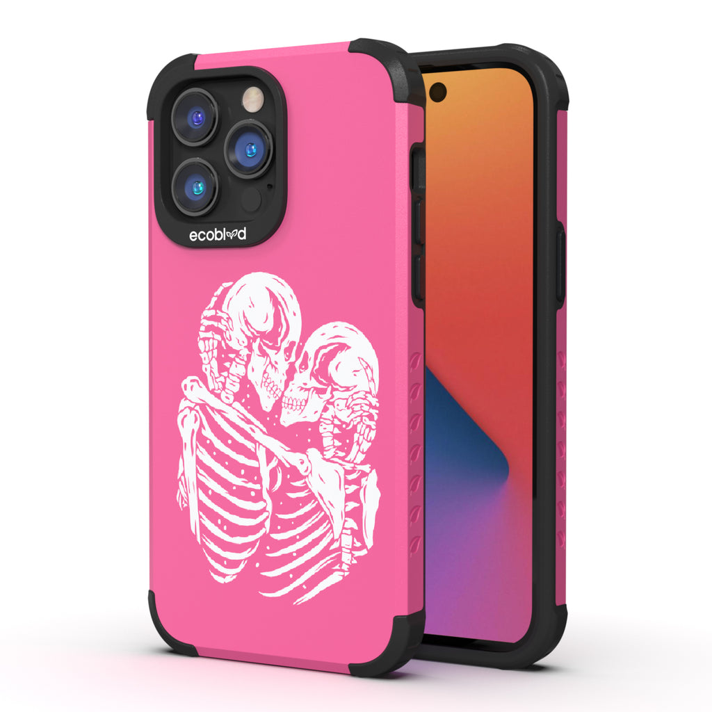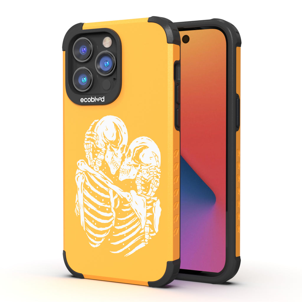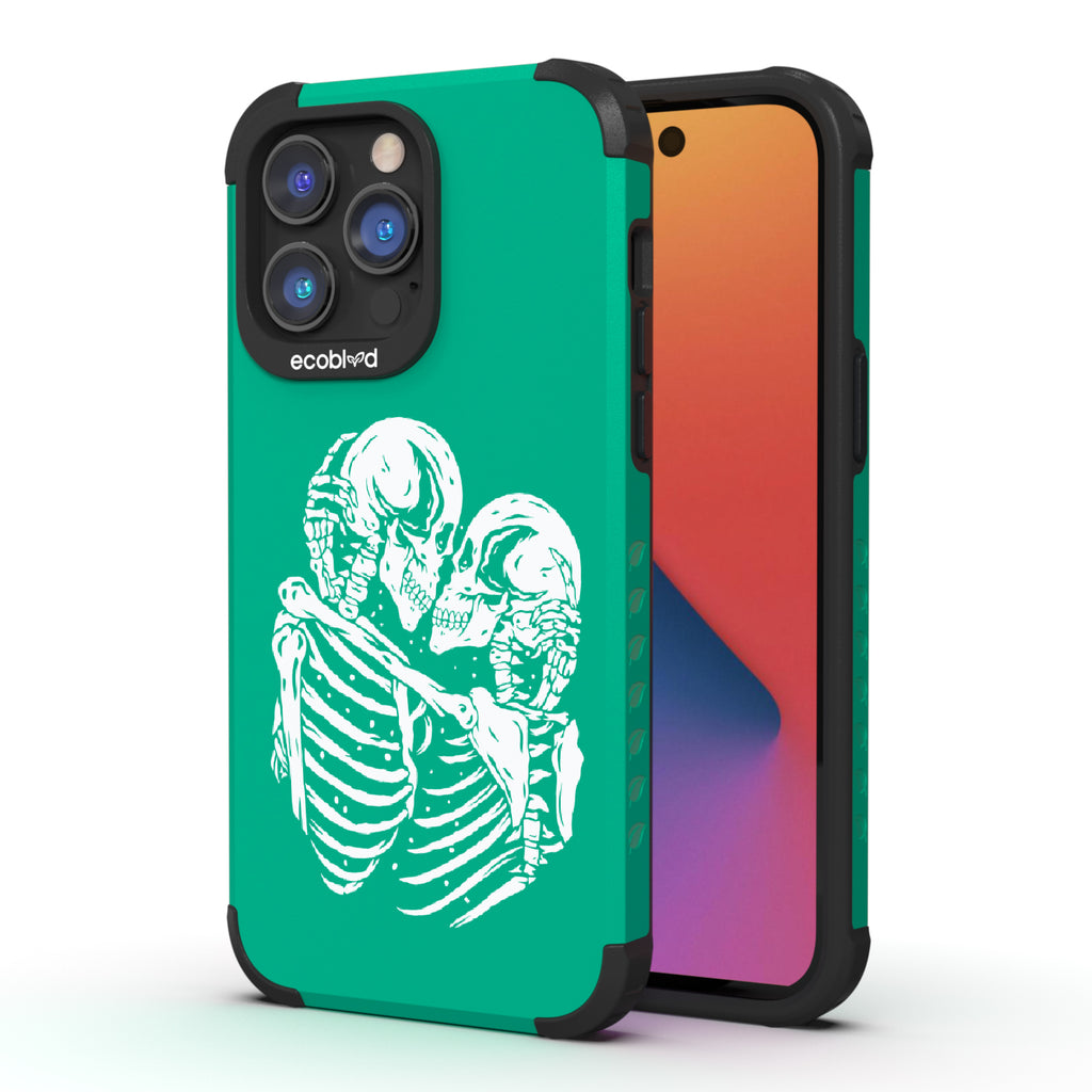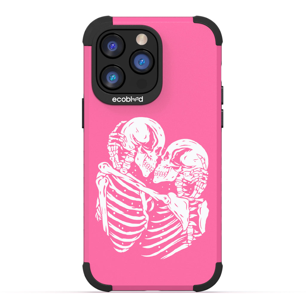 Love lasts longer than life with the Evermore design on our Mojave rugged and compostable iPhone 14 Pro Max case, where love's flame persists beyond life's extinguishing. A skeletal couple's eternal kiss serves as a testament to the enduring power of affection.