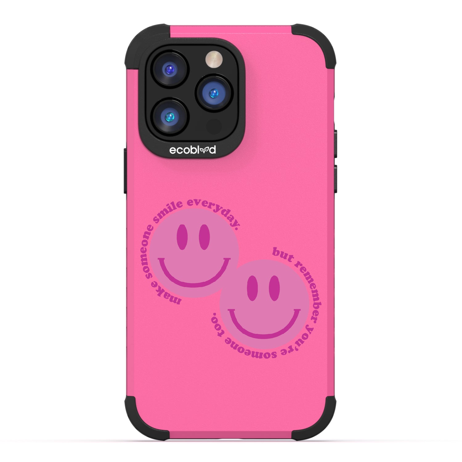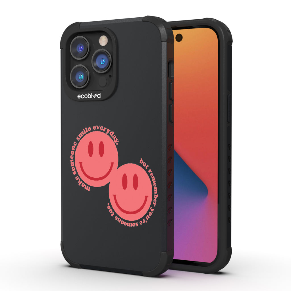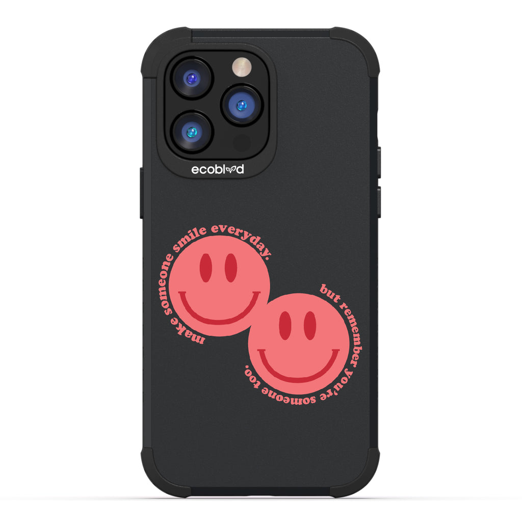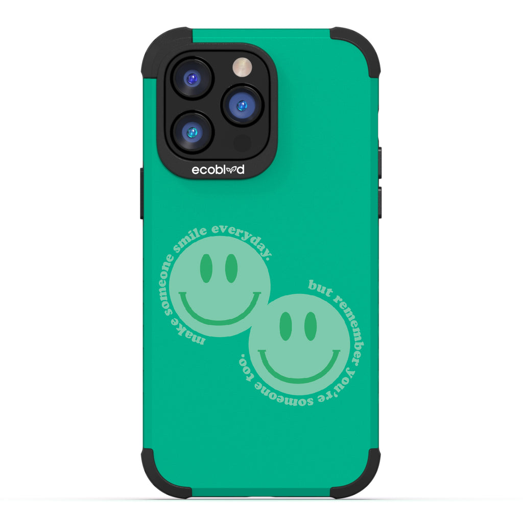 Spread happiness with the Make Someone Smile design on our Mojave rugged and compostable iPhone 14 Pro Max case. Featuring two cheerful smiley faces, this design prompts you to be a source of joy for others. While you make someone else smile, recognize that you too are deserving of moments filled with happiness.