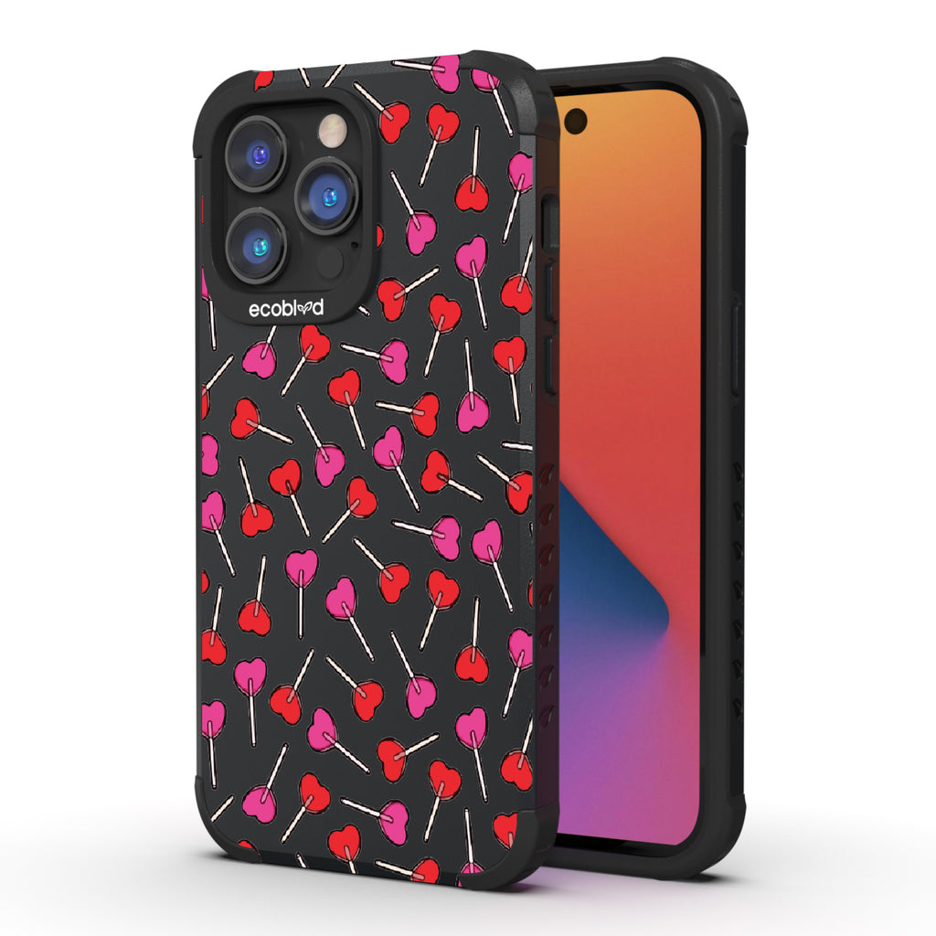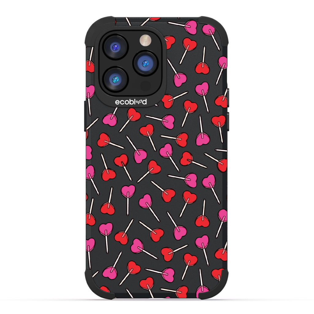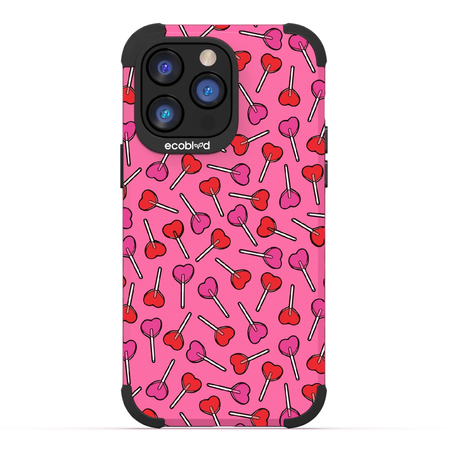 Satisfy your romantic cravings with the Sucker For You design on our Mojave rugged and compostable iPhone 14 Pro Max case. As sweet heart-shaped lollipops add more sugar to your phone, as a delightful surrender, making it a delectable expression of your affection.