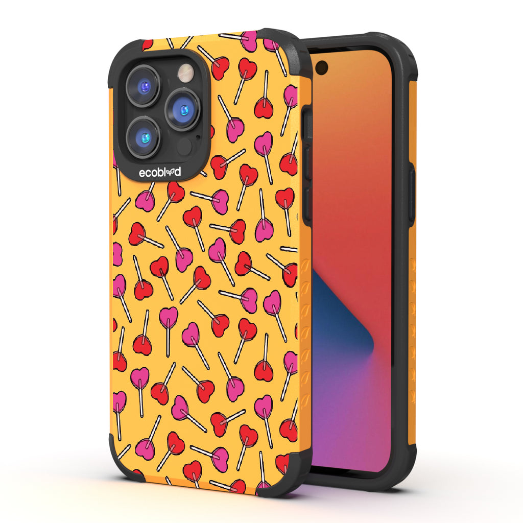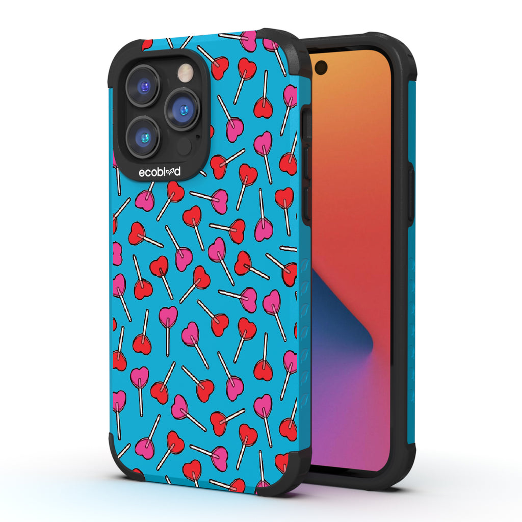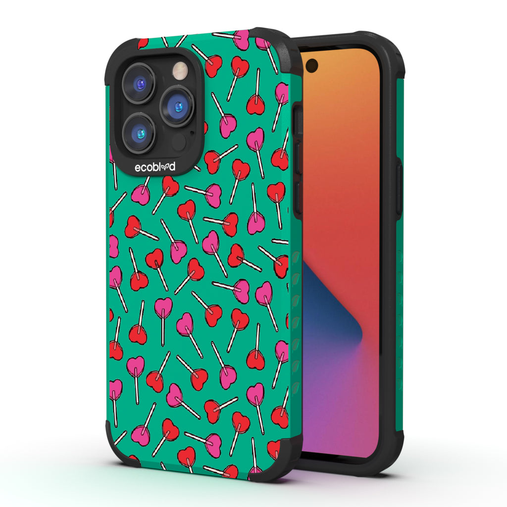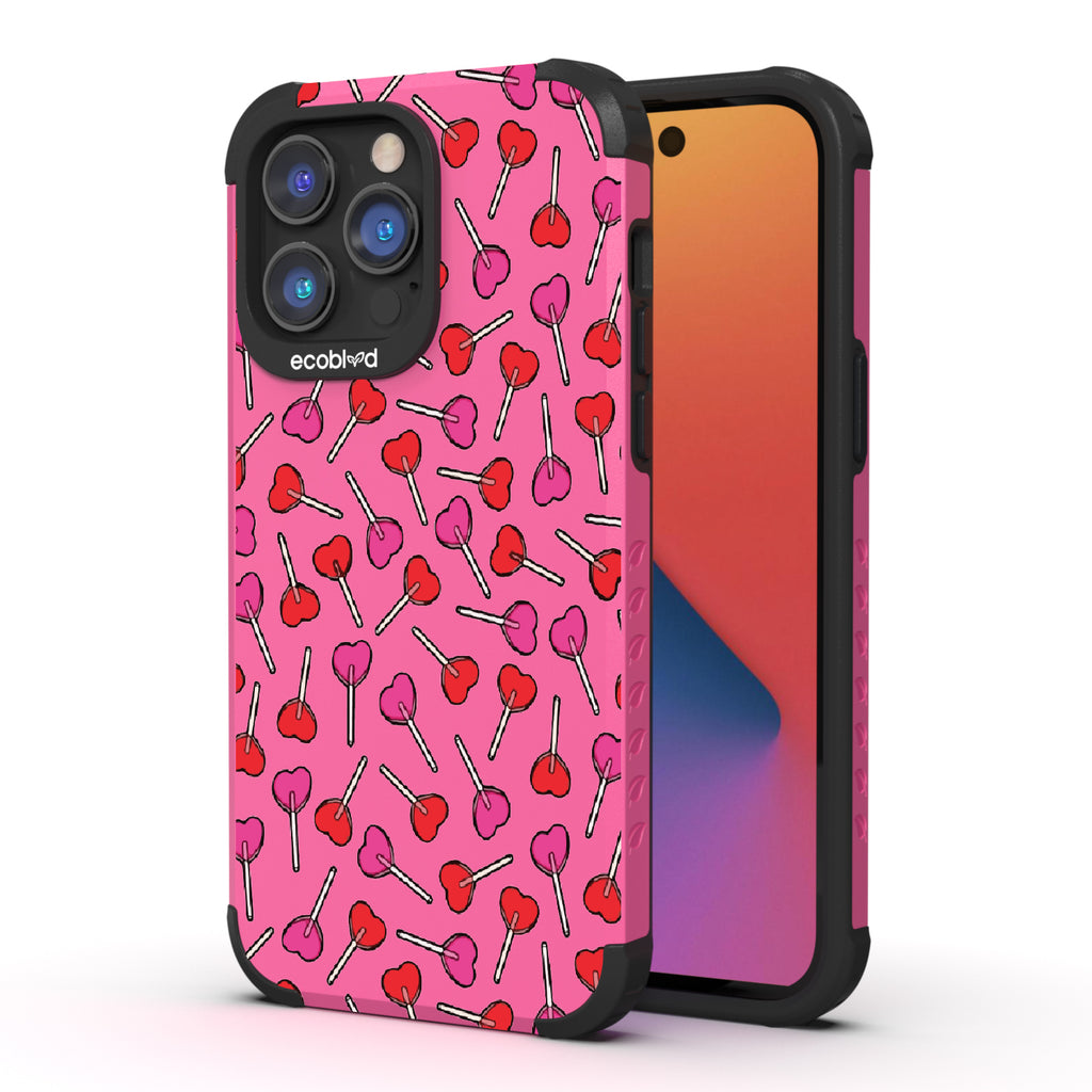 Satisfy your romantic cravings with the Sucker For You design on our Mojave rugged and compostable iPhone 14 Pro Max case. As sweet heart-shaped lollipops add more sugar to your phone, as a delightful surrender, making it a delectable expression of your affection.