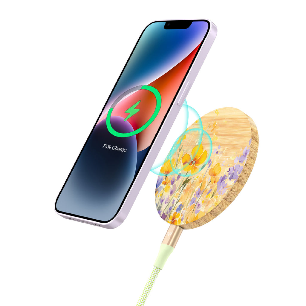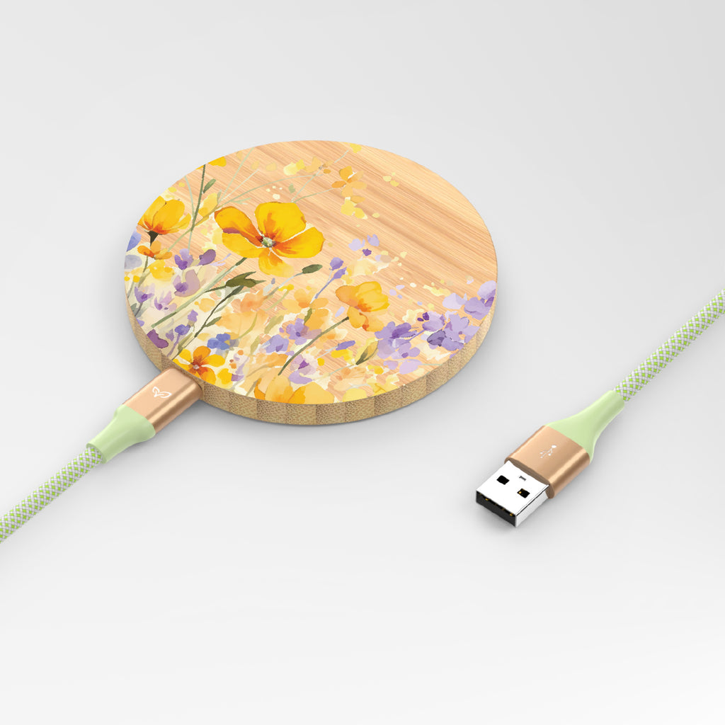 A moment in the light never looked so wild. The Meadowlight design on our Bamboo Wireless Charger lets soft florals run free in a watercolor wash of gold and lavender. A design that glows like a field at its most unfiltered.