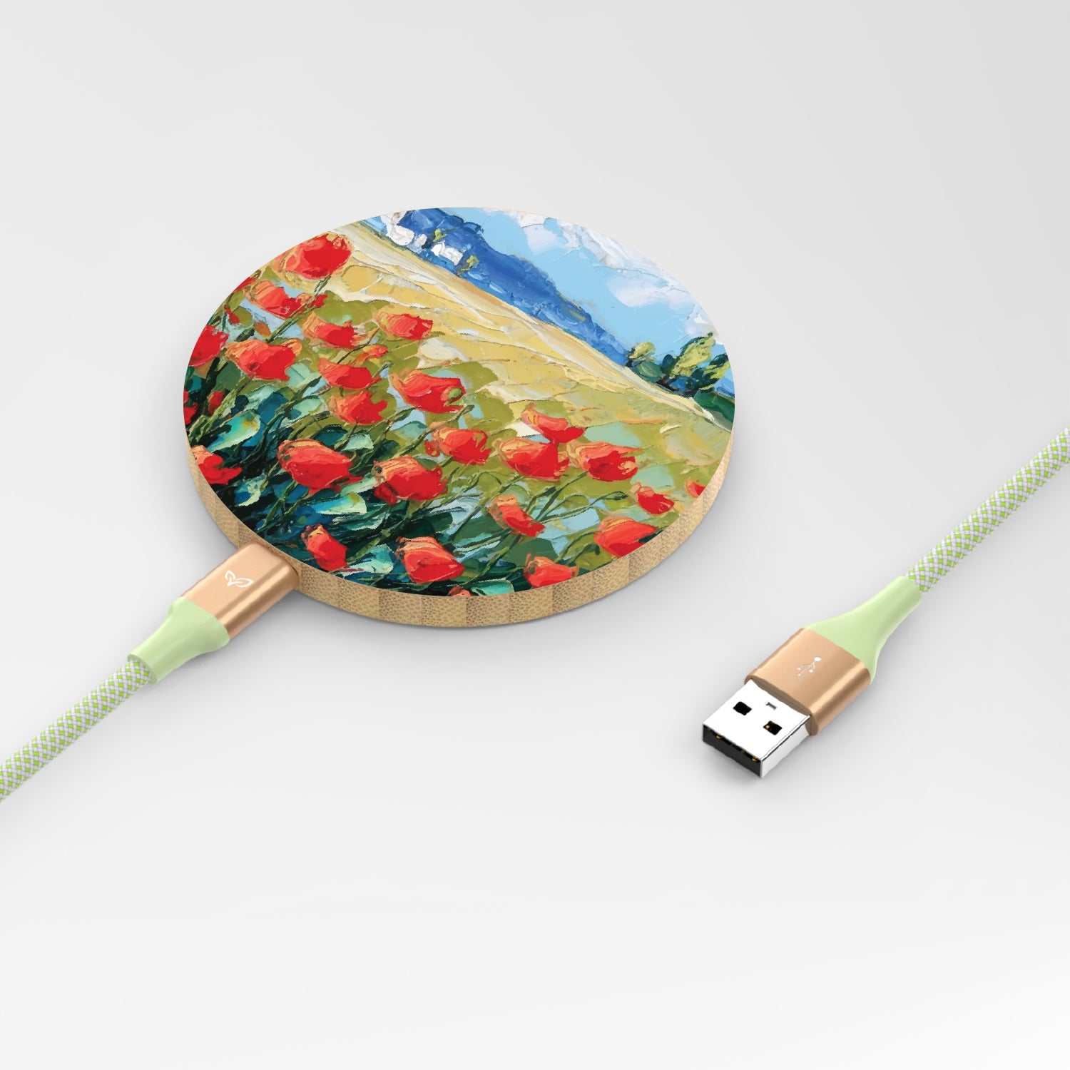 Looks can lull. The Sleepy Bloom design on our Bamboo Wireless Charger surrounds bold poppies with diffused light and stillness, creating a moment so vivid it could almost close your eyes for you. Soft. Lush. Spell-like.