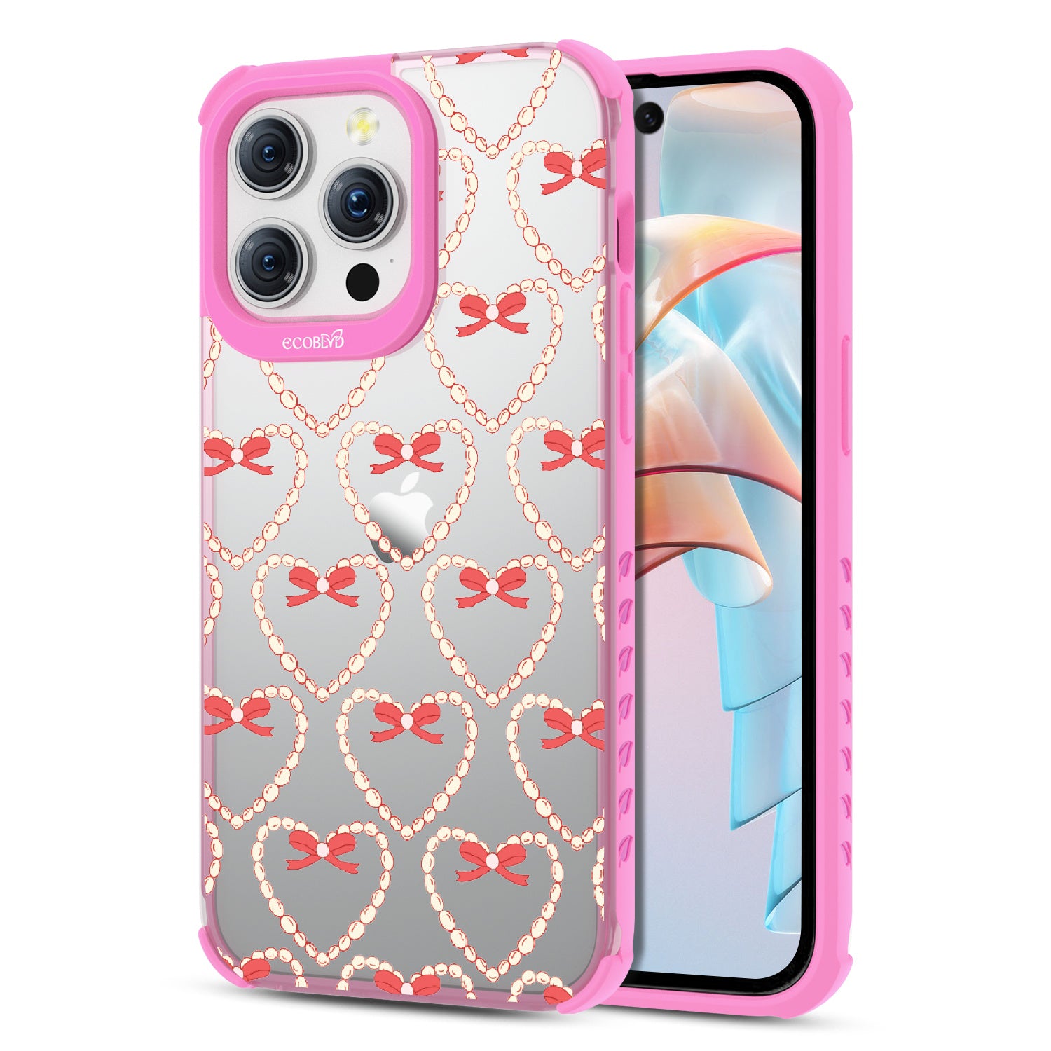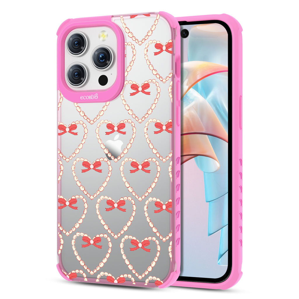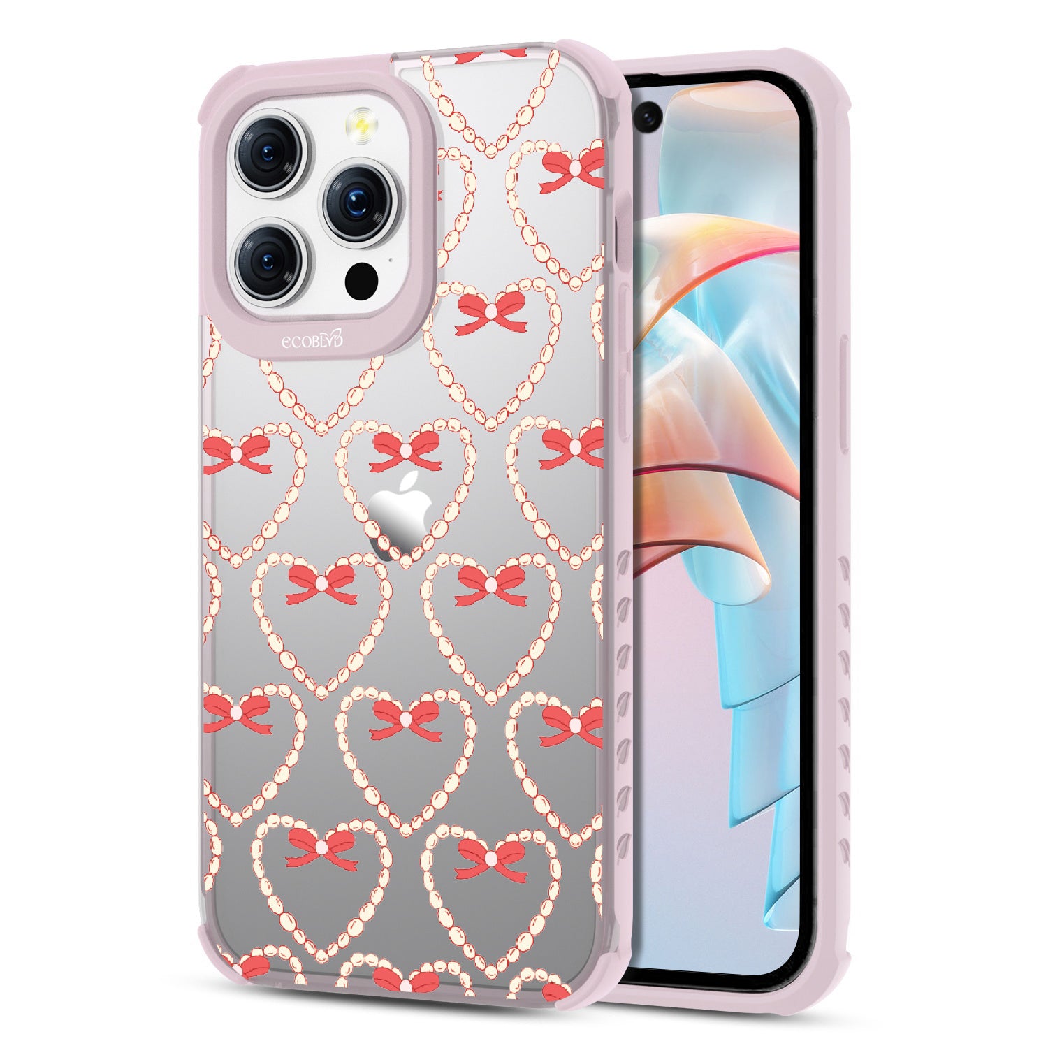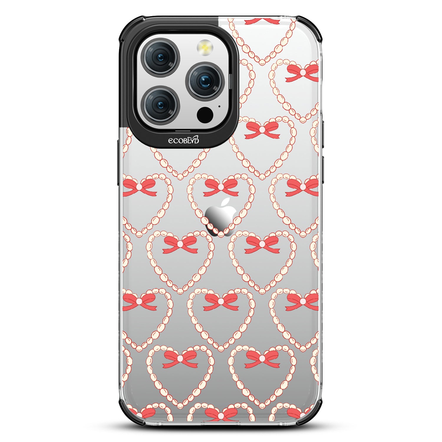 Tug at your Heartstrings with this beautifully crafted design on Laguna clear iPhone 15 Pro Max phone case, featuring delicate pearls and coquettish bows arranged in heart shapes. Let your phone strum the chords of elegance with this captivating pattern. Each heart-shaped detail will make your style sing in love songs.