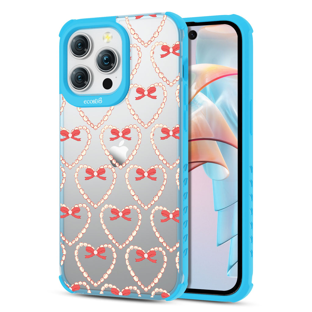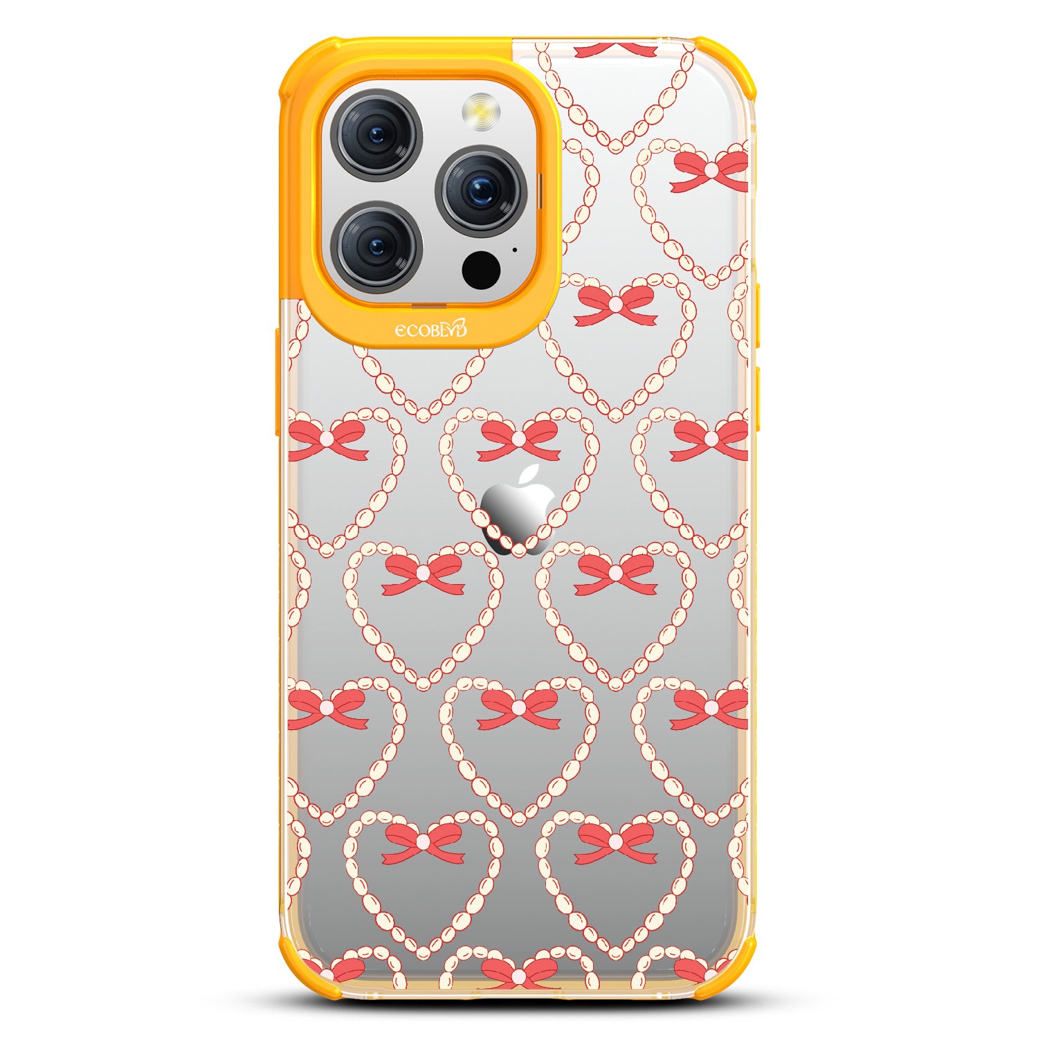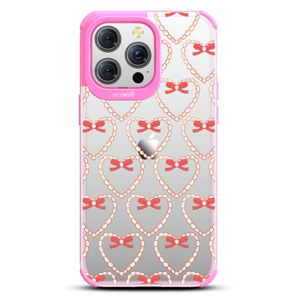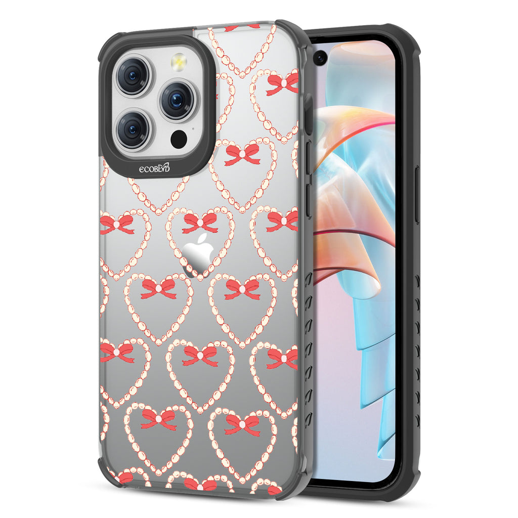 Tug at your Heartstrings with this beautifully crafted design on Laguna clear iPhone 15 Pro Max phone case, featuring delicate pearls and coquettish bows arranged in heart shapes. Let your phone strum the chords of elegance with this captivating pattern. Each heart-shaped detail will make your style sing in love songs.