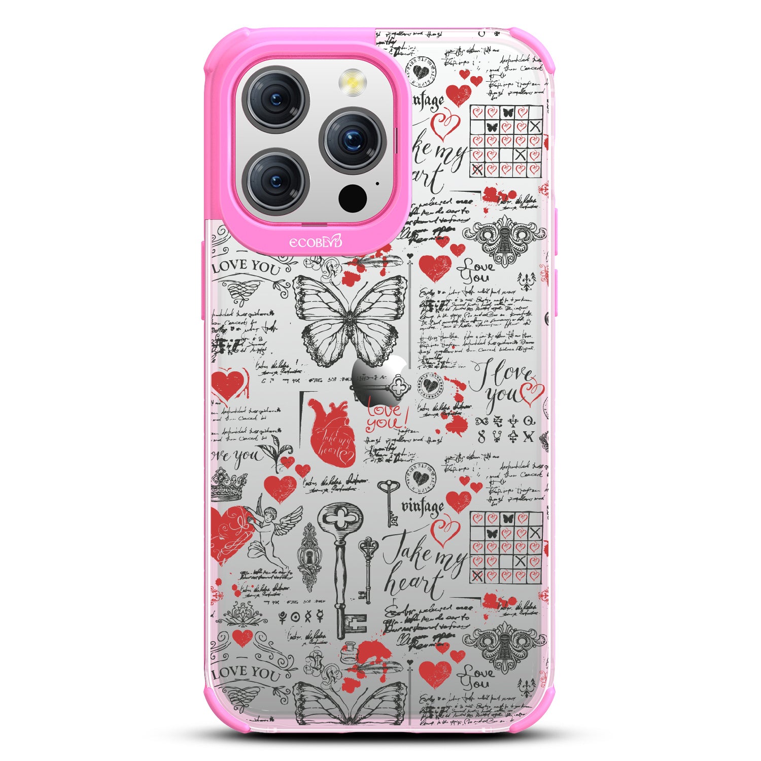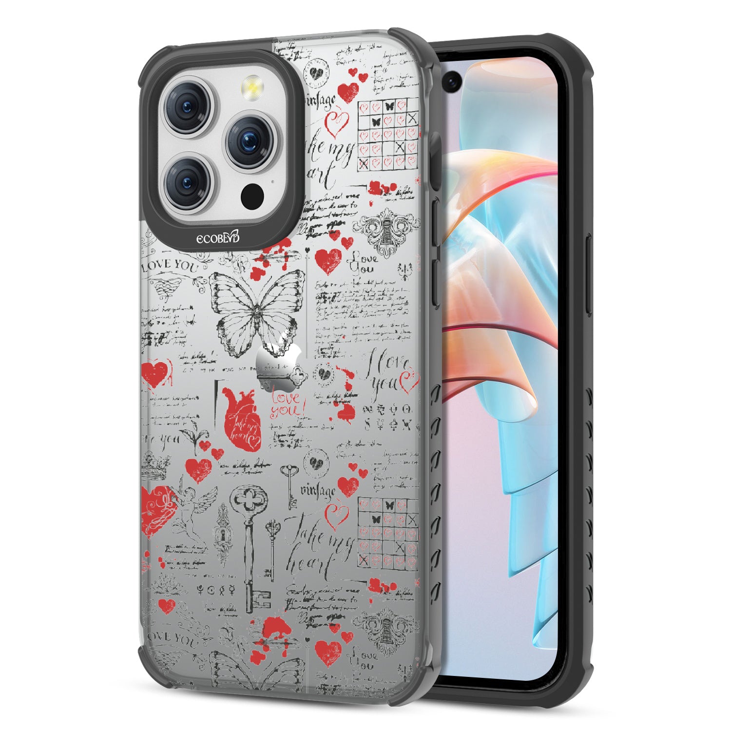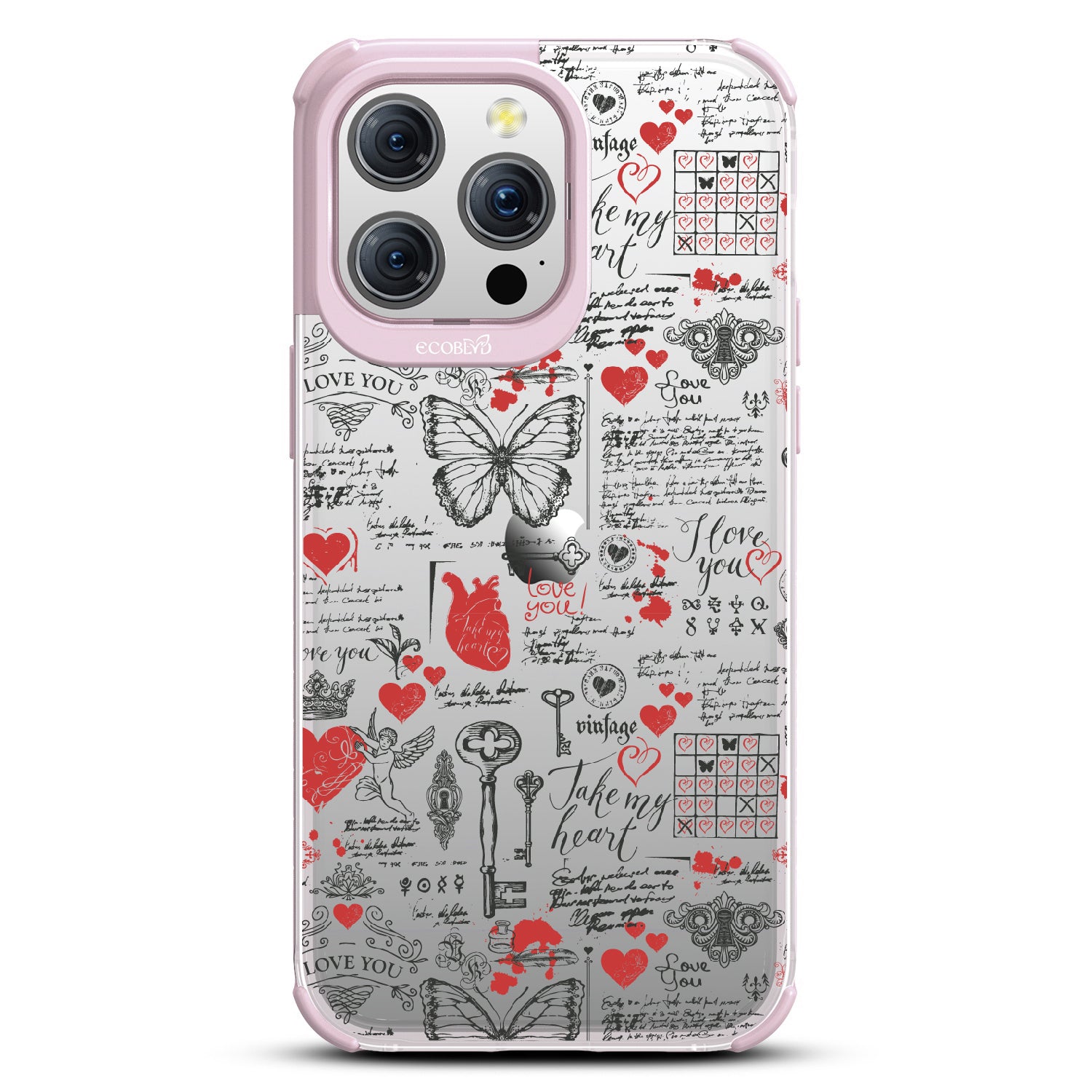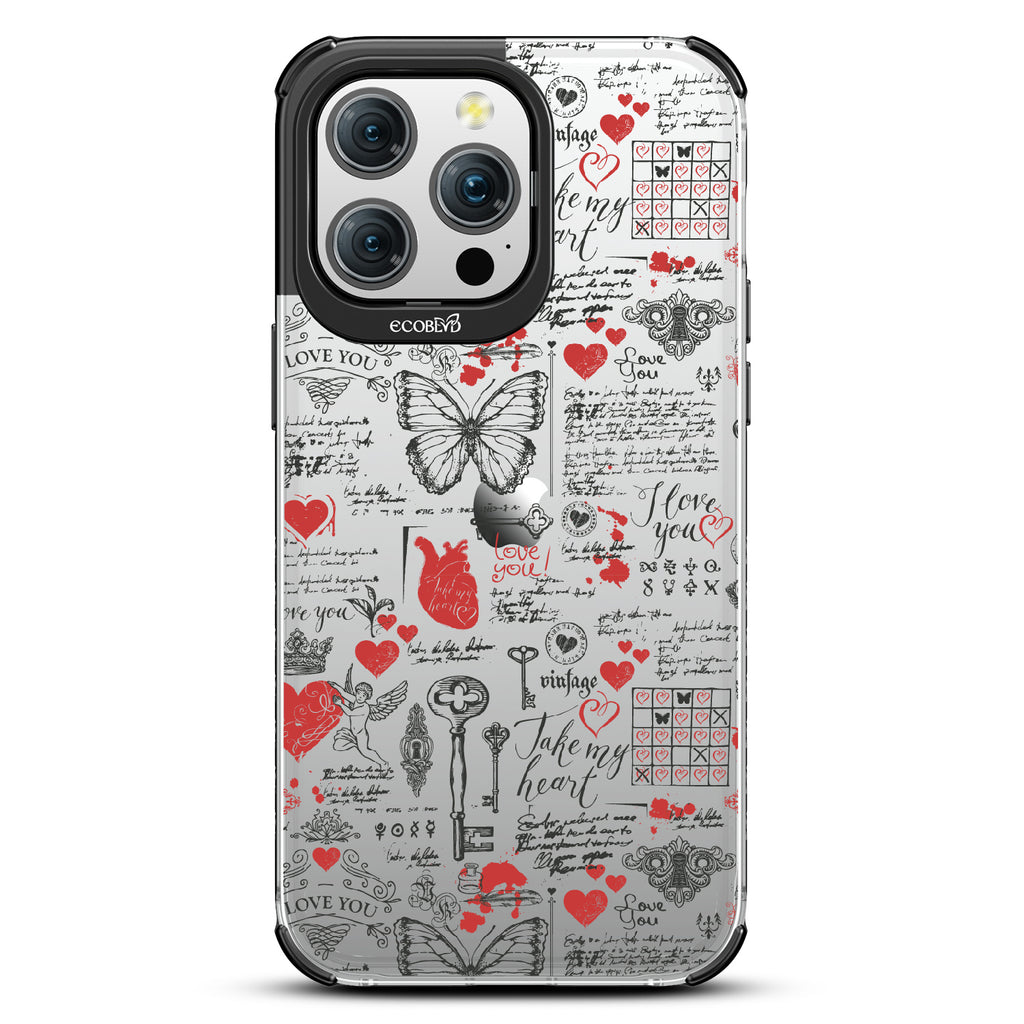 Write your emotions with the Love Notes design on our Laguna clear iPhone 15 Pro Max phone case. This cute scrapbook-style collage, featuring vintage stamps capturing cupid, hearts, butterflies, and phrases like "take my heart" and "I love you," encourages you to express your feelings through written expressions, turning your phone into a cherished collection of love notes.