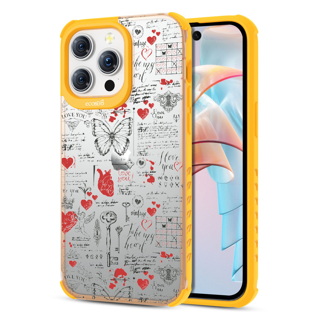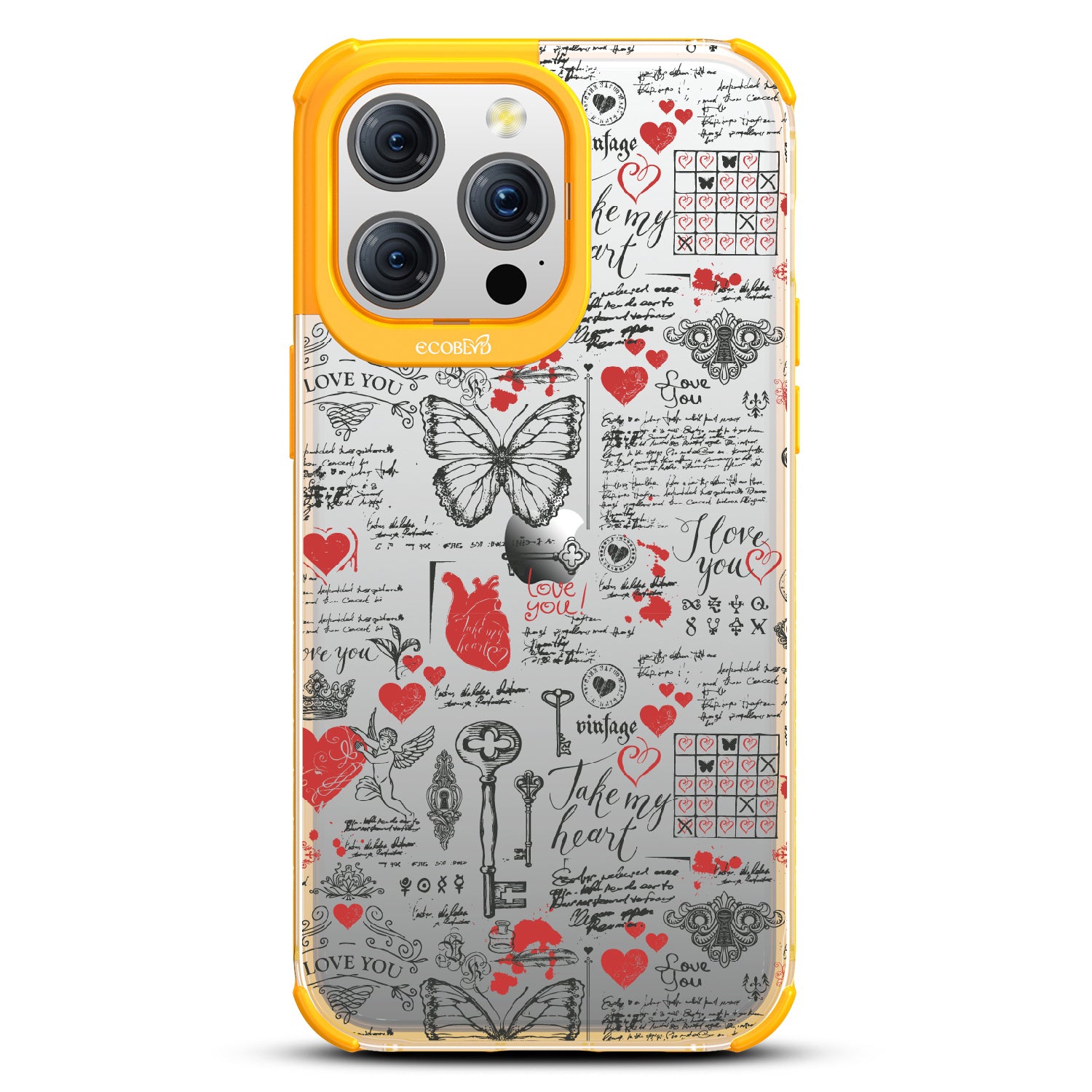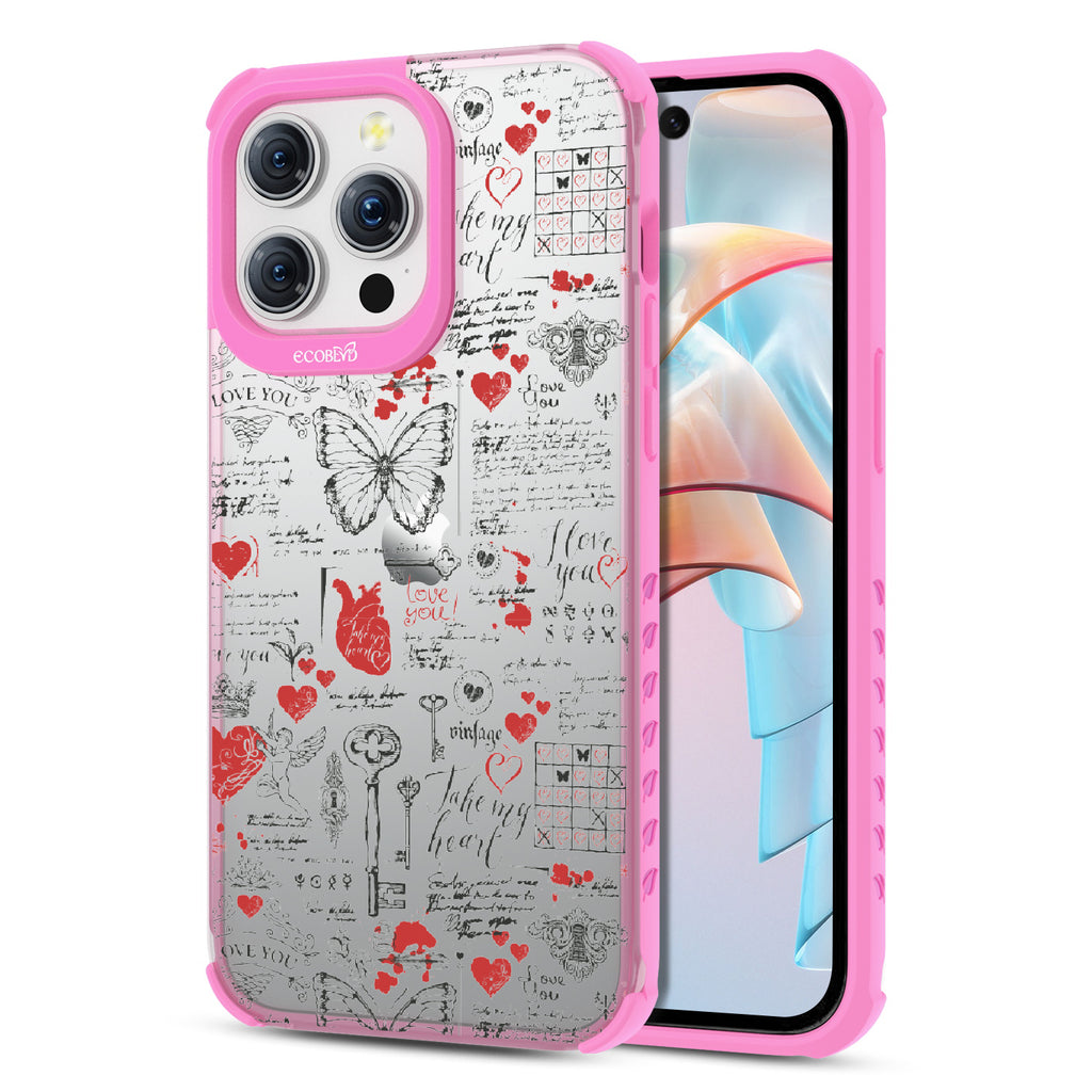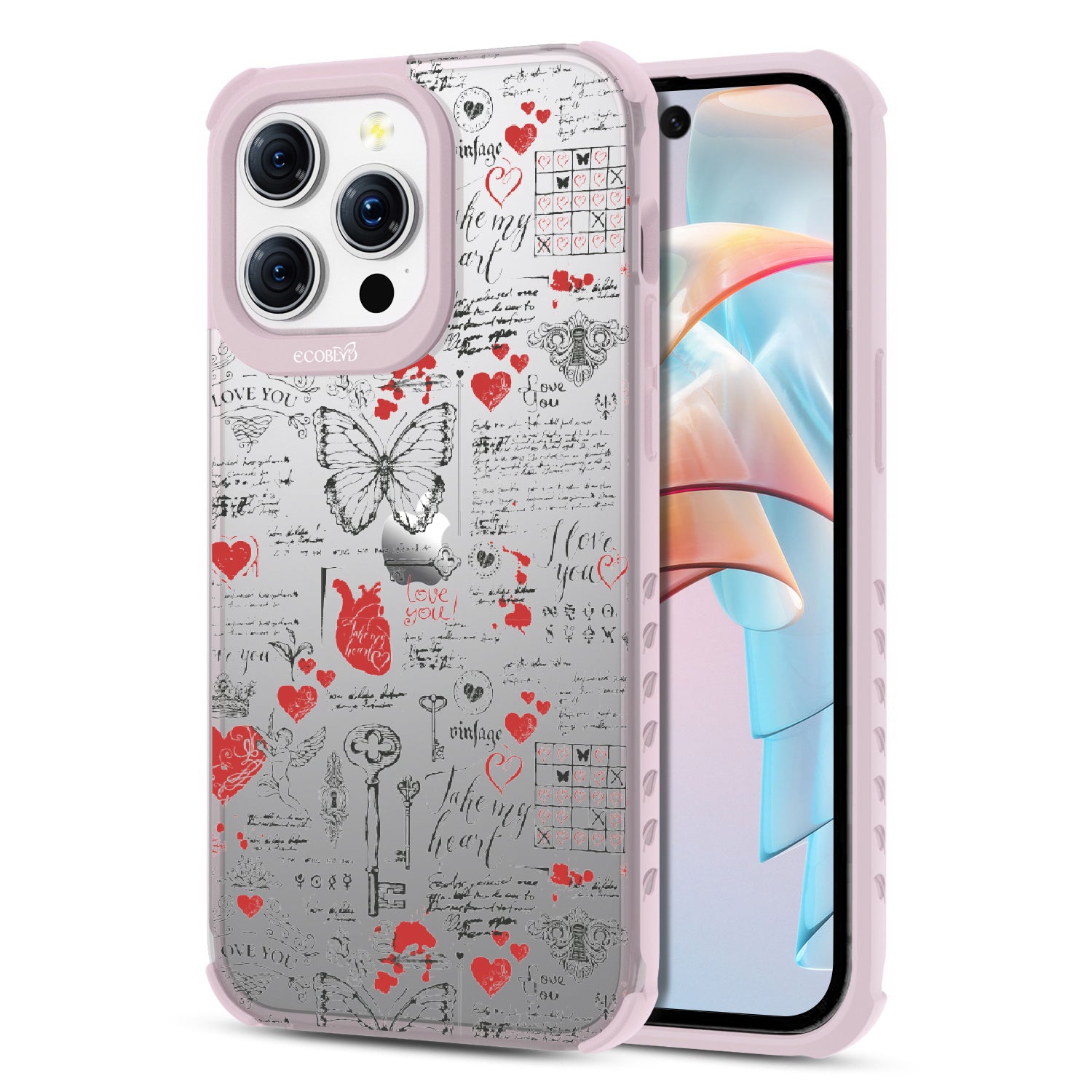 Write your emotions with the Love Notes design on our Laguna clear iPhone 15 Pro Max phone case. This cute scrapbook-style collage, featuring vintage stamps capturing cupid, hearts, butterflies, and phrases like "take my heart" and "I love you," encourages you to express your feelings through written expressions, turning your phone into a cherished collection of love notes.