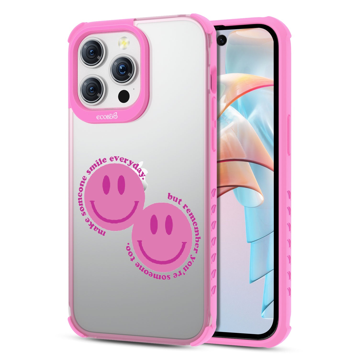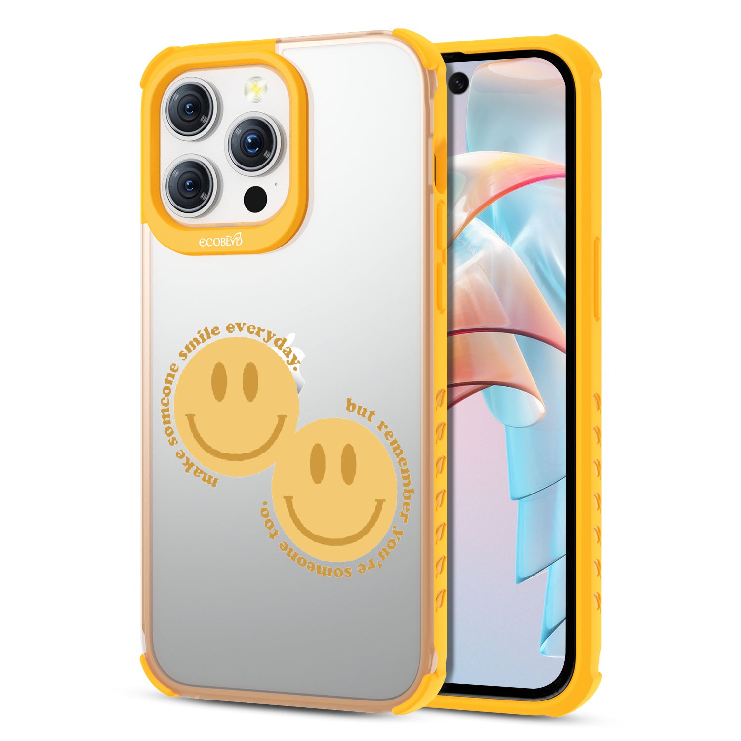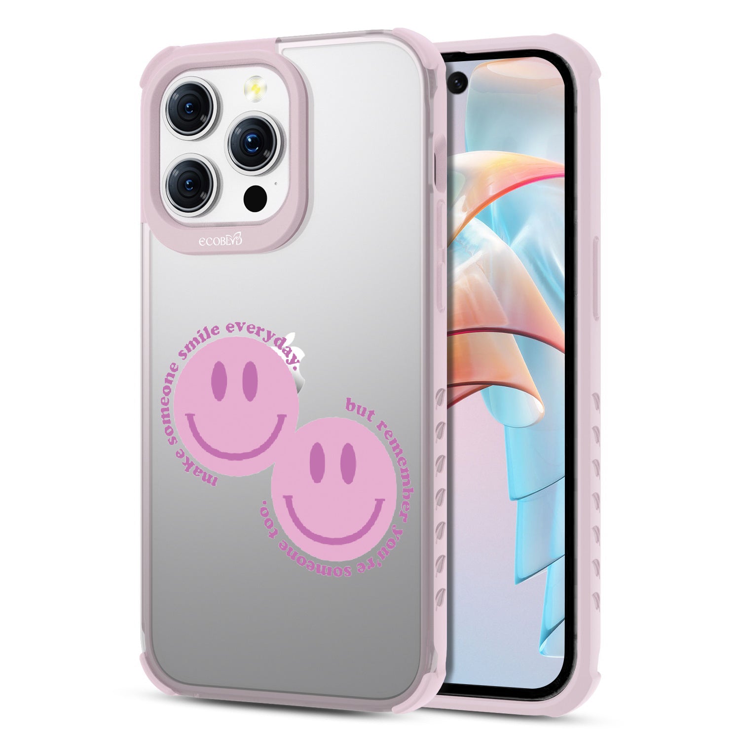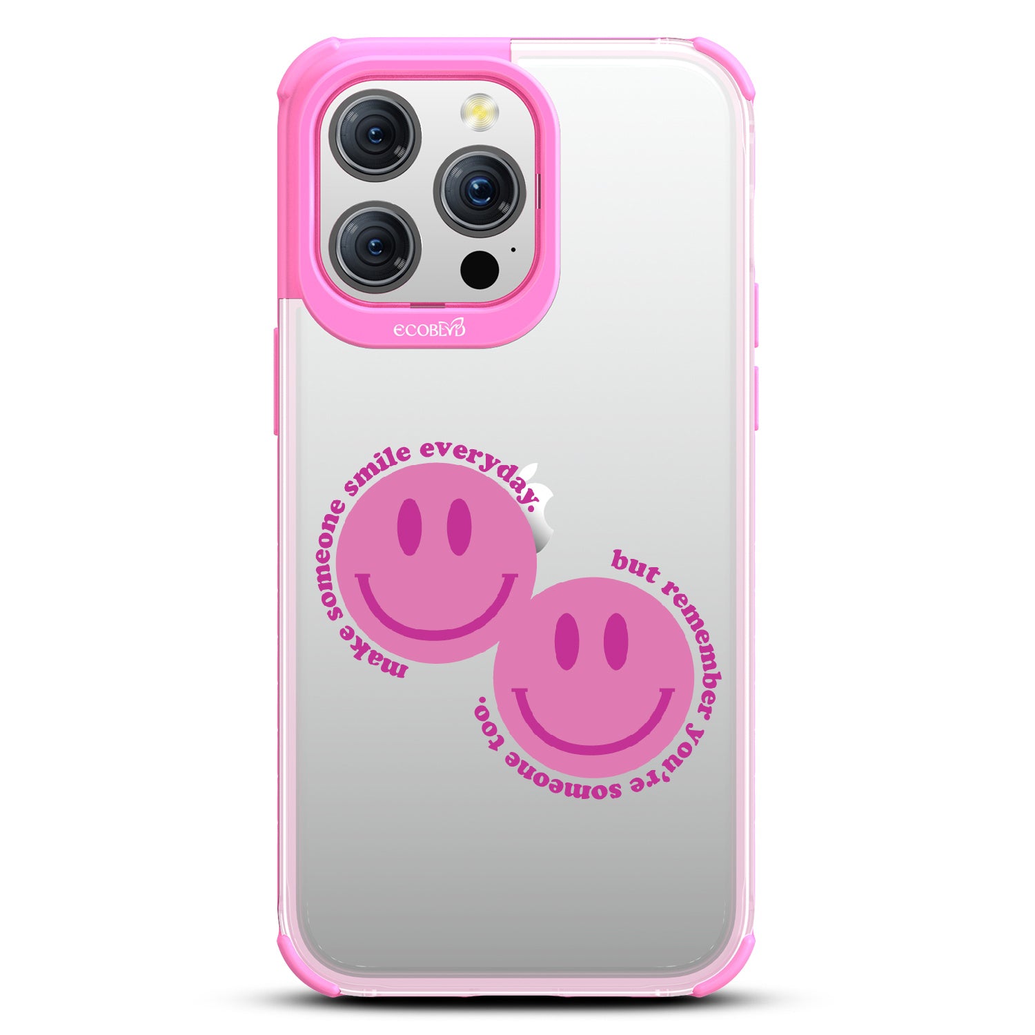 Spread happiness with the Make Someone Smile design on our Laguna clear iPhone 15 Pro Max phone case. Featuring two cheerful smiley faces, this design prompts you to be a source of joy for others. While you make someone else smile, recognize that you too are deserving of moments filled with happiness.