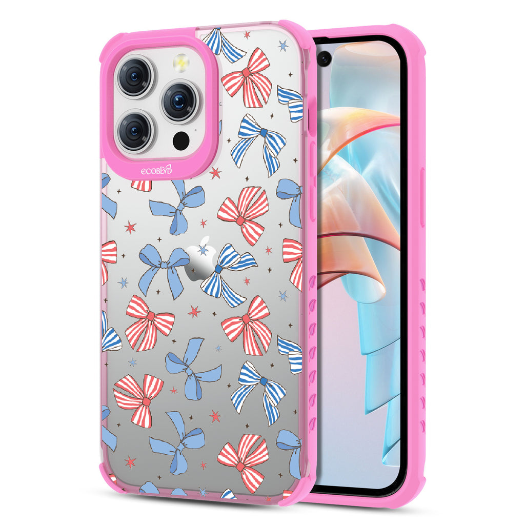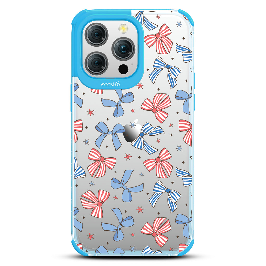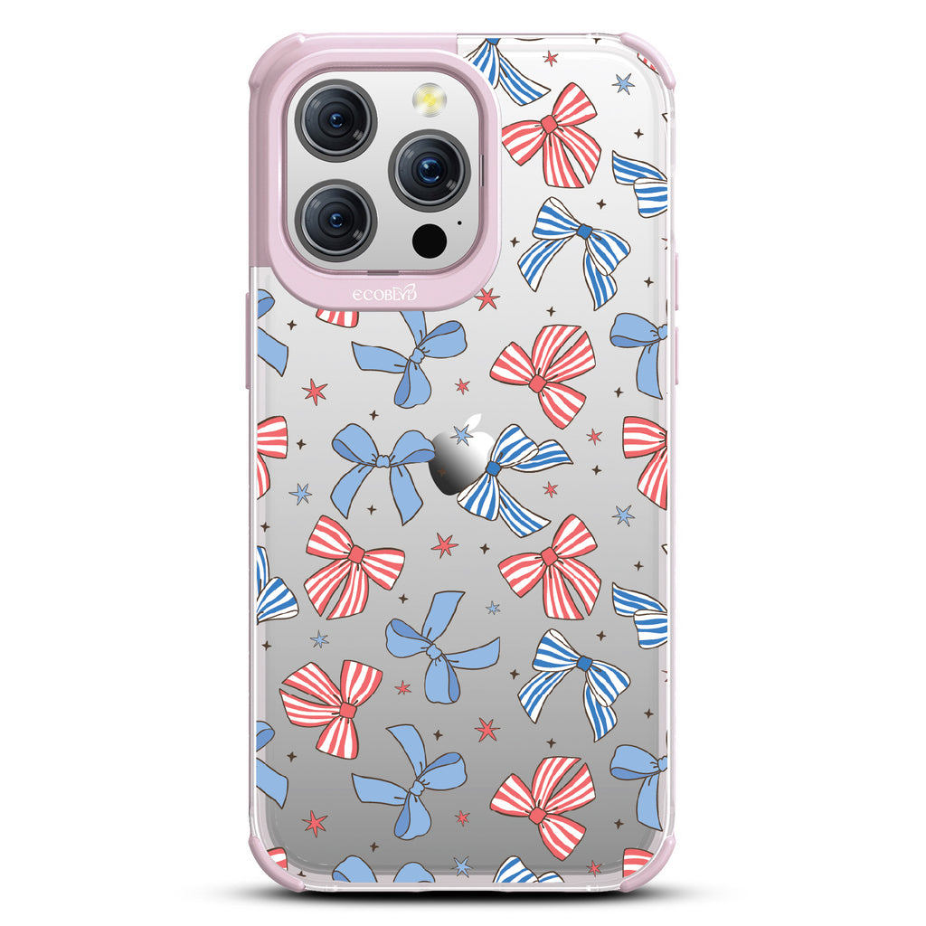 America the bow-tiful! The Miss Americana design on our Laguna clear iPhone 15 Pro Max phone case crowns your phone with patriotic flair. With red, white, and blue bows, this coquette phone case design turns your phone into the belle of the Americana ball.