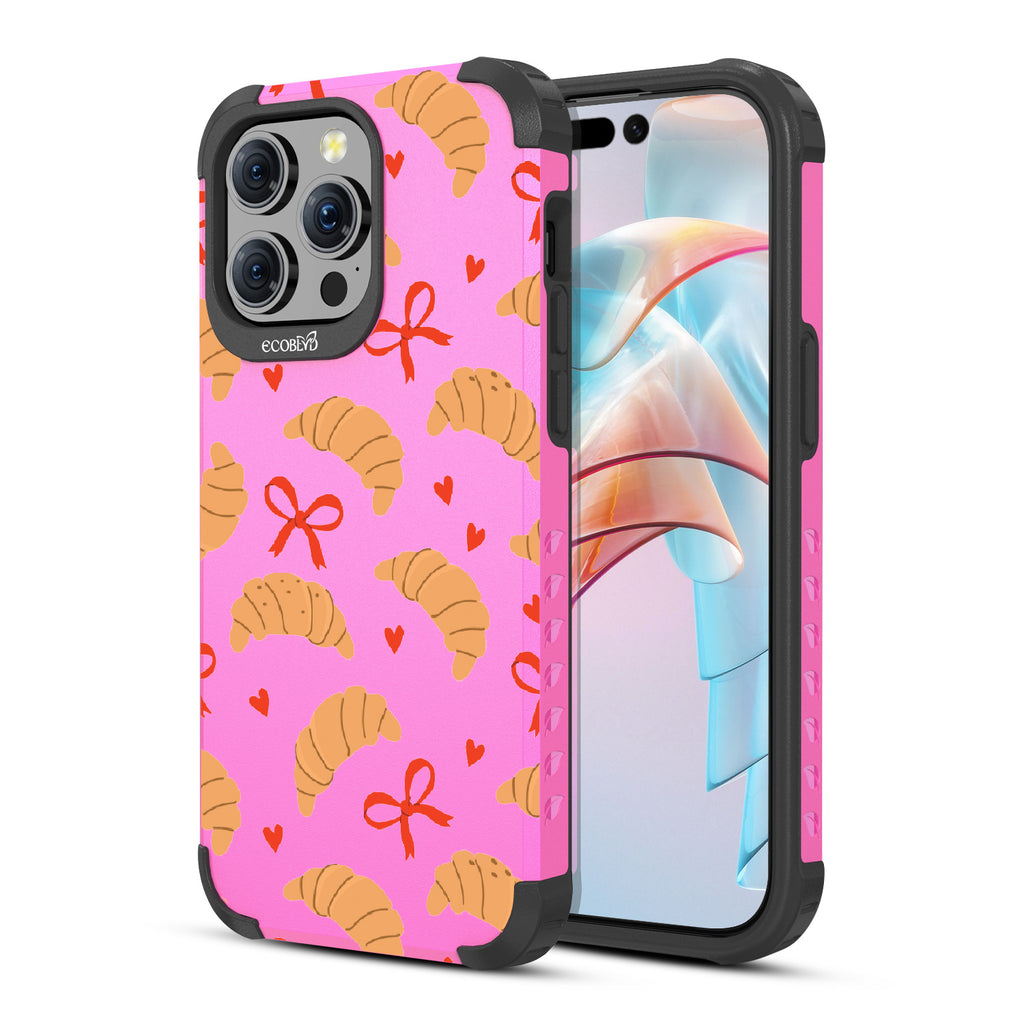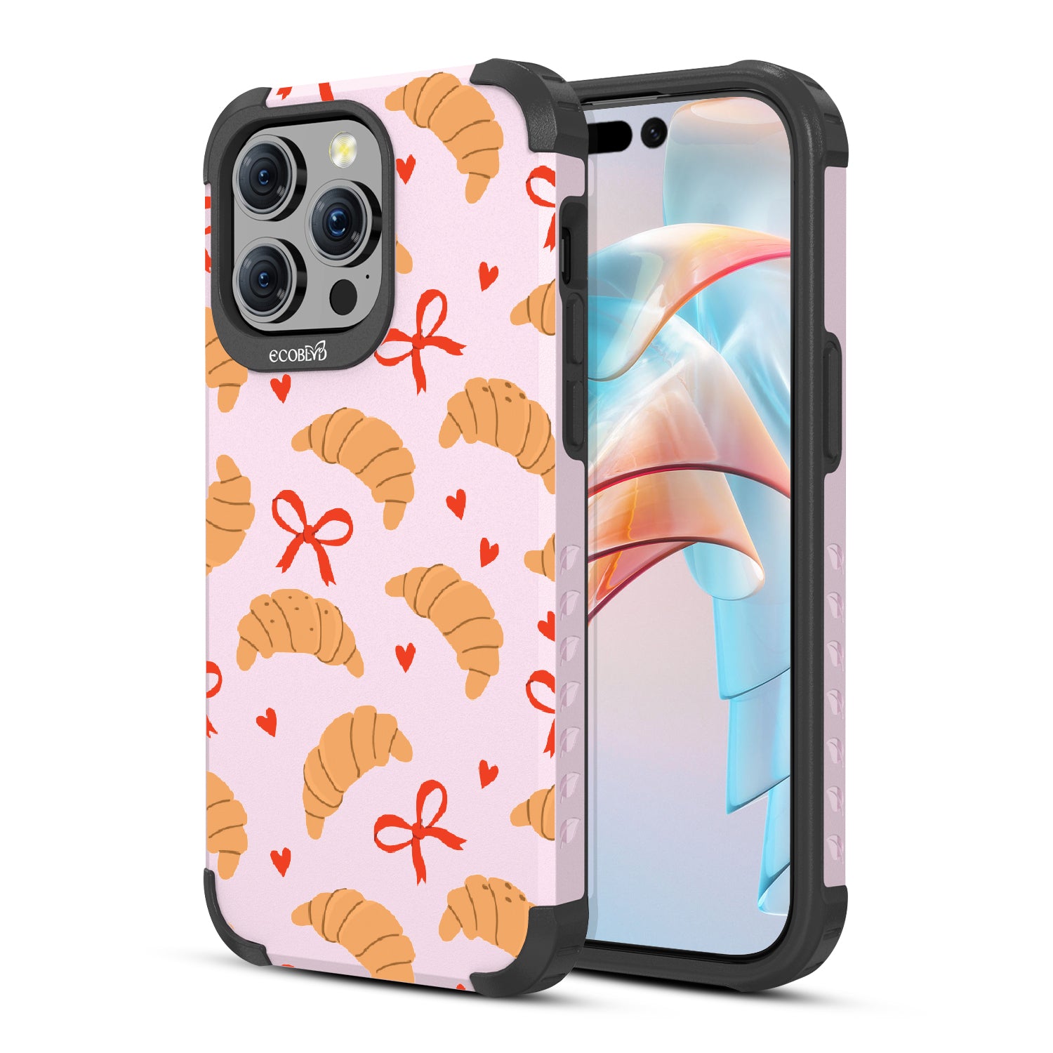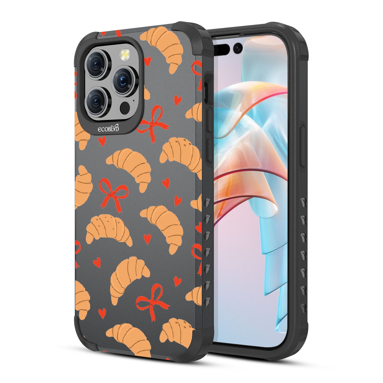 Good taste deserves the perfect recipe like the Croissant Couture design on our Mojave rugged and compostable iPhone 15 Pro Max case! Softly folded croissants, tied with dainty red bows and sprinkled with sweet hearts, evoke the lightness and care of a true delicacy.