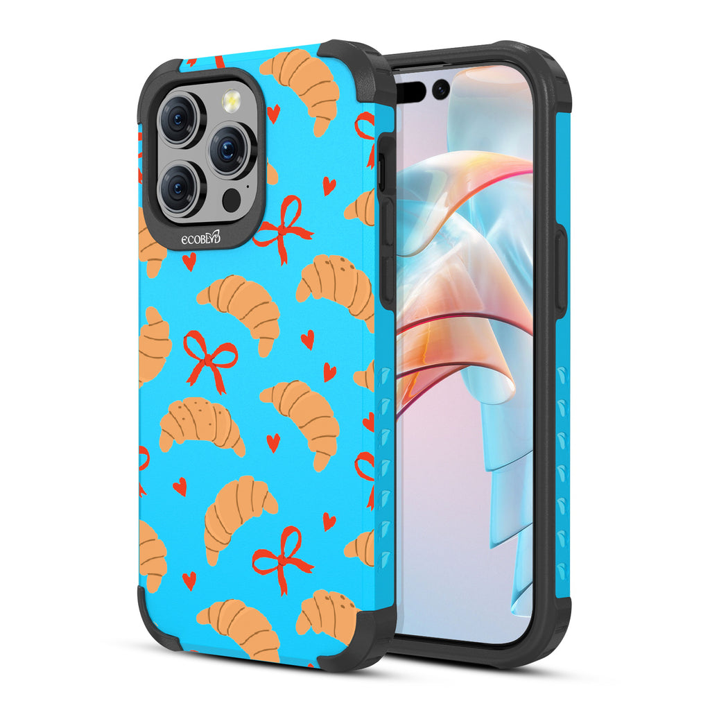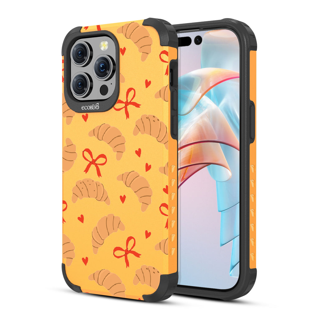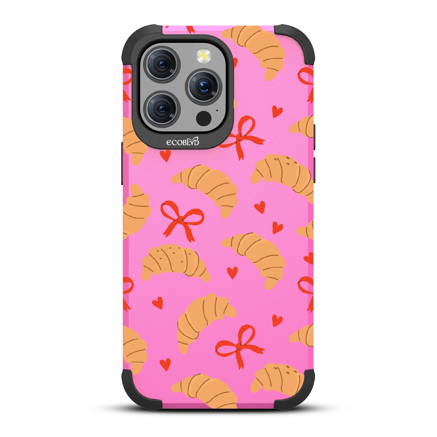 Good taste deserves the perfect recipe like the Croissant Couture design on our Mojave rugged and compostable iPhone 15 Pro Max case! Softly folded croissants, tied with dainty red bows and sprinkled with sweet hearts, evoke the lightness and care of a true delicacy.