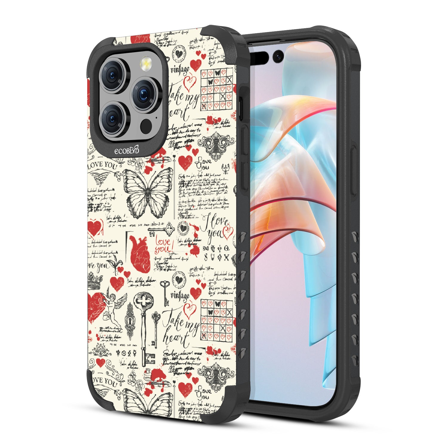 Write your emotions with the Love Notes design on our Mojave rugged and compostable iPhone 15 Pro Max MagSafe case. This cute scrapbook-style collage, featuring vintage stamps capturing cupid, hearts, butterflies, and phrases like "take my heart" and "I love you," encourages you to express your feelings through written expressions, turning your phone into a cherished collection of love notes.
