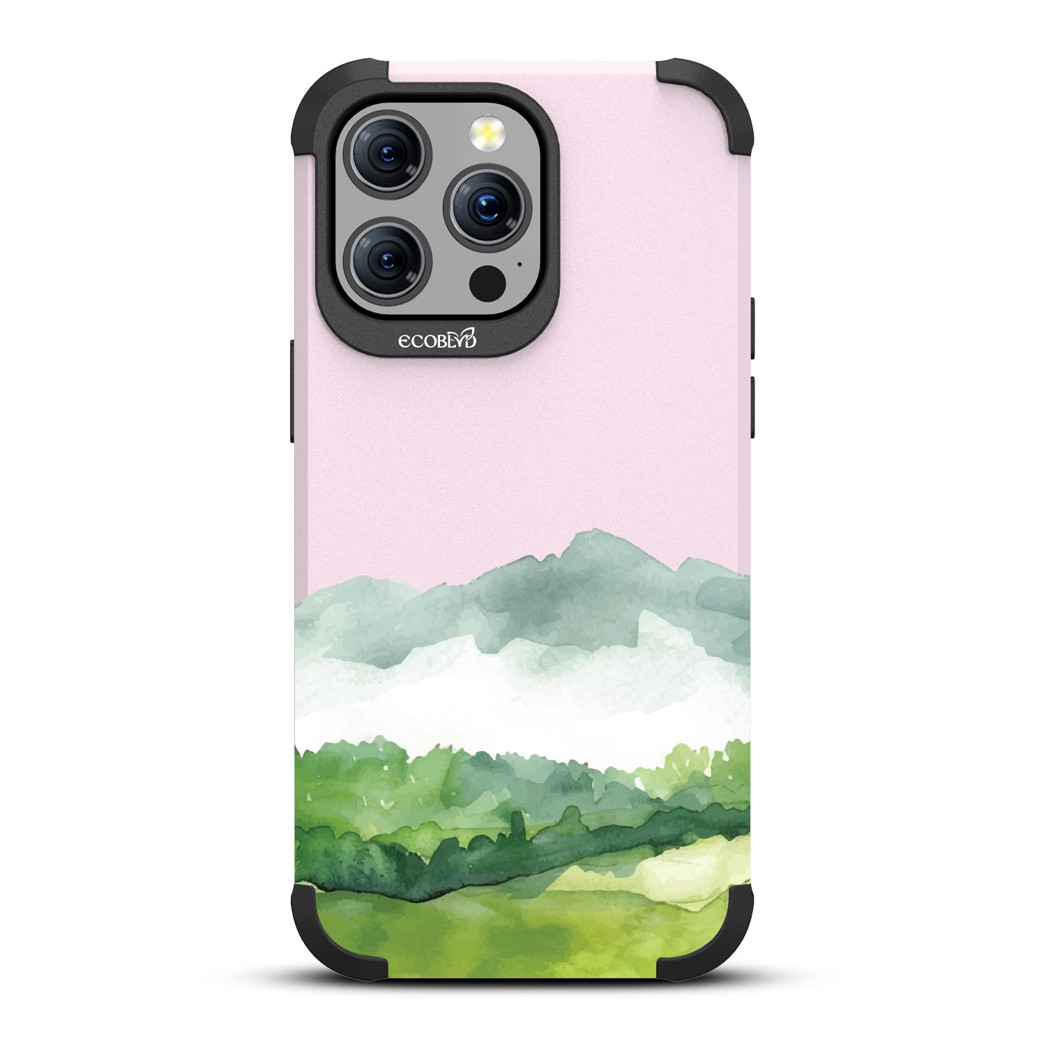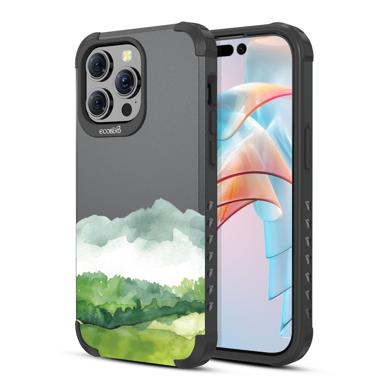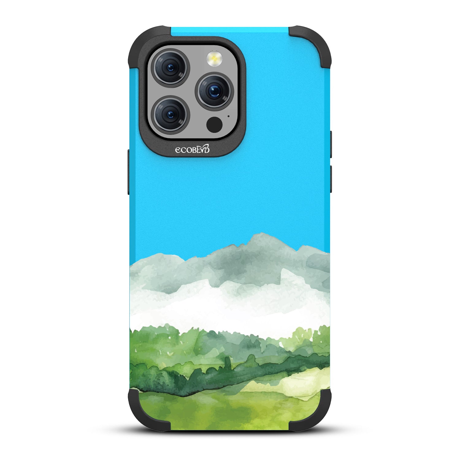 The view is endless, just like the possibilities. The Open Horizon design on our Mojave rugged and compostable iPhone 15 Pro Max case layers soft washes of green and misty blue, stretching like rolling hills beneath an open sky. The watercolor effect creates a serene, boundless landscape, a quiet reminder that there’s always more to explore.