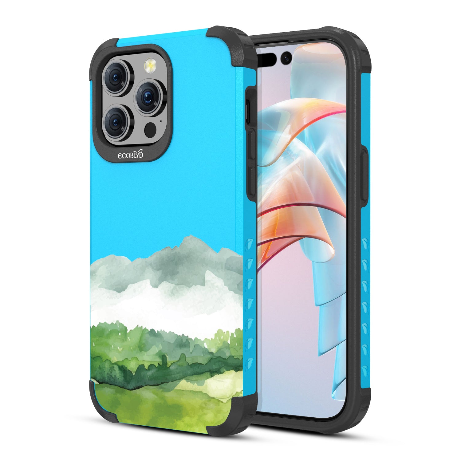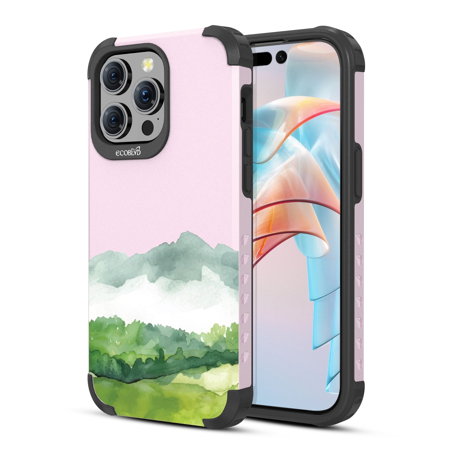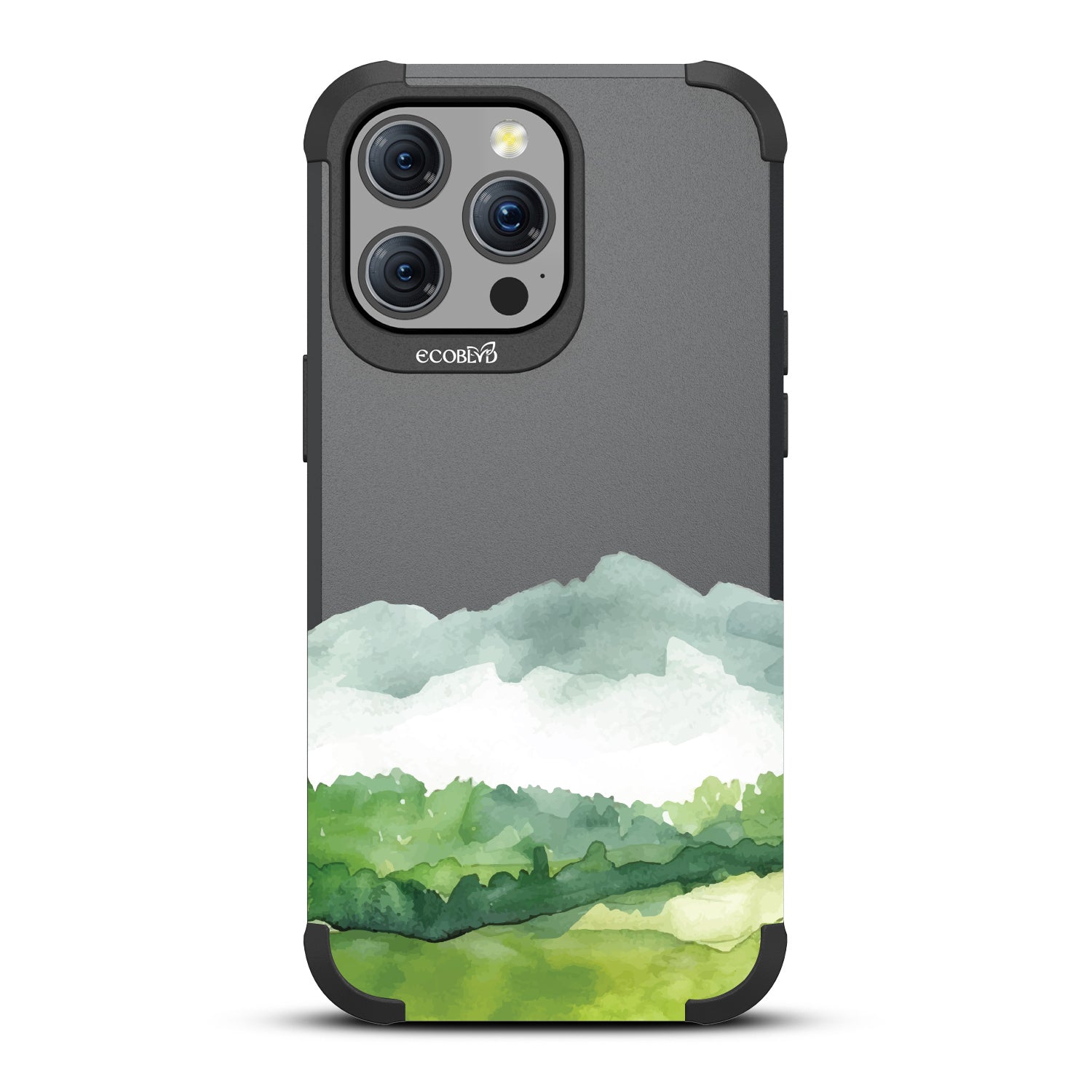 The view is endless, just like the possibilities. The Open Horizon design on our Mojave rugged and compostable iPhone 15 Pro Max case layers soft washes of green and misty blue, stretching like rolling hills beneath an open sky. The watercolor effect creates a serene, boundless landscape, a quiet reminder that there’s always more to explore.