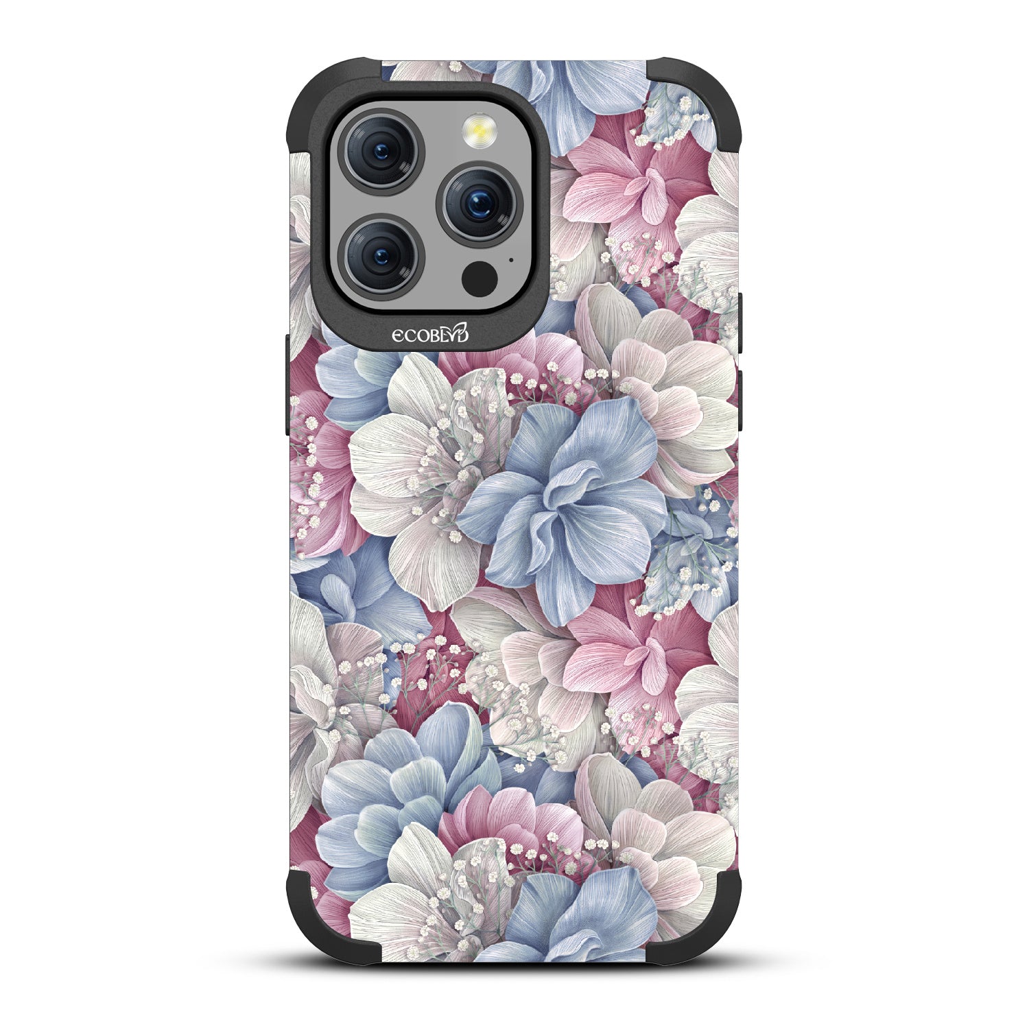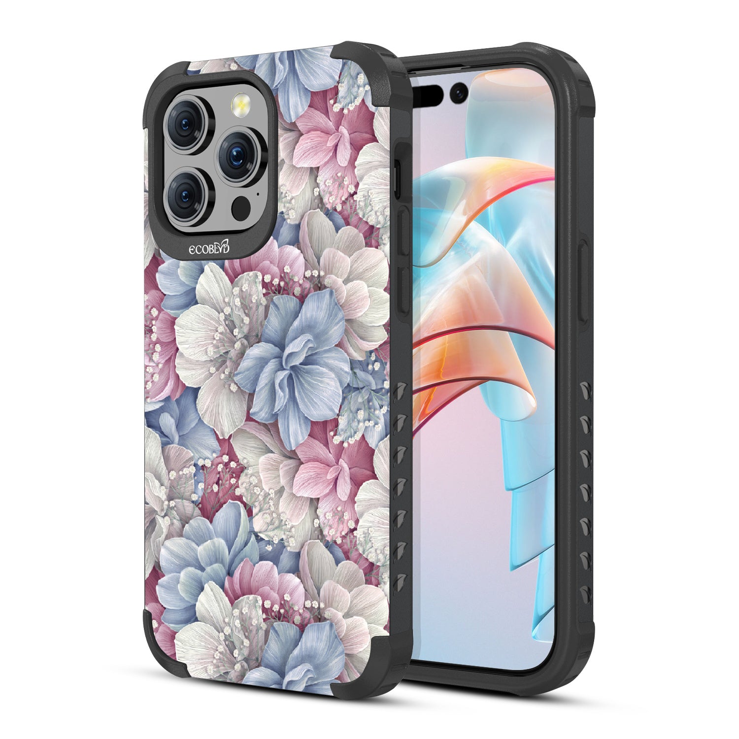 The Petals & Pearls design on our Mojave rugged and compostable iPhone 15 Pro Max case is like a melody of spring, its pastel colors swaying like a sweet tune and the water droplets on the petals ringing like pearls, harmoniously reflecting the blooming beauty of the season. Available in our bold Midnight Black colorway.