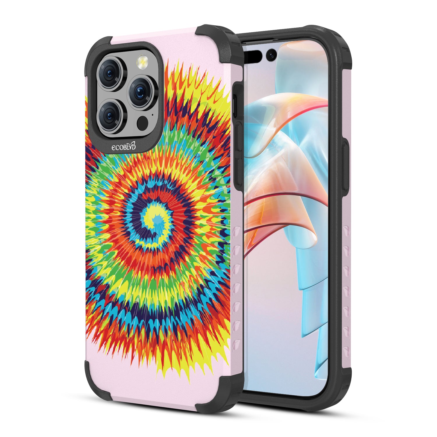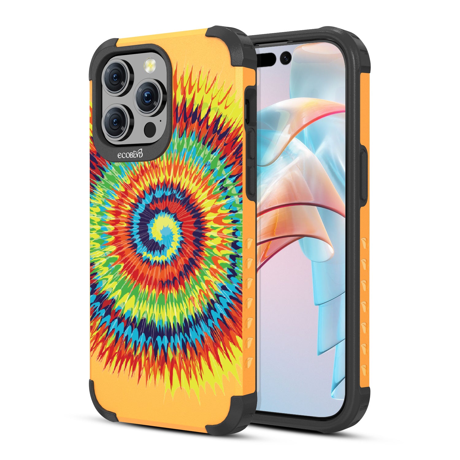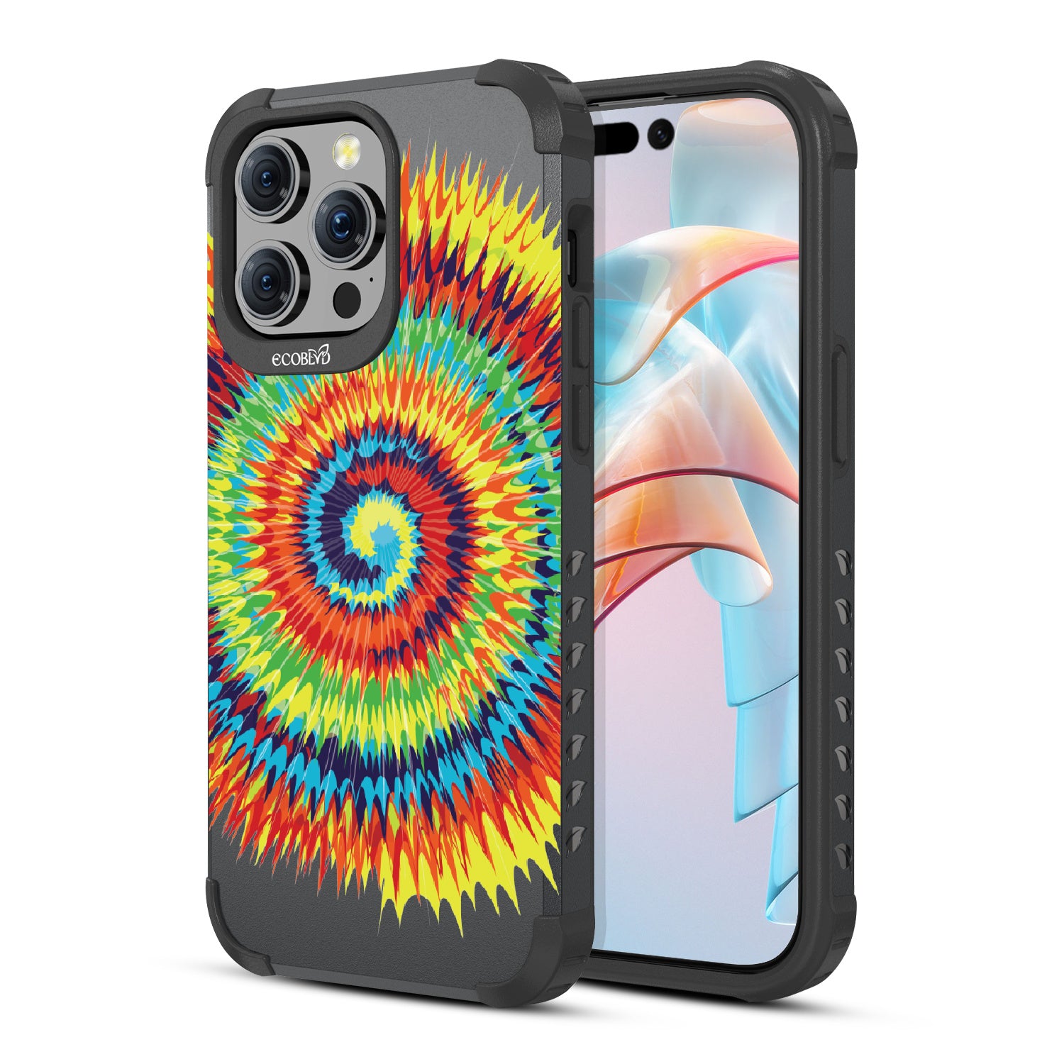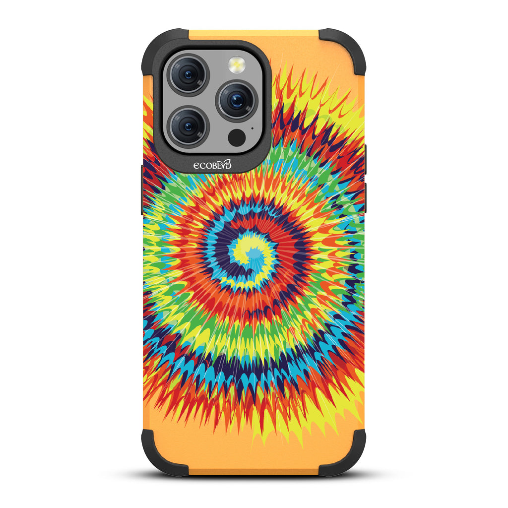 Bringing back the summer days of backyard BBQs, beach days, and fun in the sun, the Tie Dye design on our Mojave rugged and compostable iPhone 15 Pro Max case has a retro rainbow swirl pattern giving your phone and style an eye-catching twist.