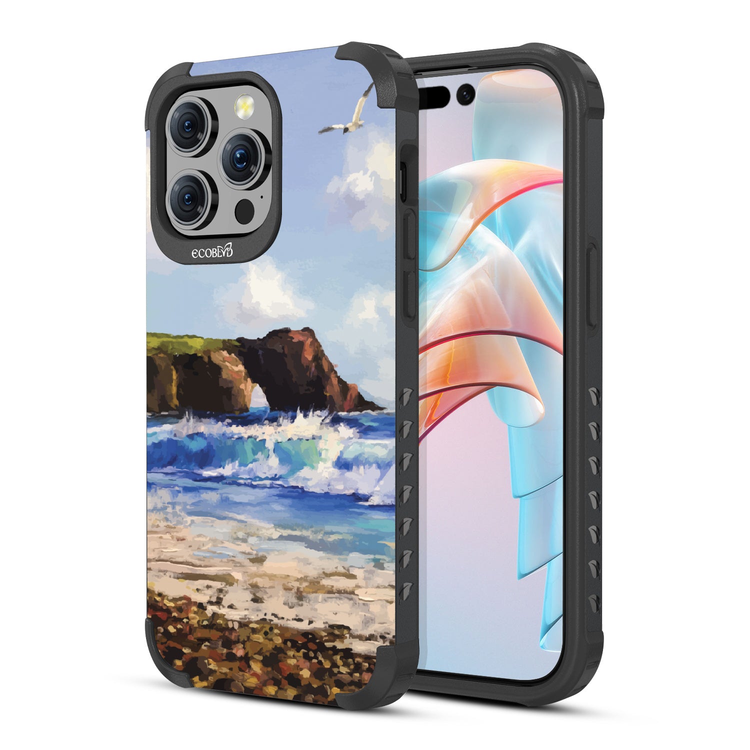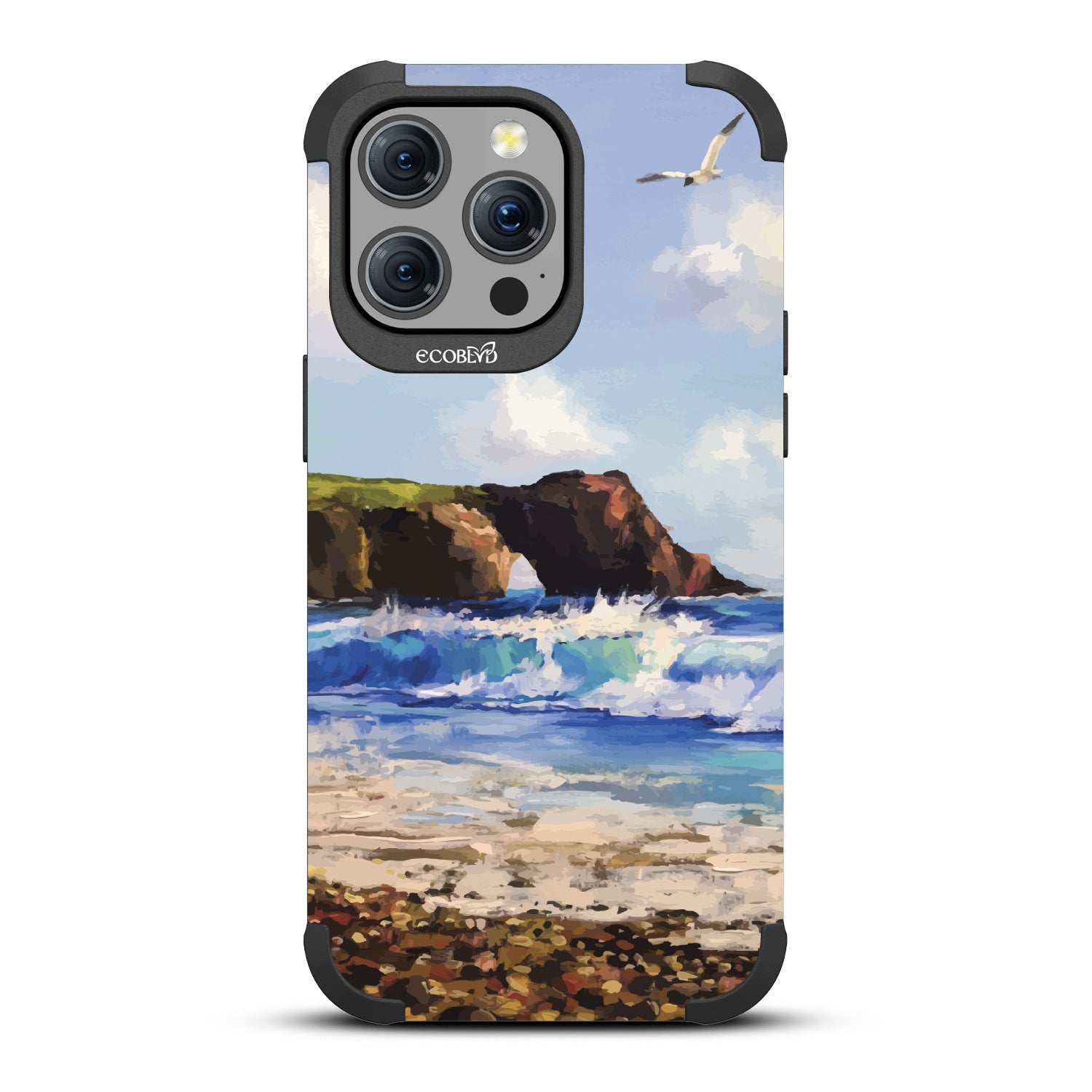 The calm before…. The Cliffhanger design on our Mojave rugged and compostable iPhone 15 Pro Max case holds a moment of painted suspense—brushed cliffs, churning tides, and a palette that builds to the brink. A story captured at its turning point.