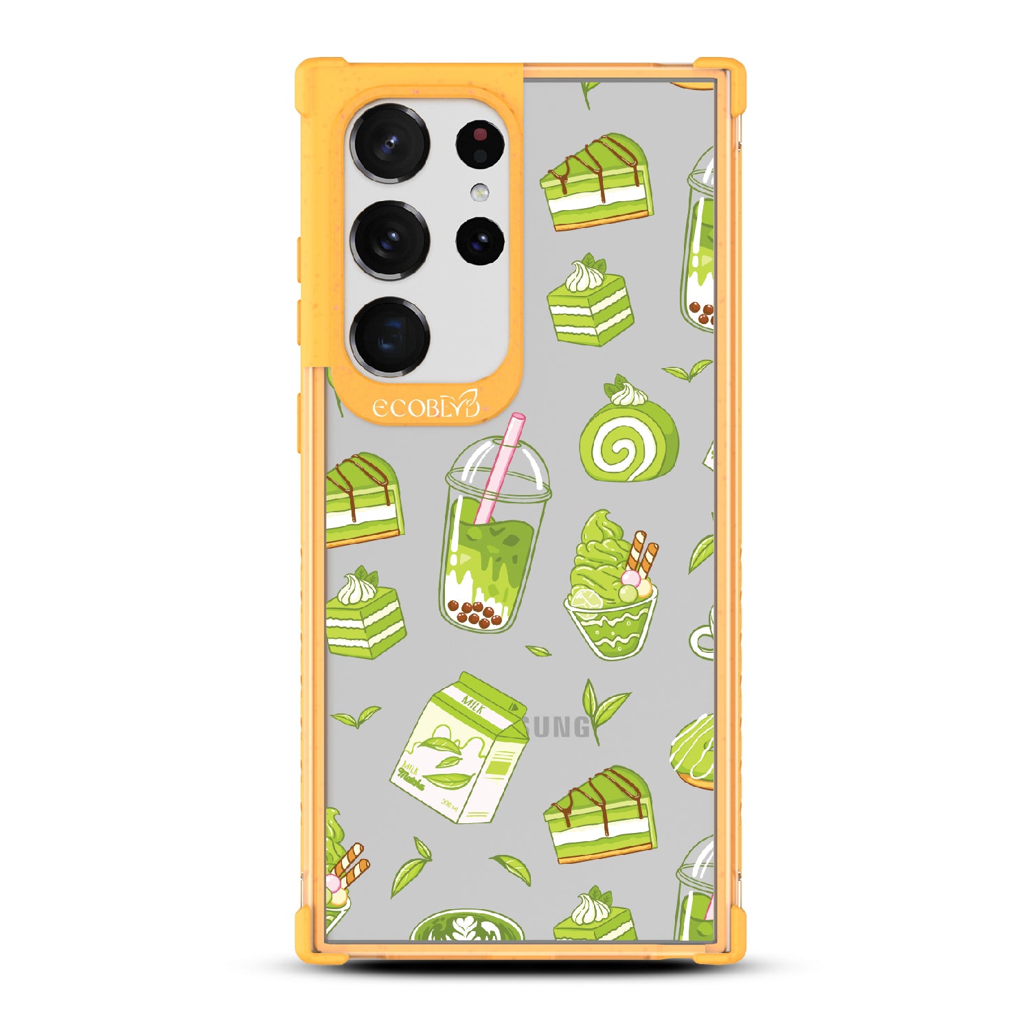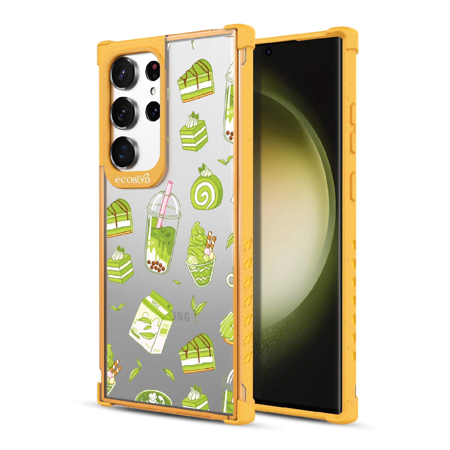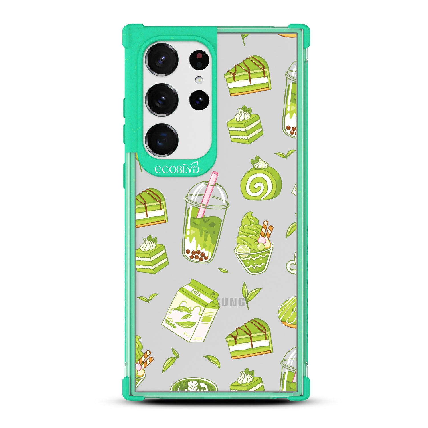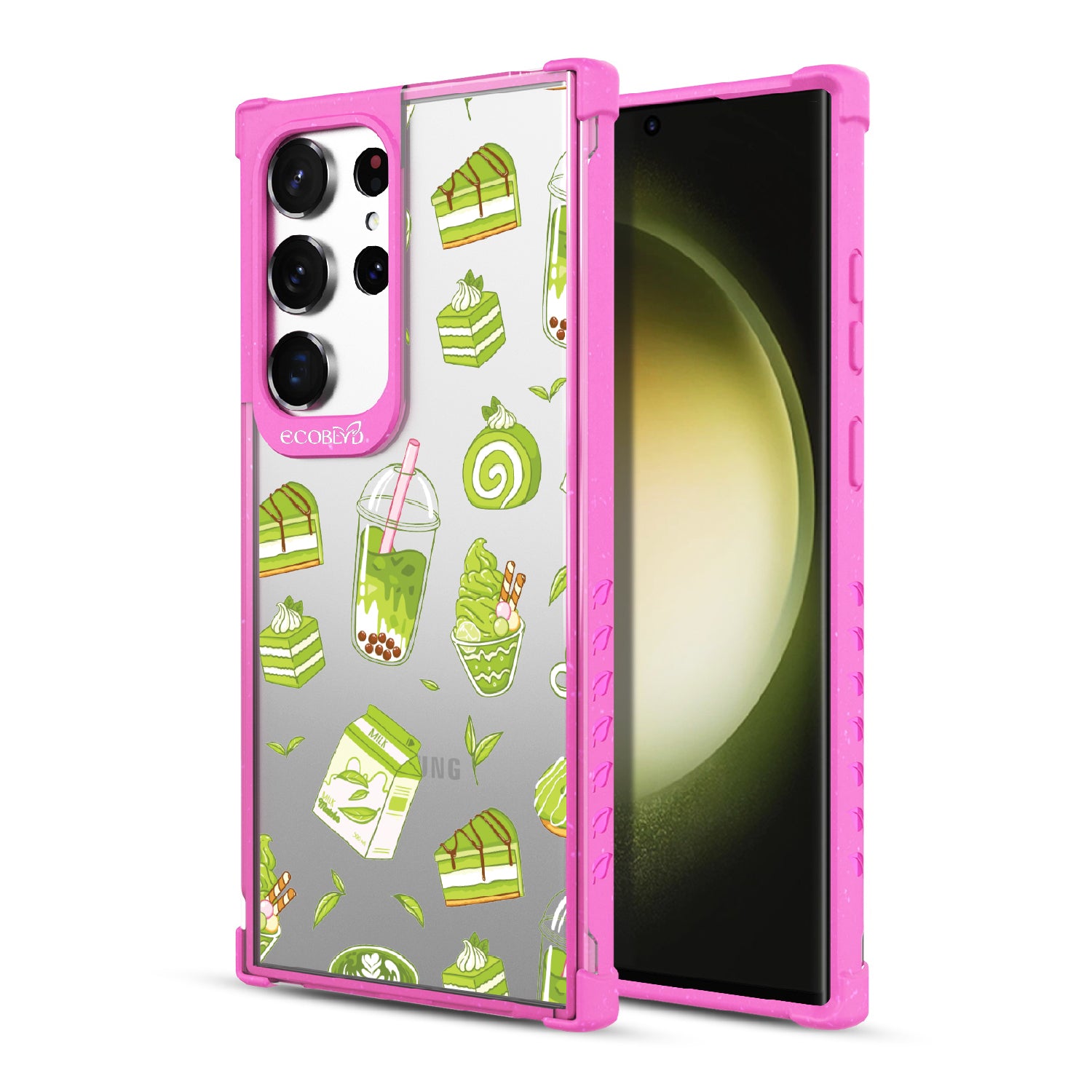 Ice cream and boba, cake, milk, and so matcha more! Overflowing with matcha flavor, this design on our Laguna clear Galaxy S23 Ultra case! brings you a perfect blend of your favorite green treats. Because who ever said there was such a thing as too much matcha?