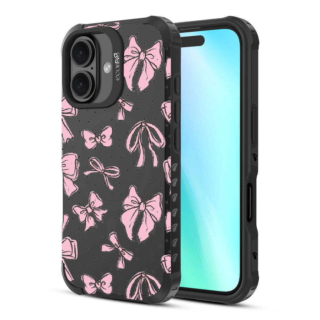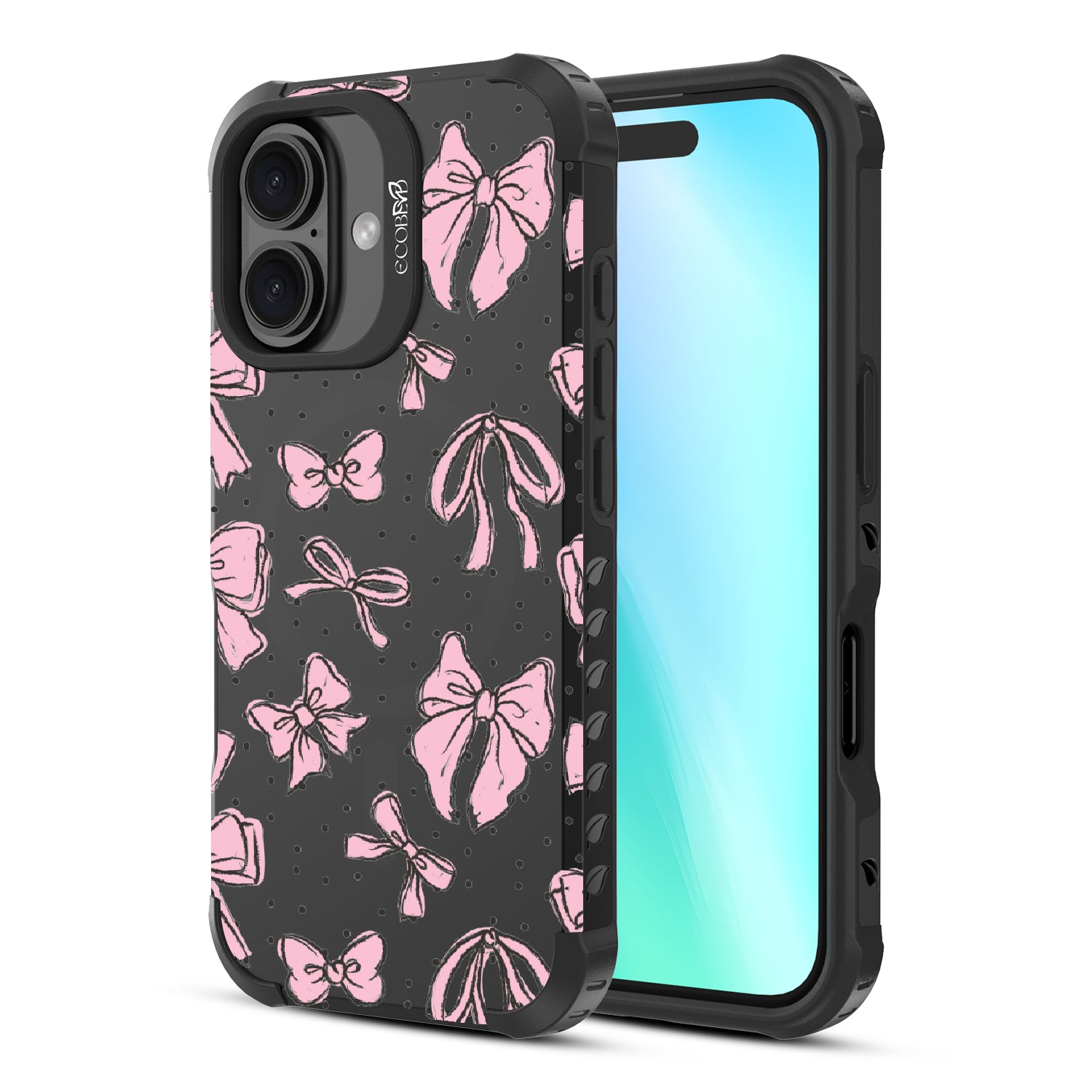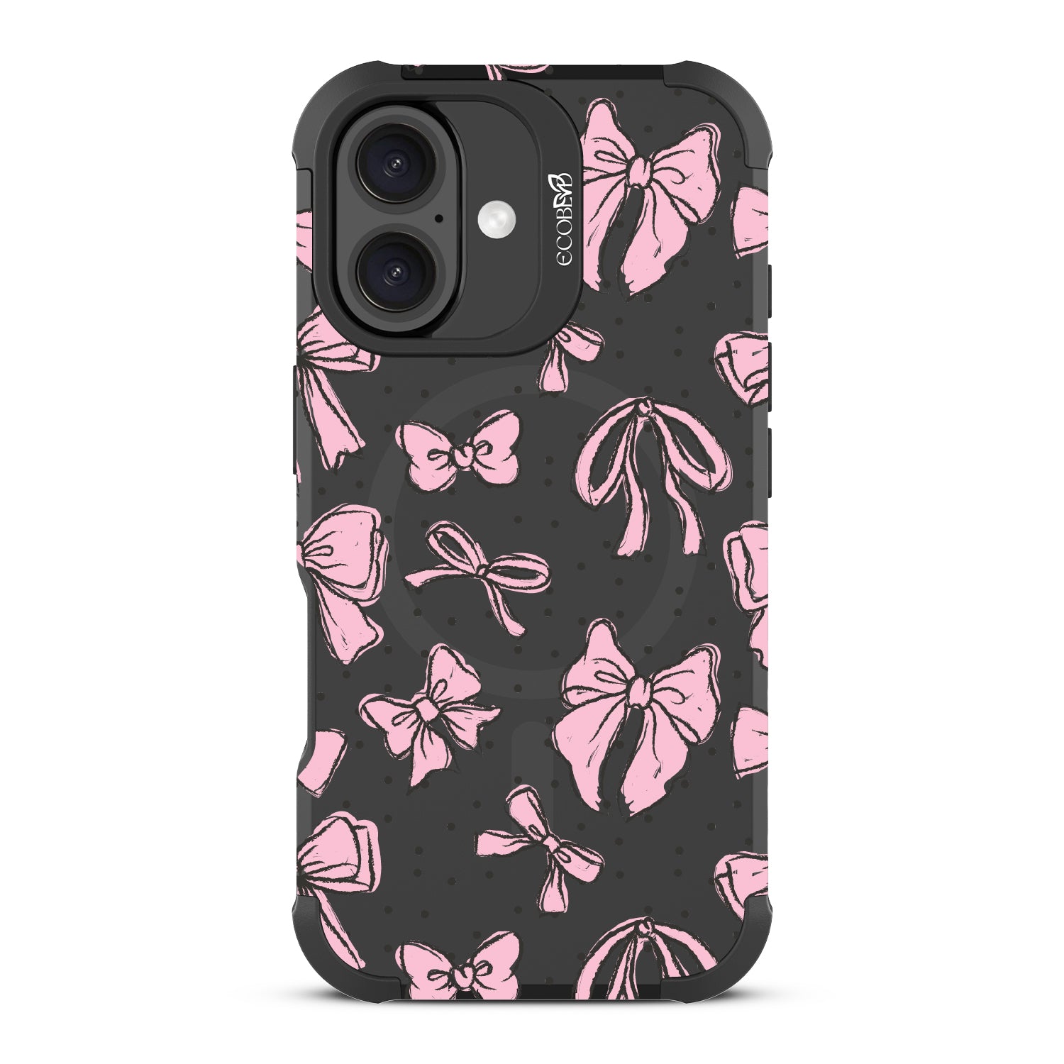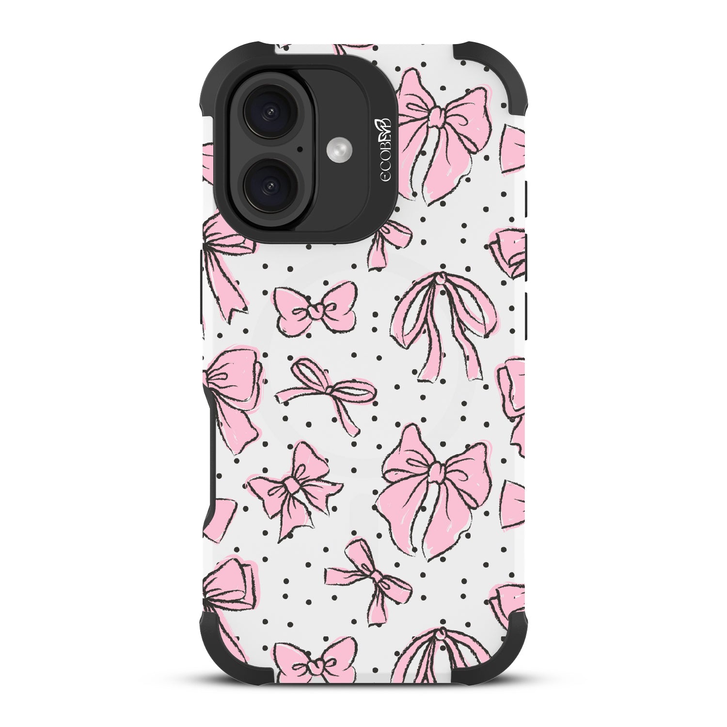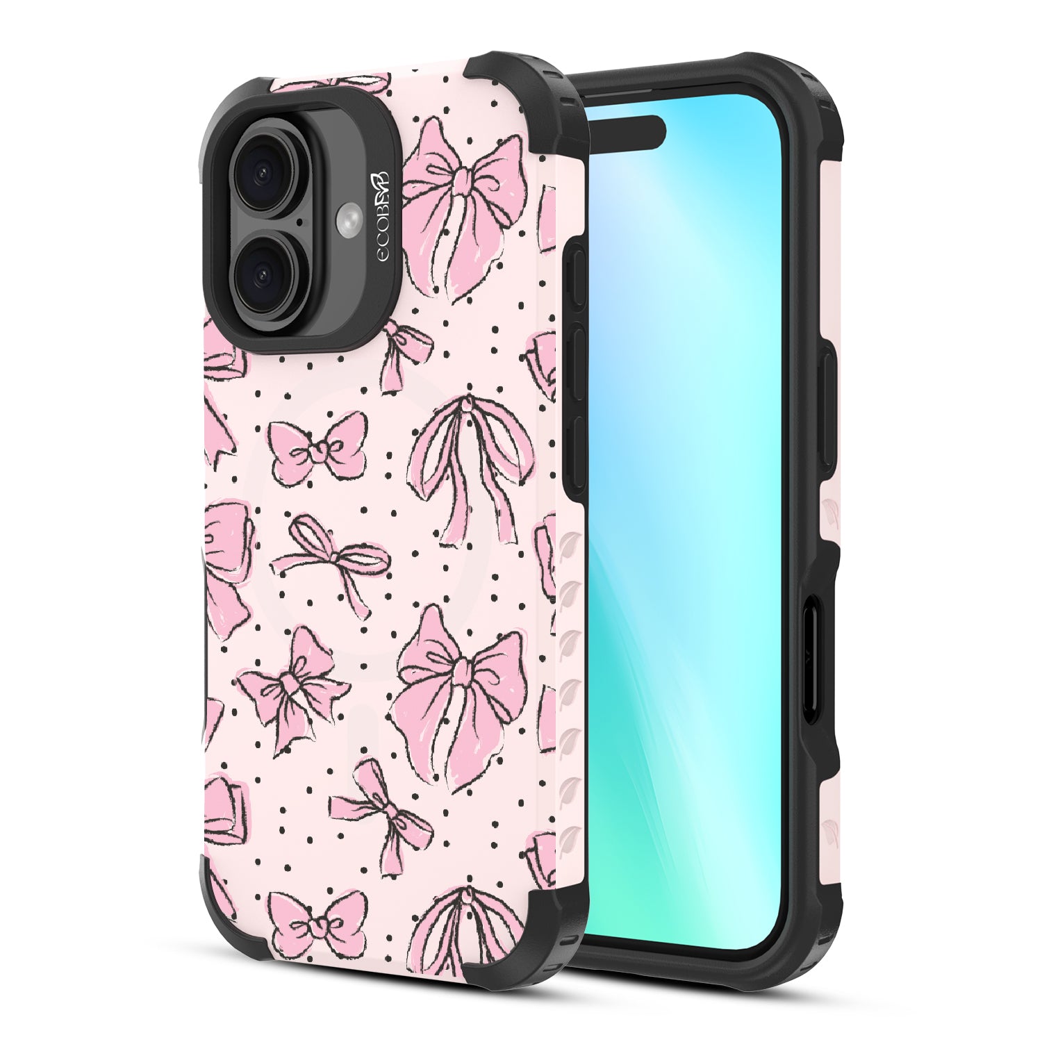 Enter your Soft Girl Era with this bow-tiful design on our Reforge rugged iPhone 16 case, where coquette pink bows and black polka dots team up to give your device a dose of girly glam. Surround yourself with girl power, radiating kindness, love, and gentle energy. Let your phone be a reminder of the unbreakable ties that bind us together.