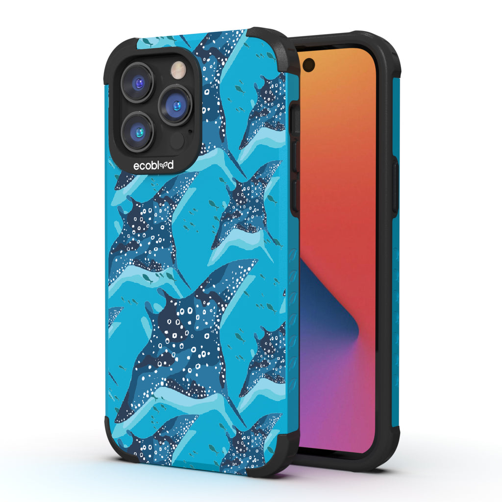 Sleek and stealthy, the Sting Ray design on our Mojave rugged and compostable iPhone 14 Pro Max phone case showcases these marine marvels as they glide effortlessly through the ocean depths. The stingrays streamlined bodies and distinctive spotted patterns capture the fluid grace of the sea’s most agile navigators.