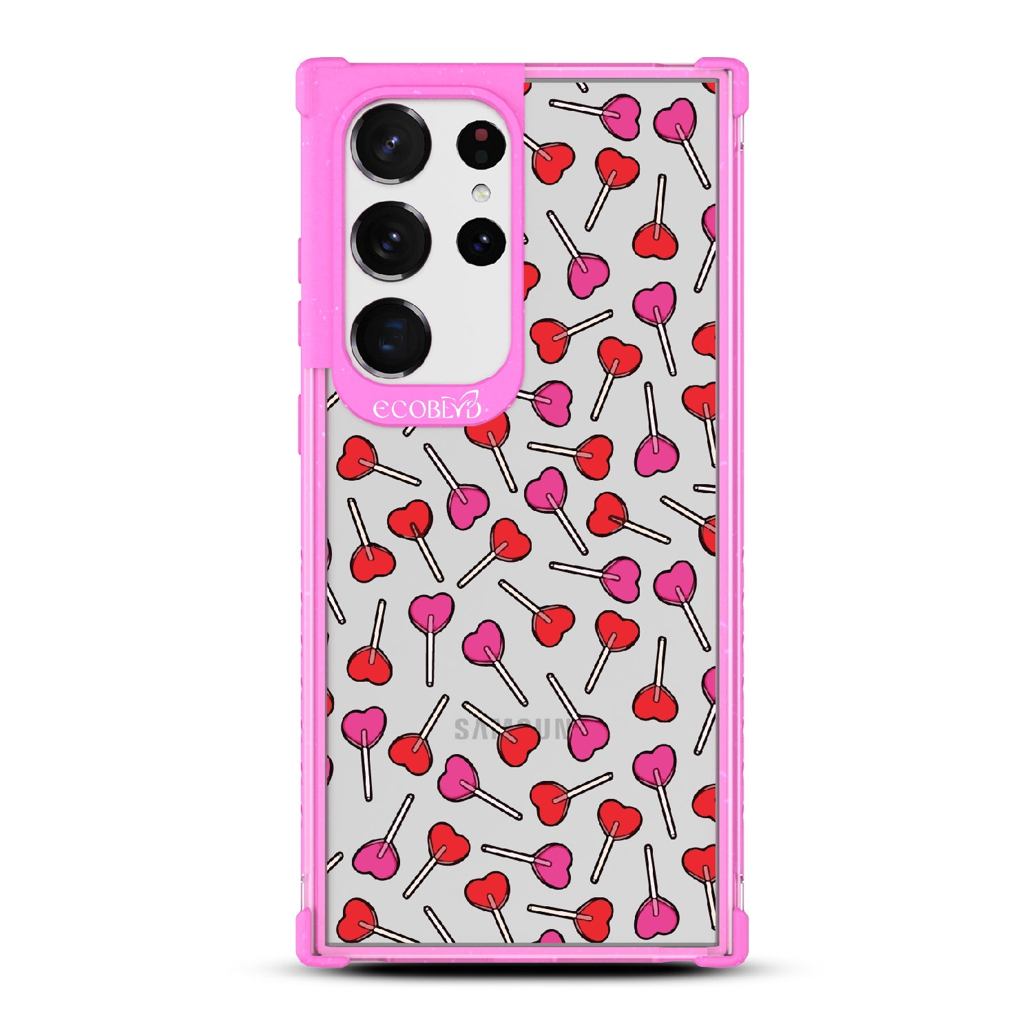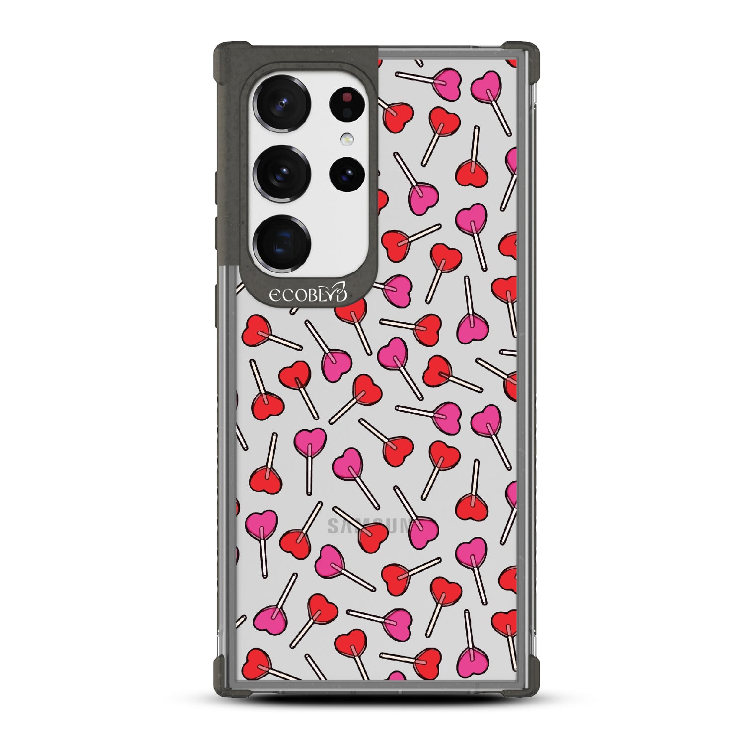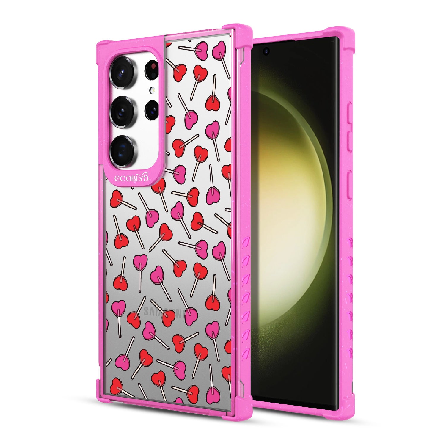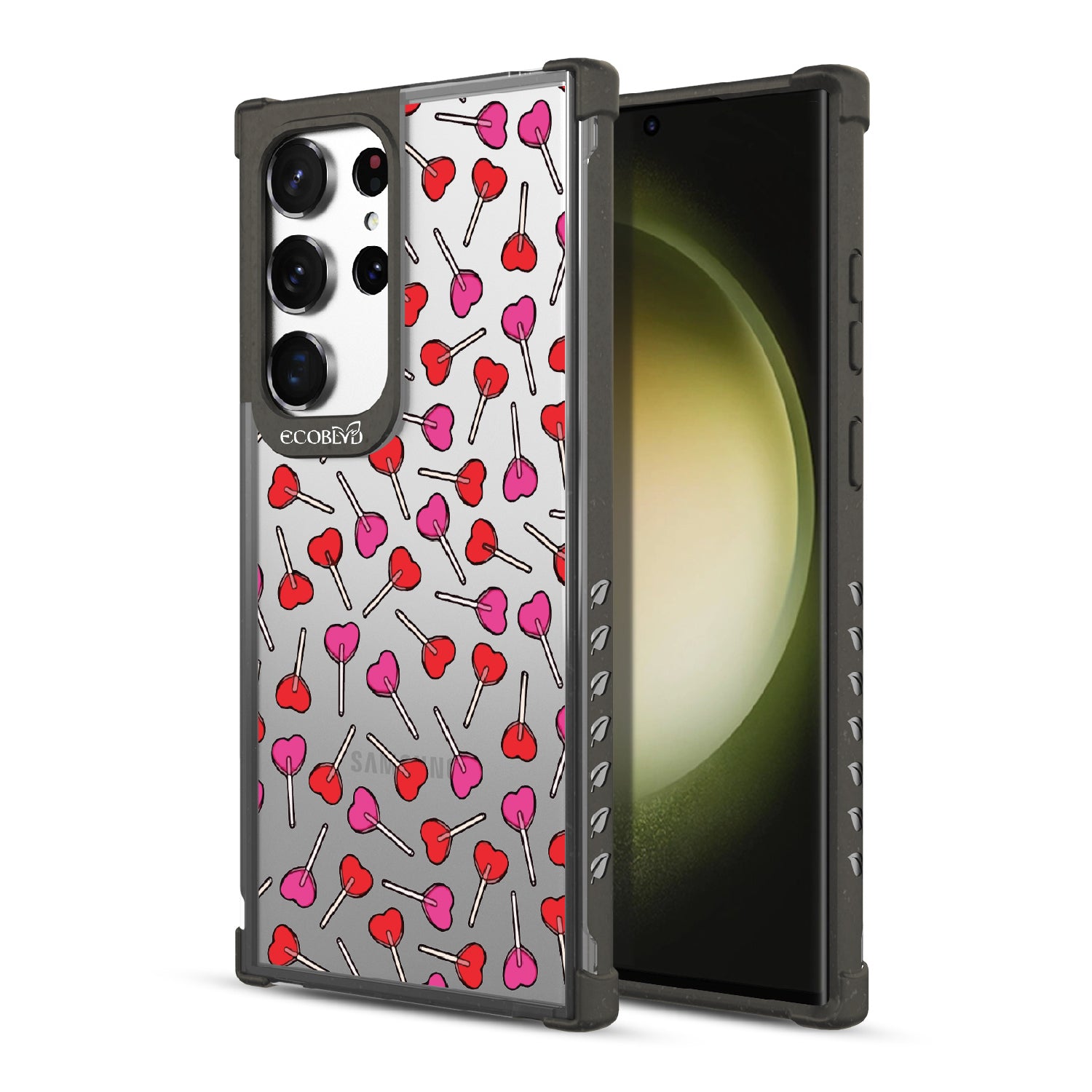 Satisfy your romantic cravings with the Sucker For You design on our Laguna clear Galaxy S23 Ultra case. As sweet heart-shaped lollipops add more sugar to your phone as a delightful surrender, making it a delectable expression of your affection.