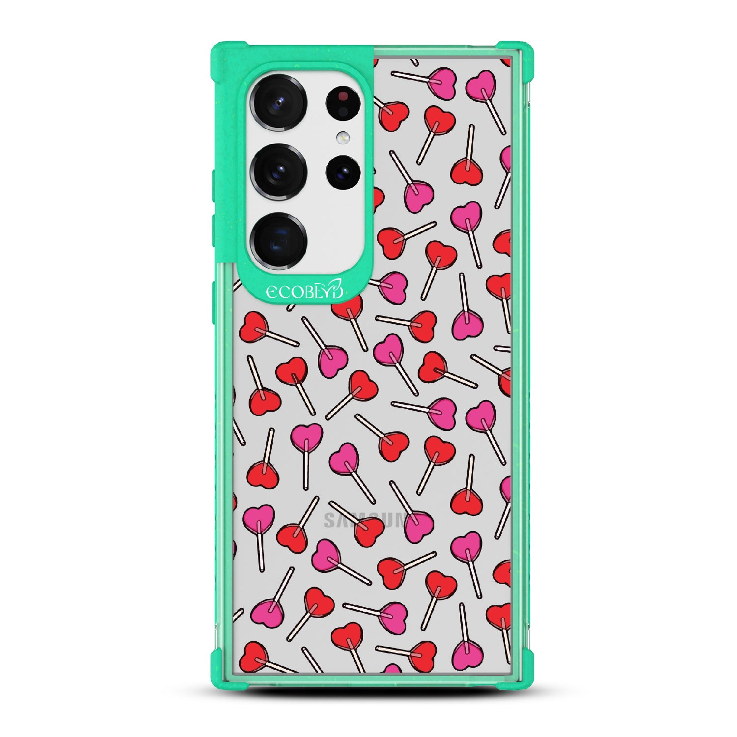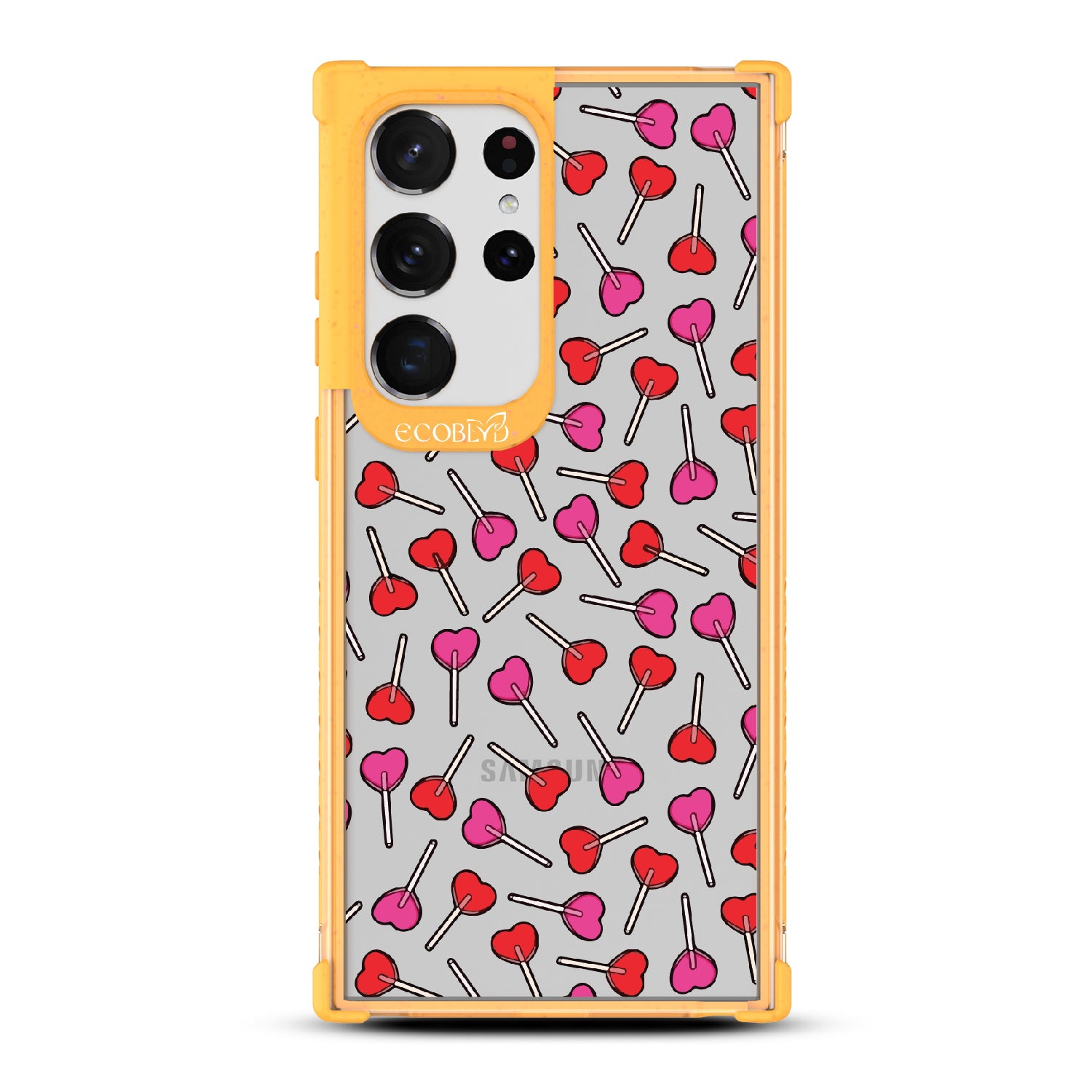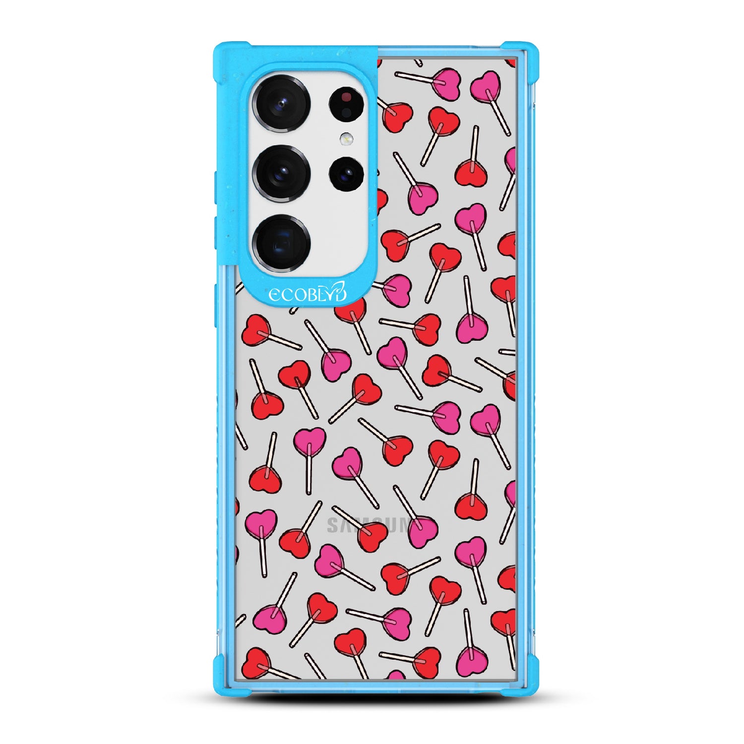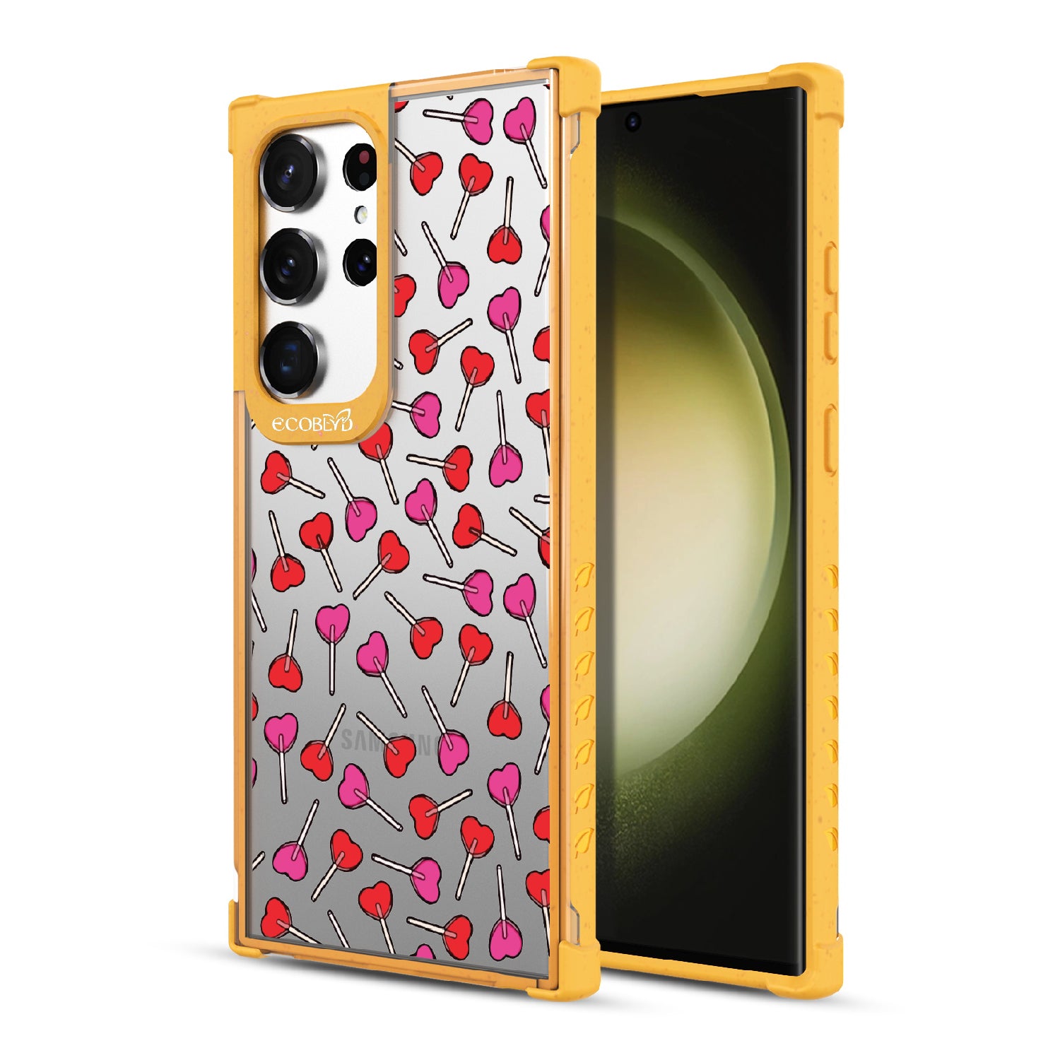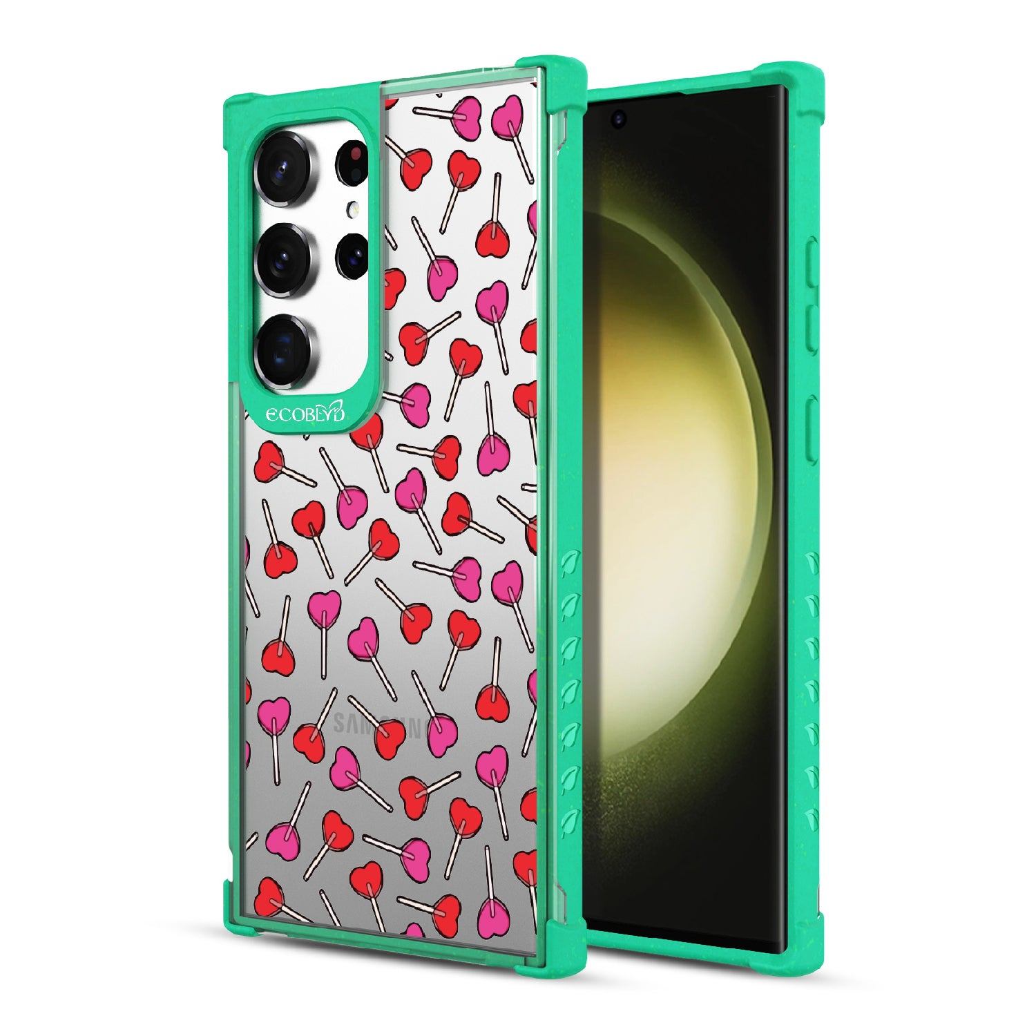 Satisfy your romantic cravings with the Sucker For You design on our Laguna clear Galaxy S23 Ultra case. As sweet heart-shaped lollipops add more sugar to your phone as a delightful surrender, making it a delectable expression of your affection.