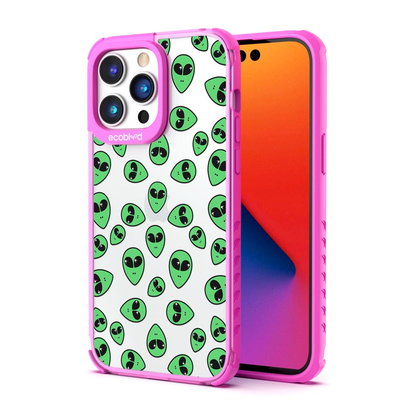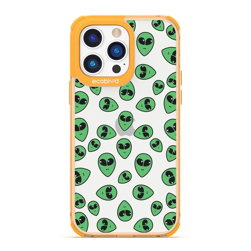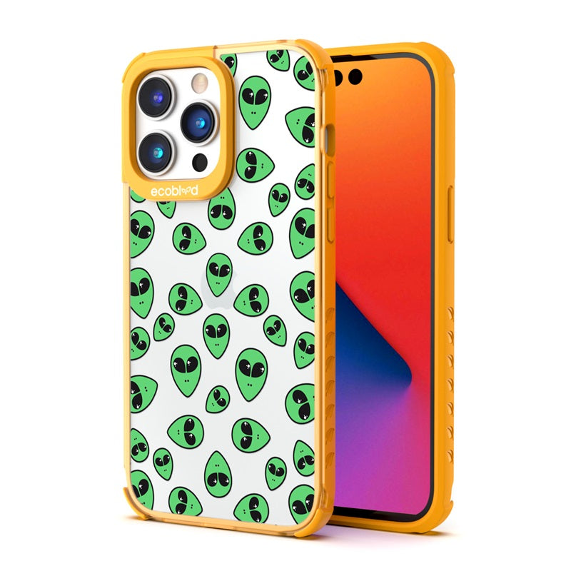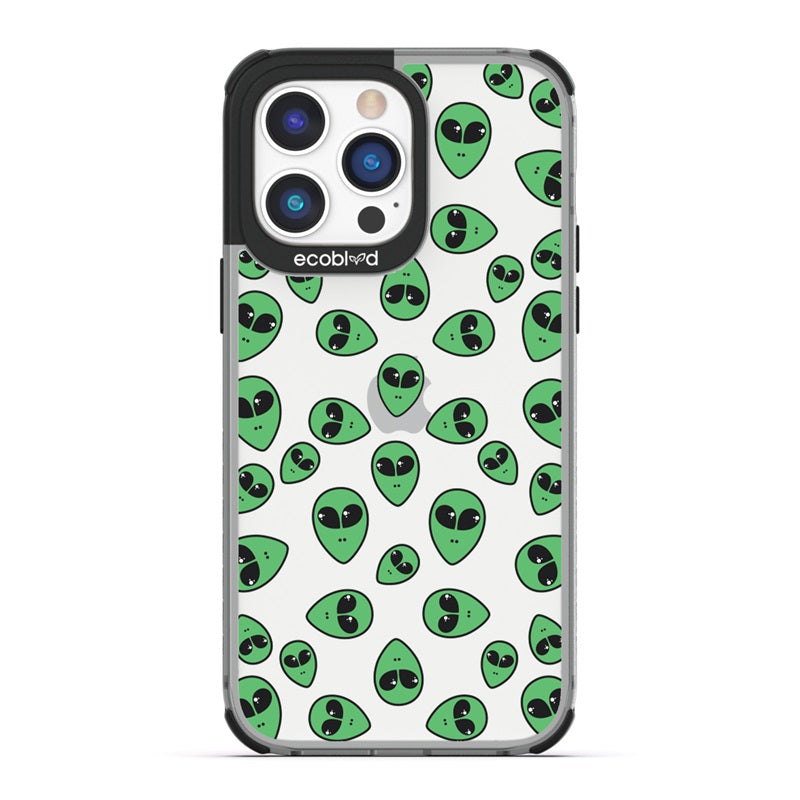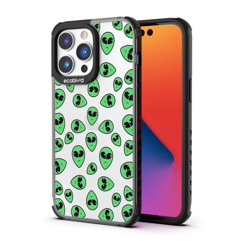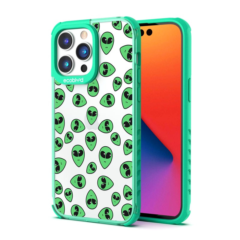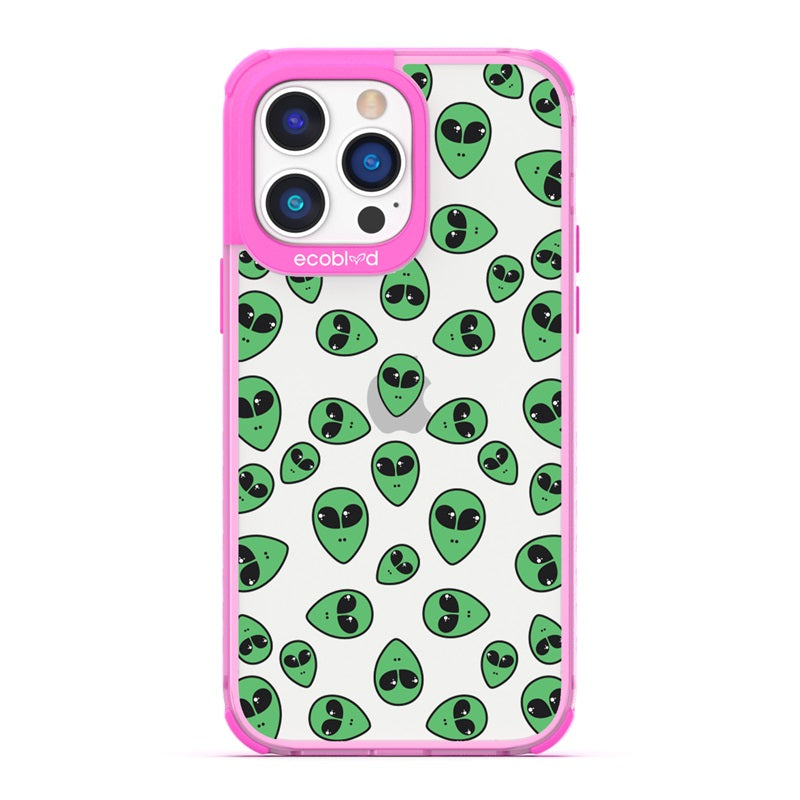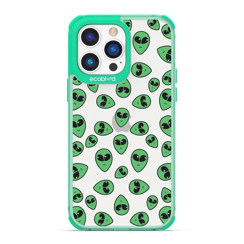 "We come in peace," the Aliens design on our Laguna clear compostable iPhone 14 Pro Max caseannounces as classic green extraterrestrial alien emojis decorate your iPhone 14 Pro Max's surface, offering an out-of-this-world look in all vibrant five colors: Midnight Black, Cascade Blue, Foliage Green, Illuminating Yellow, and Wildflower Pink.