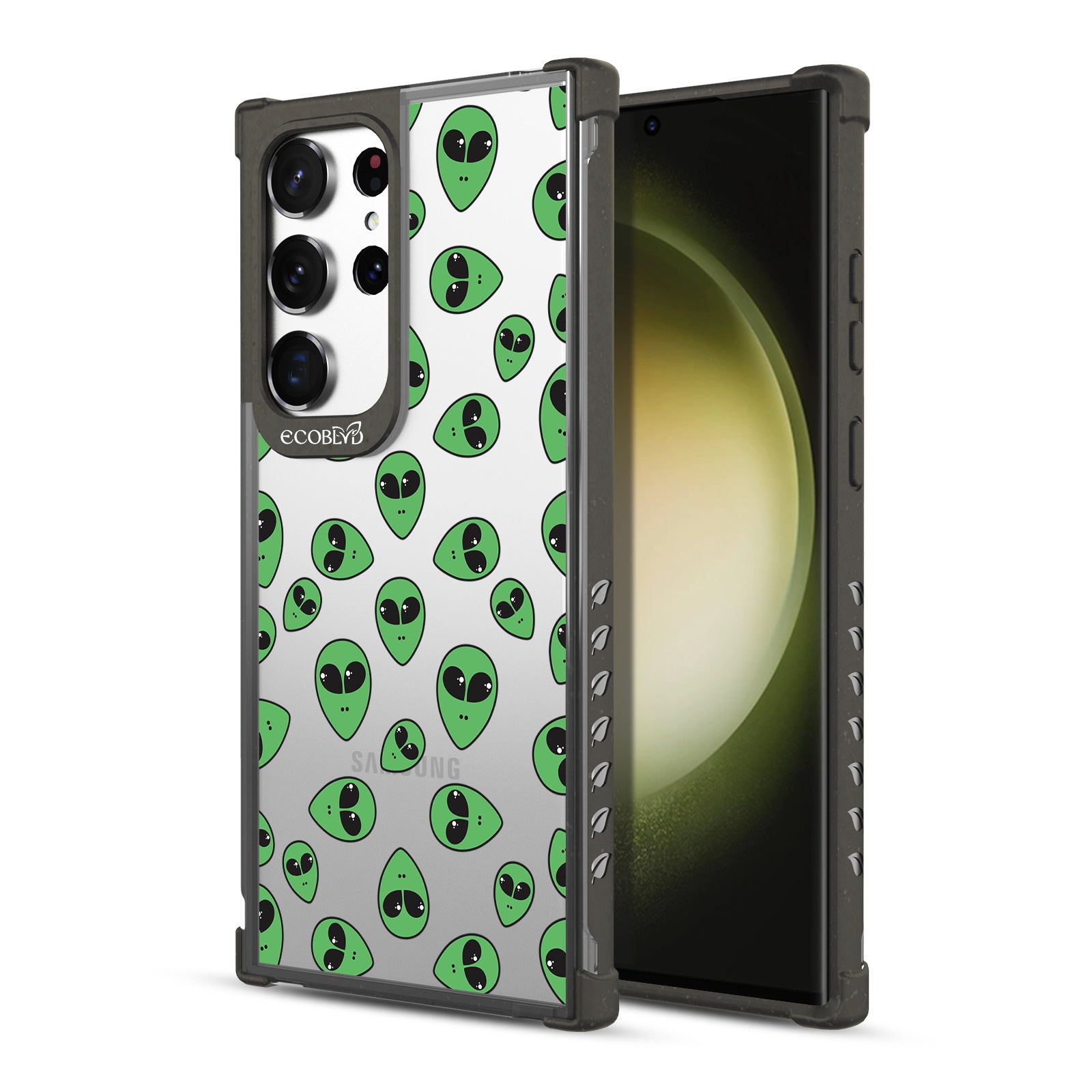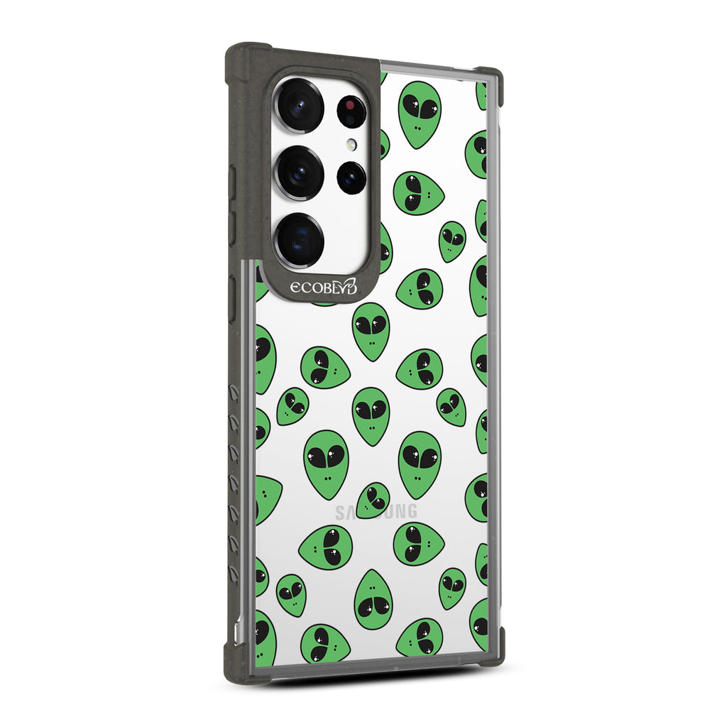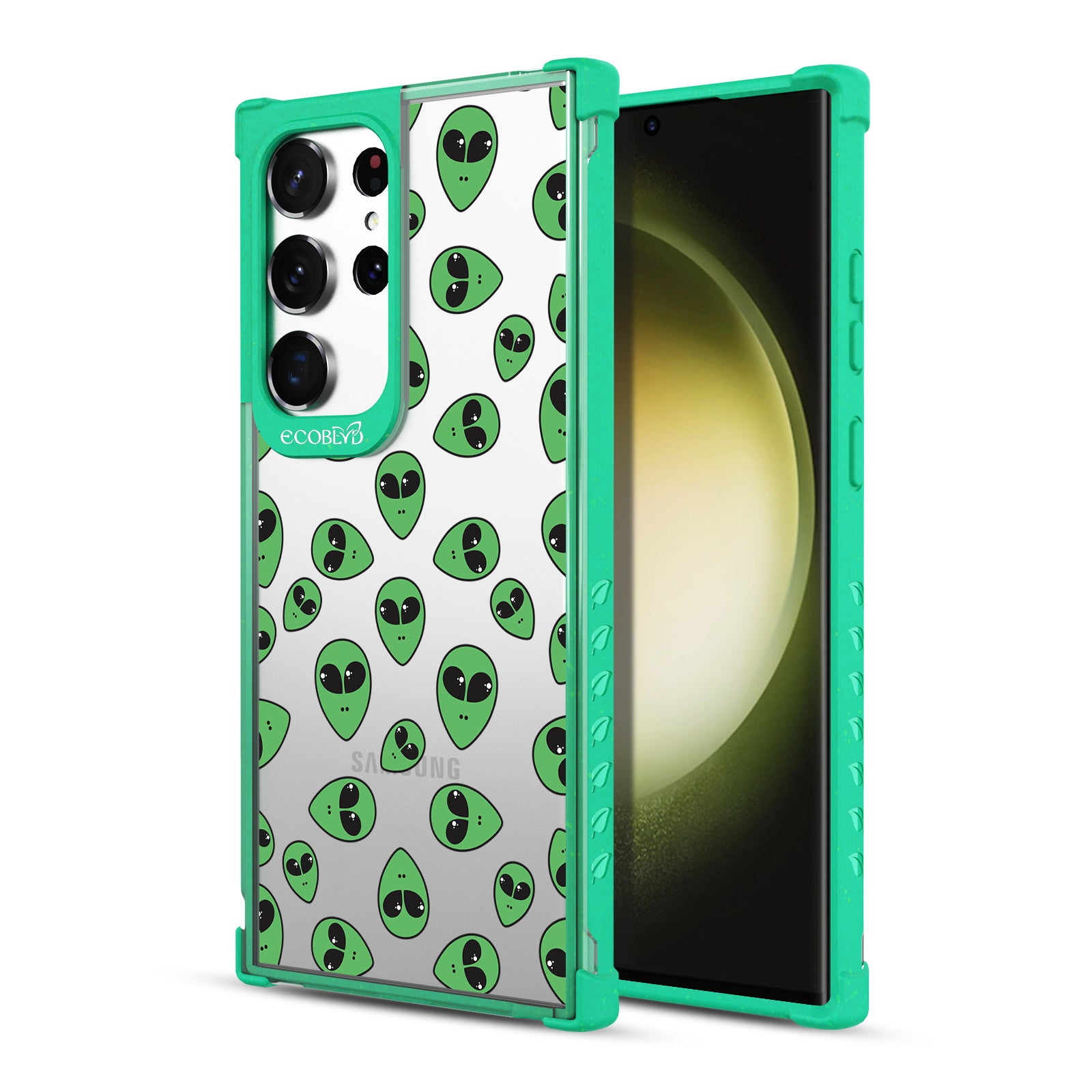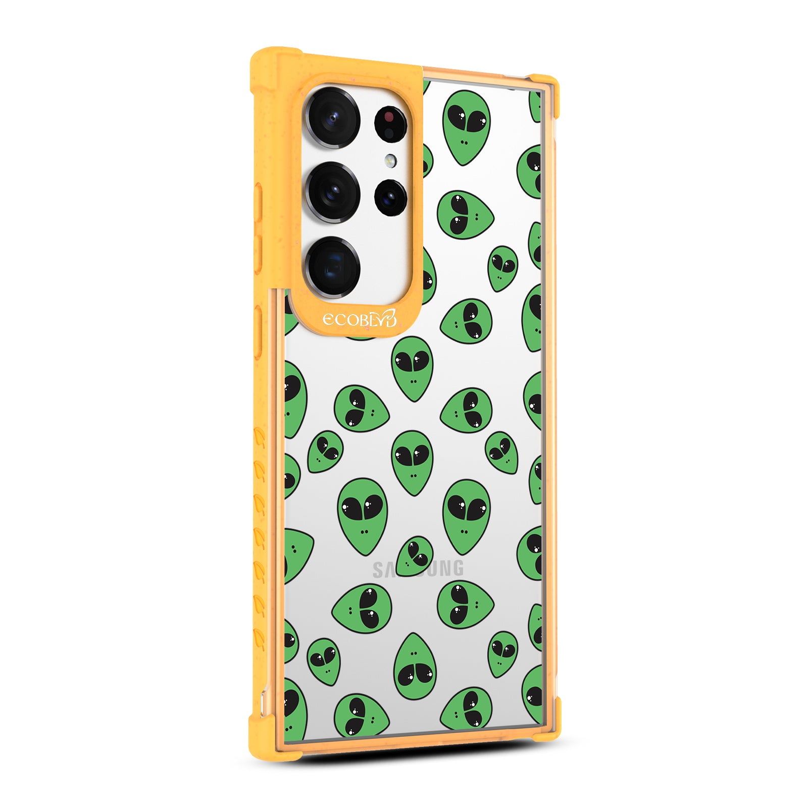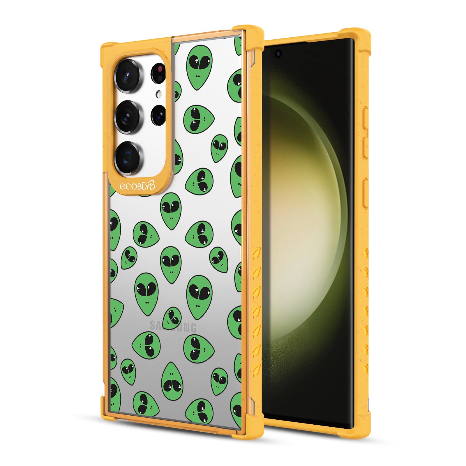 "We come in peace," the Aliens design on our Laguna clear compostable Samsung Galaxy S23 Ultra case announces as classic green extraterrestrial alien emojis decorate your phone's surface, offering an out-of-this-world look in all vibrant five colors: Midnight Black, Cascade Blue, Foliage Green, Illuminating Yellow, and Wildflower Pink.