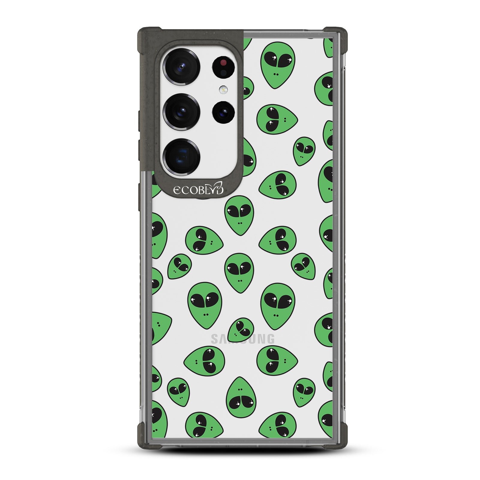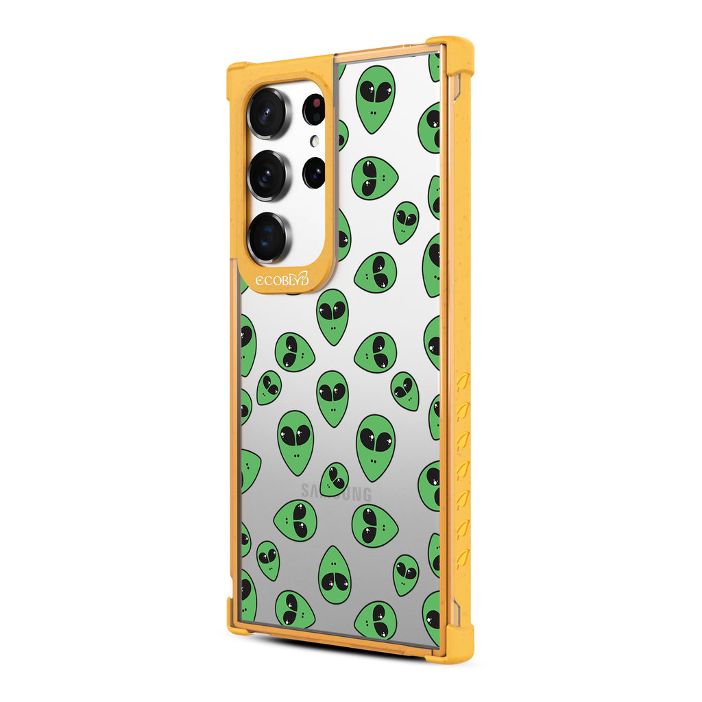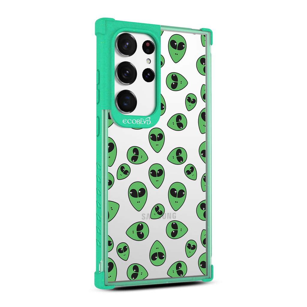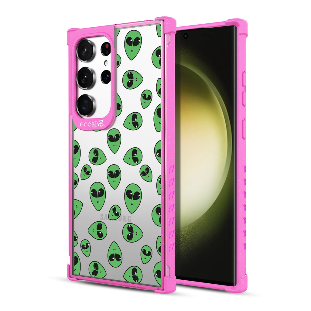 "We come in peace," the Aliens design on our Laguna clear compostable Samsung Galaxy S23 Ultra case announces as classic green extraterrestrial alien emojis decorate your phone's surface, offering an out-of-this-world look in all vibrant five colors: Midnight Black, Cascade Blue, Foliage Green, Illuminating Yellow, and Wildflower Pink.