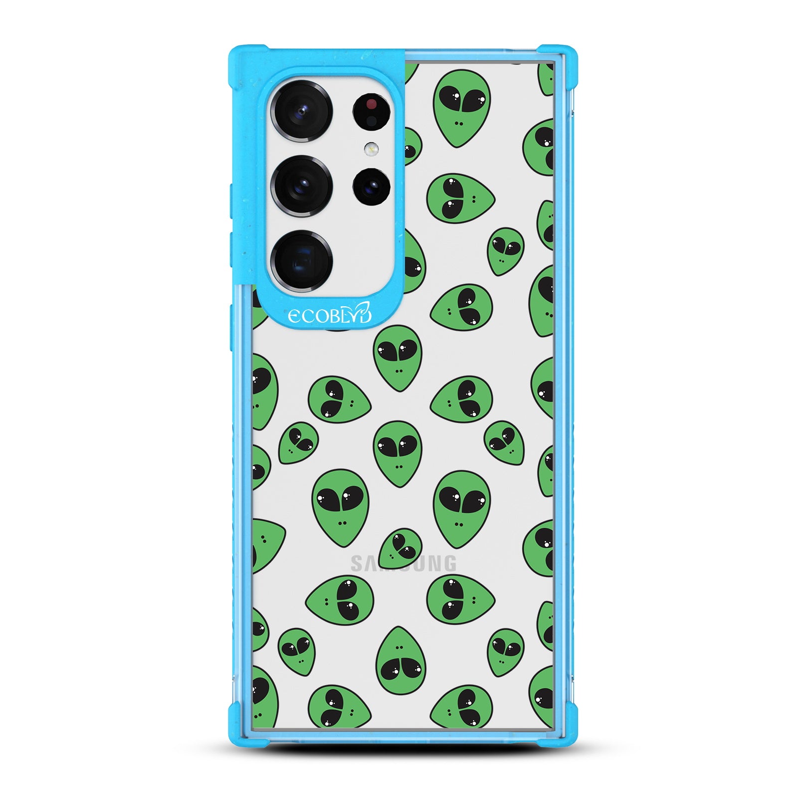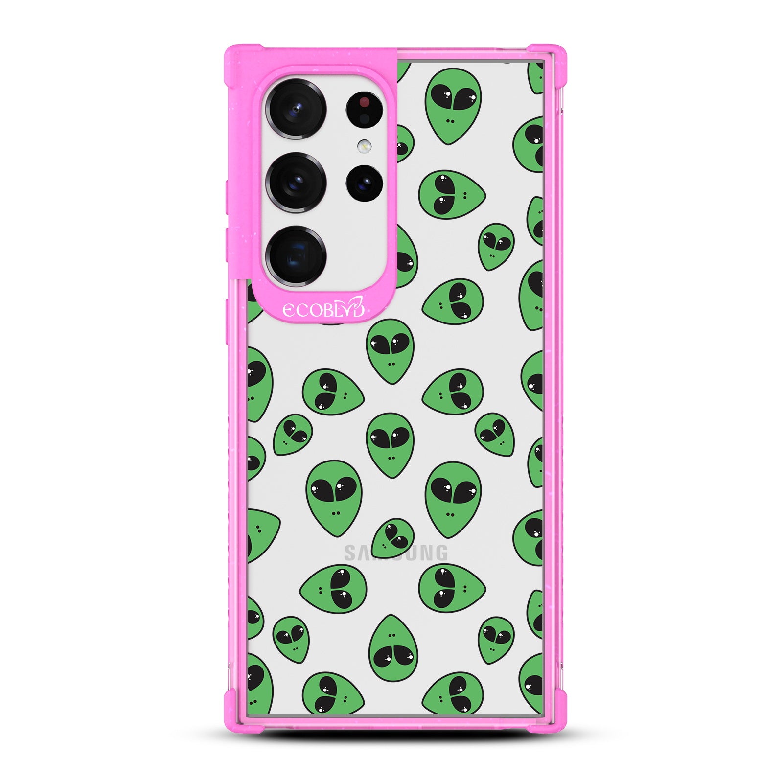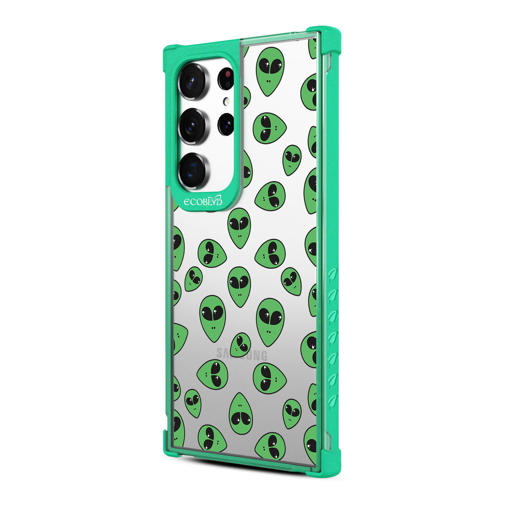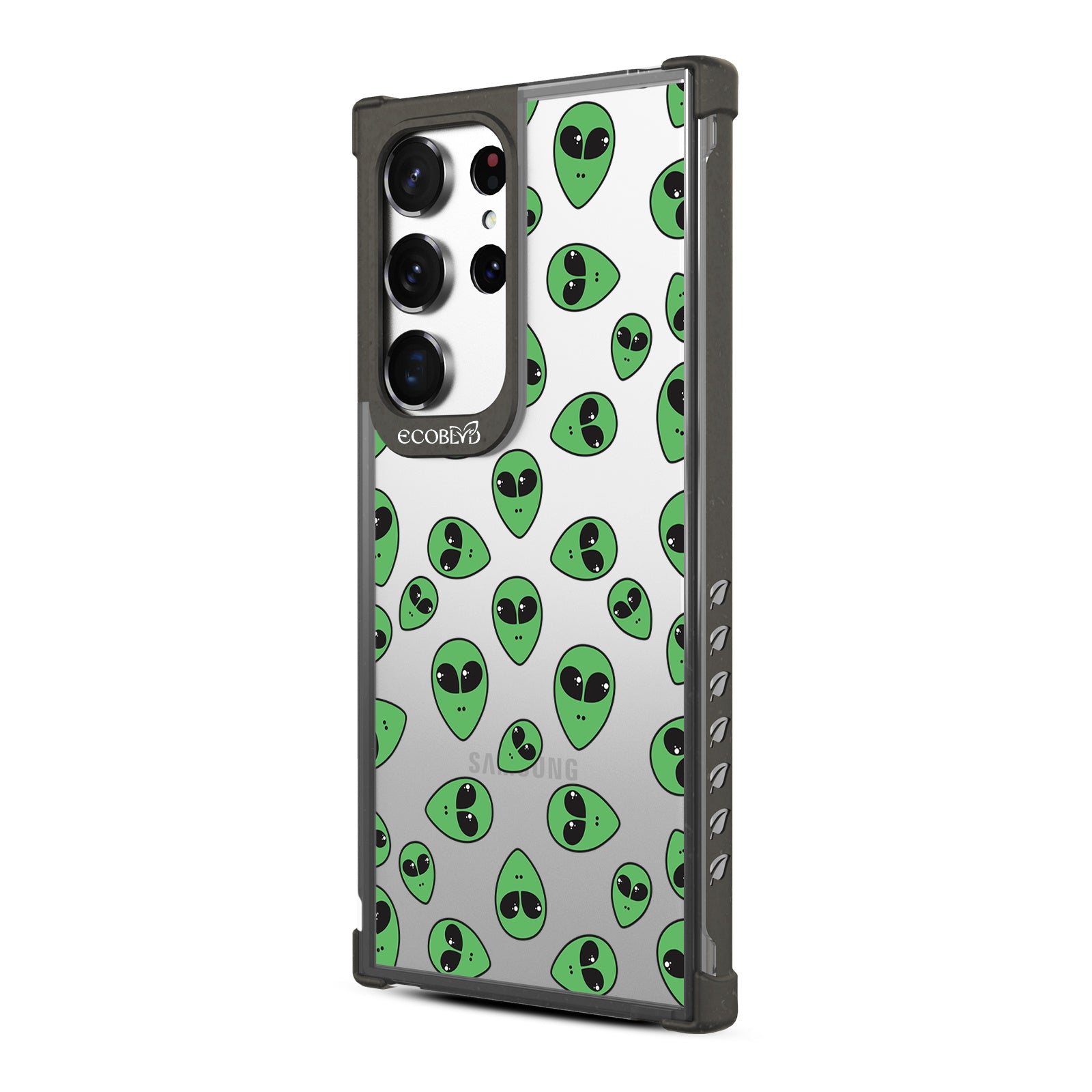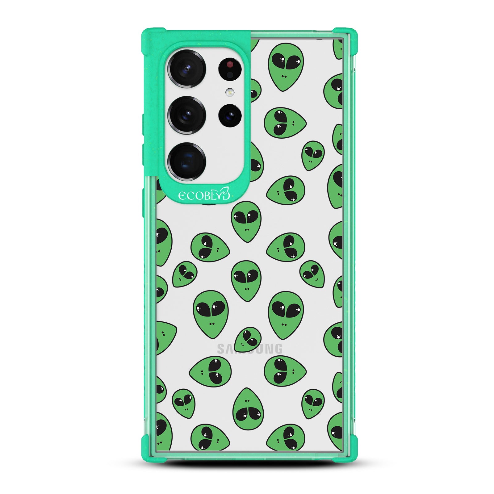 "We come in peace," the Aliens design on our Laguna clear compostable Samsung Galaxy S23 Ultra case announces as classic green extraterrestrial alien emojis decorate your phone's surface, offering an out-of-this-world look in all vibrant five colors: Midnight Black, Cascade Blue, Foliage Green, Illuminating Yellow, and Wildflower Pink.