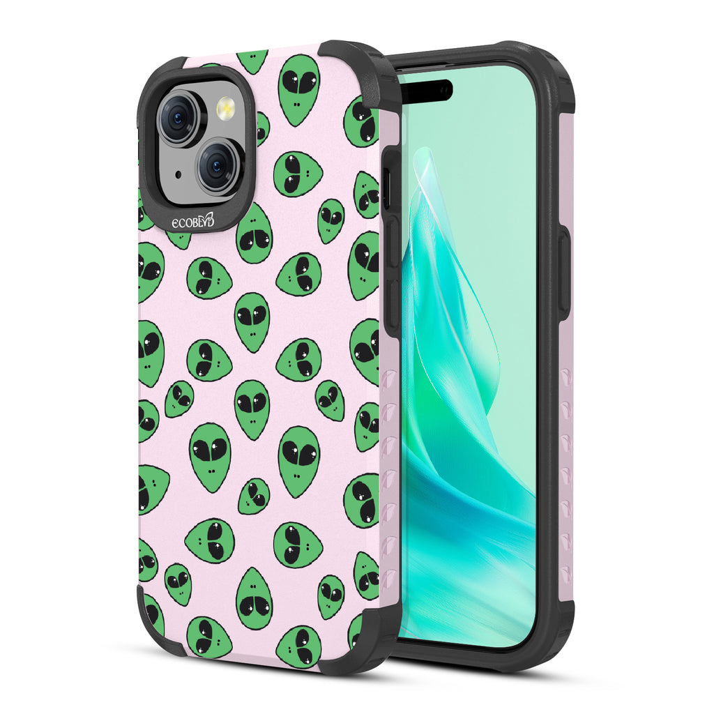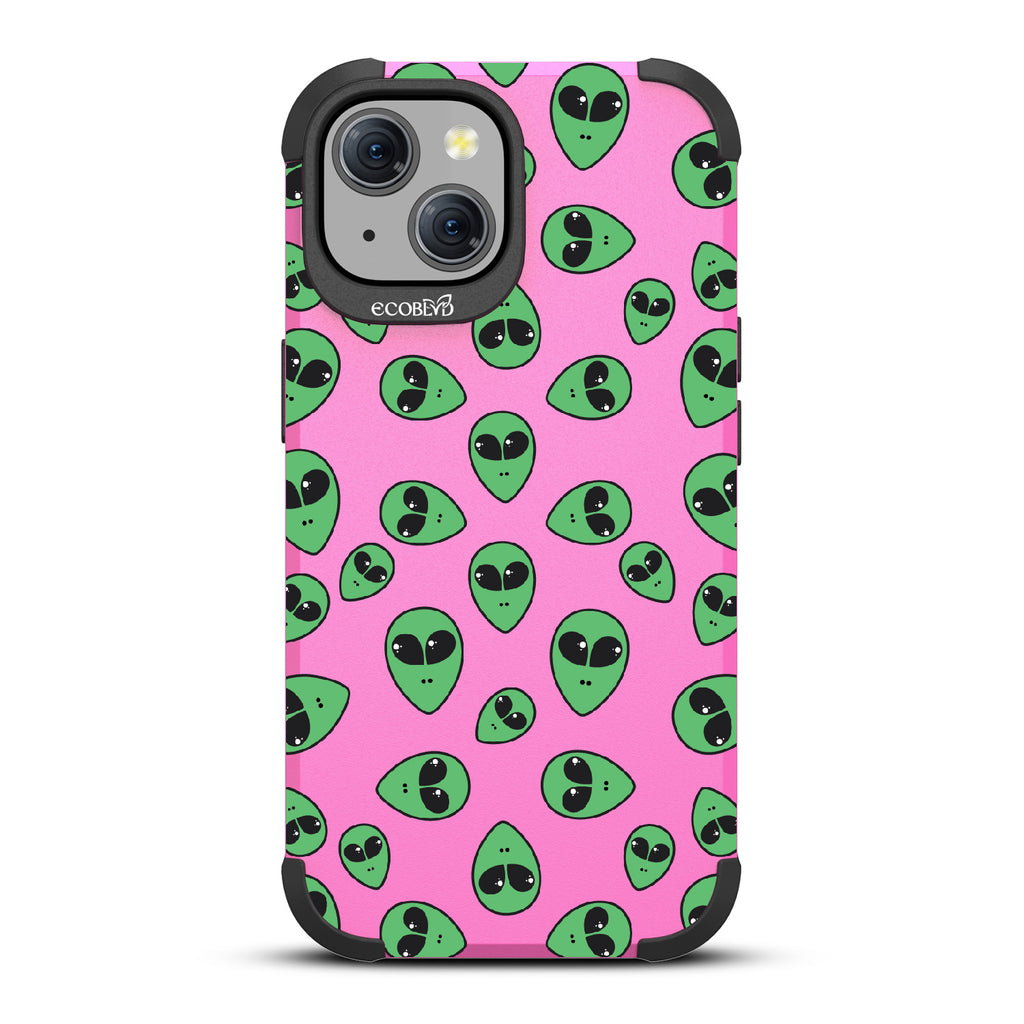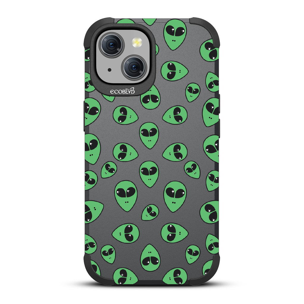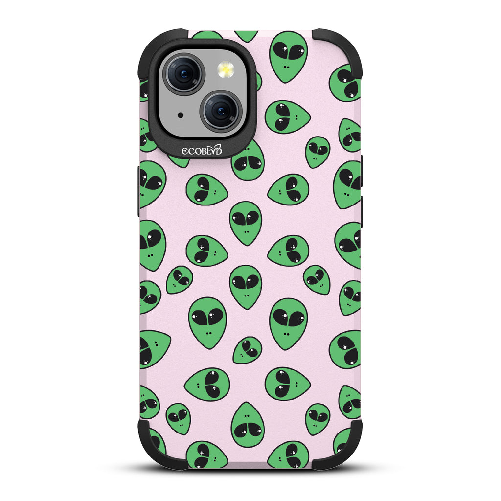 "We come in peace," the Aliens design on our Mojave rugged and compostable iPhone 15 case announces as classic green extraterrestrial alien emojis decorate your phone's surface, offering an out-of-this-world look. Available in five colorways: Midnight Black, Cascade Blue, Wildflower Pink, Illuminating Yellow, and the exclusive Pastel Lilac!