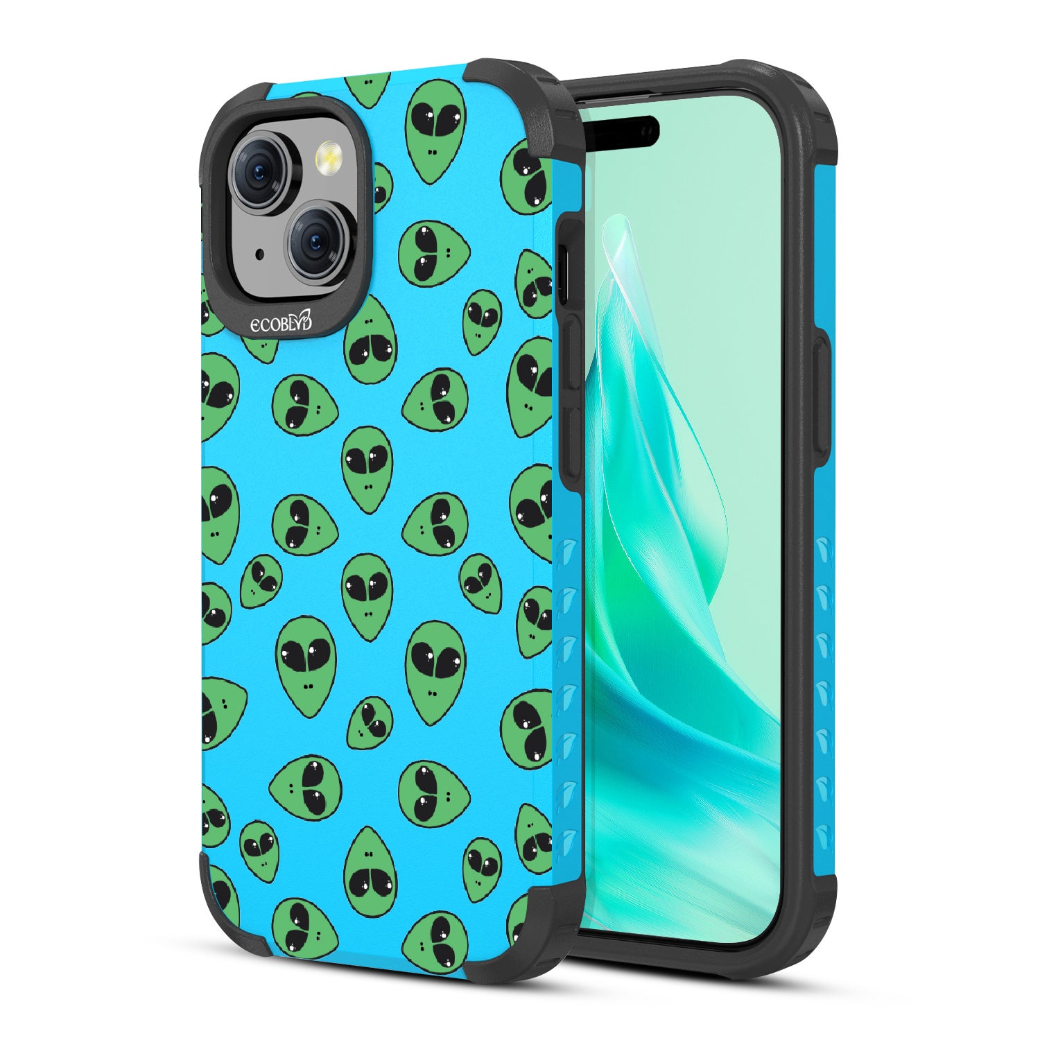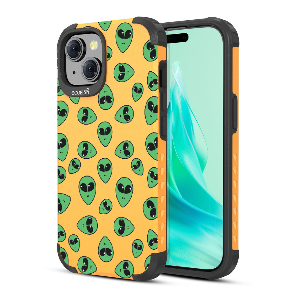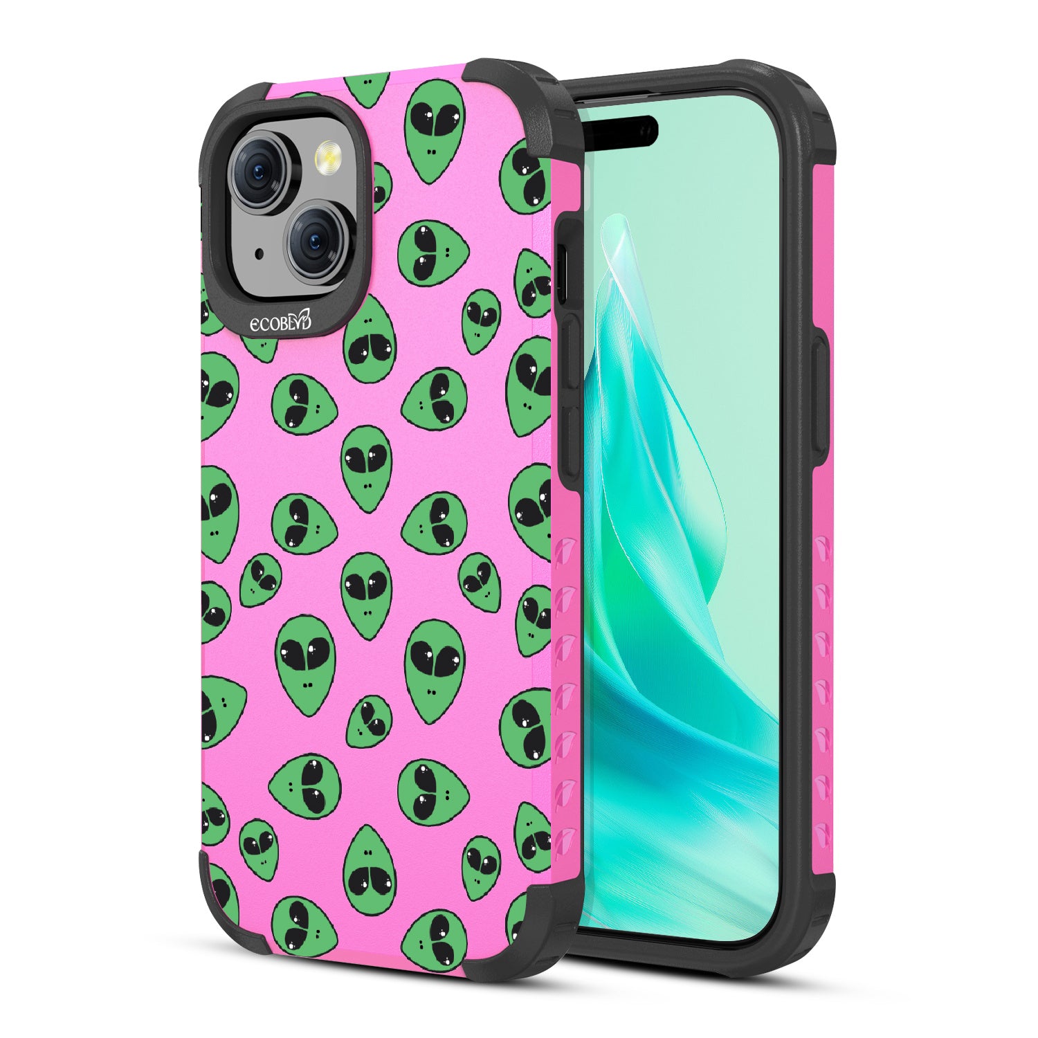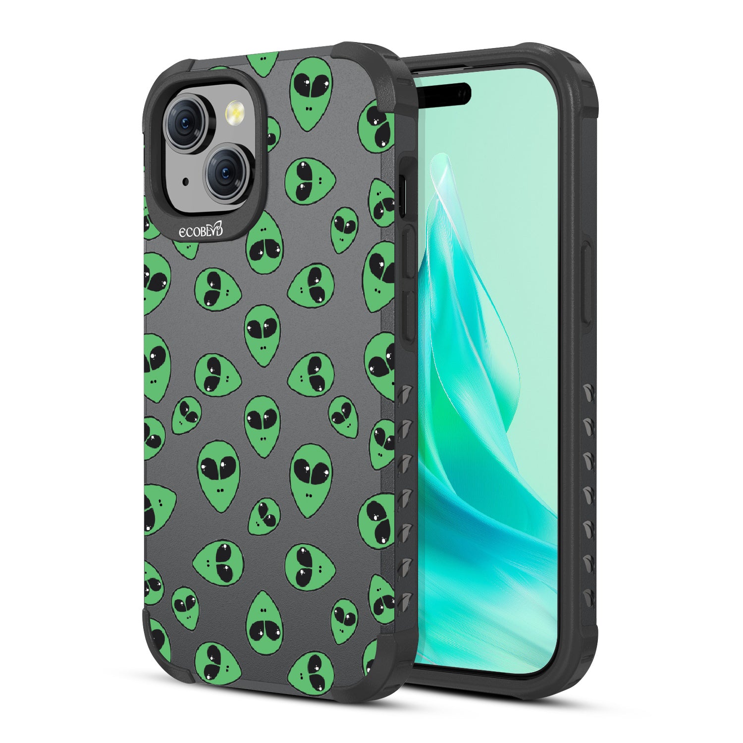 "We come in peace," the Aliens design on our Mojave rugged and compostable iPhone 15 case announces as classic green extraterrestrial alien emojis decorate your phone's surface, offering an out-of-this-world look. Available in five colorways: Midnight Black, Cascade Blue, Wildflower Pink, Illuminating Yellow, and the exclusive Pastel Lilac!