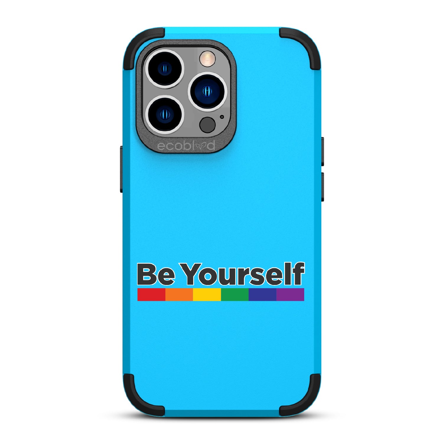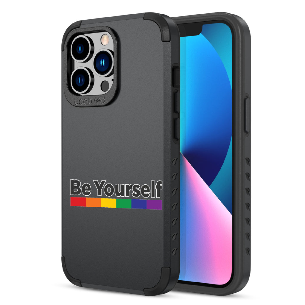 Embrace the power of self-expression with the captivating Be Yourself design on our Mojave rugged and compostable iPhone 12 Pro Max case or iPhone 13 Pro Max case, as the empowering message harmonizes with a vibrant rainbow spectrum bar. This design serves as a reminder that you have the freedom to be unapologetically yourself, breaking societal norms and embracing your true colors. Wear it proudly, igniting conversations and fostering a more inclusive world that celebrates individuality.