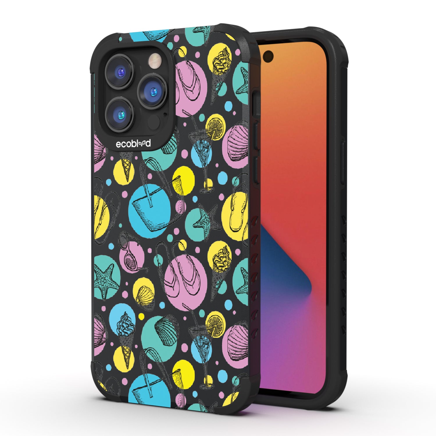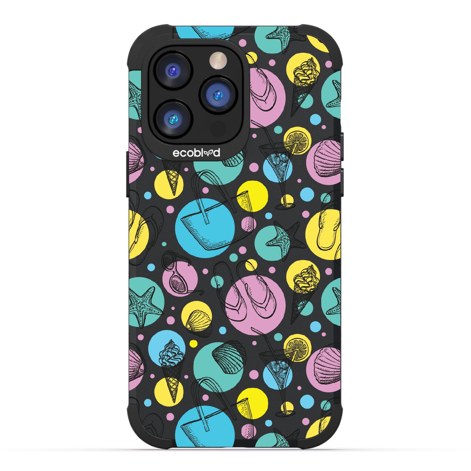 Beach Please, it's time to turn up the heat and bring your summer swagger to the forefront with this beach-ready design on our Mojave rugged and compostable iPhone 14 Pro Max case. This phone case design is a bold fusion of beach essentials, featuring a trendy beach tote that holds your Beach Please-ure, a cocktail glass brimming with tropical vibes and a hint of cheekiness, seashells that carry the whispers of unforgettable beach moments, sunglasses that say "I'm too fabulous for the shade," mouthwatering ice cream that satisfies your sweet and sassy cravings, starfish ready to be your beachside companions, and flip flops that strut with an attitude that demands attention.