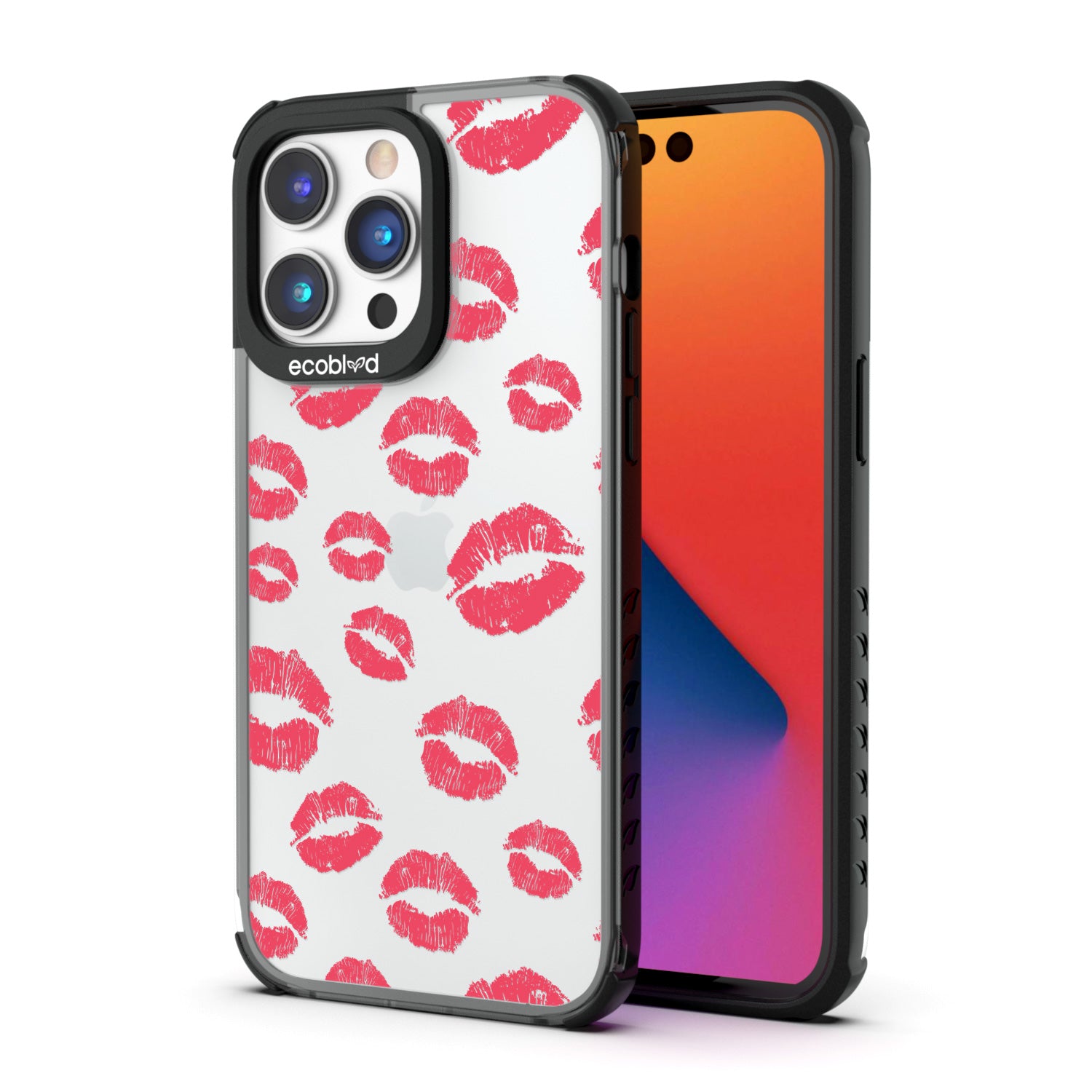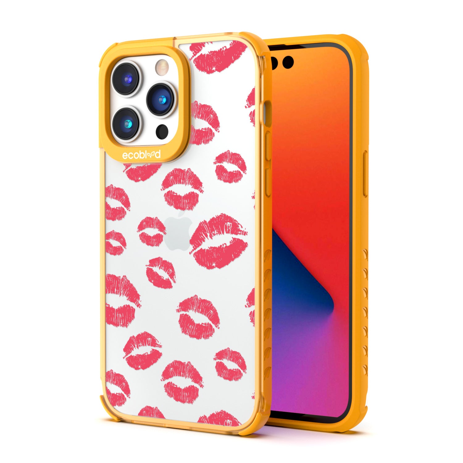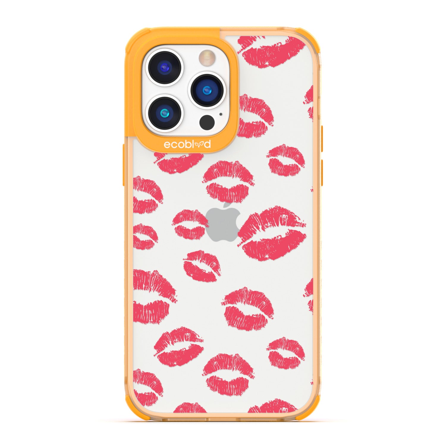 Put on your best flirt with our Bisou design on our Laguna clear compostable iPhone 14 Pro case, featuring an array of playful red lipstick kisses that are sure to make any head turn and a touch of je ne sais quoi to your phone on five fierce colorways: Midnight Black, Cascade Blue, Foliage Green, Illuminating Yellow, and Wildflower Pink.