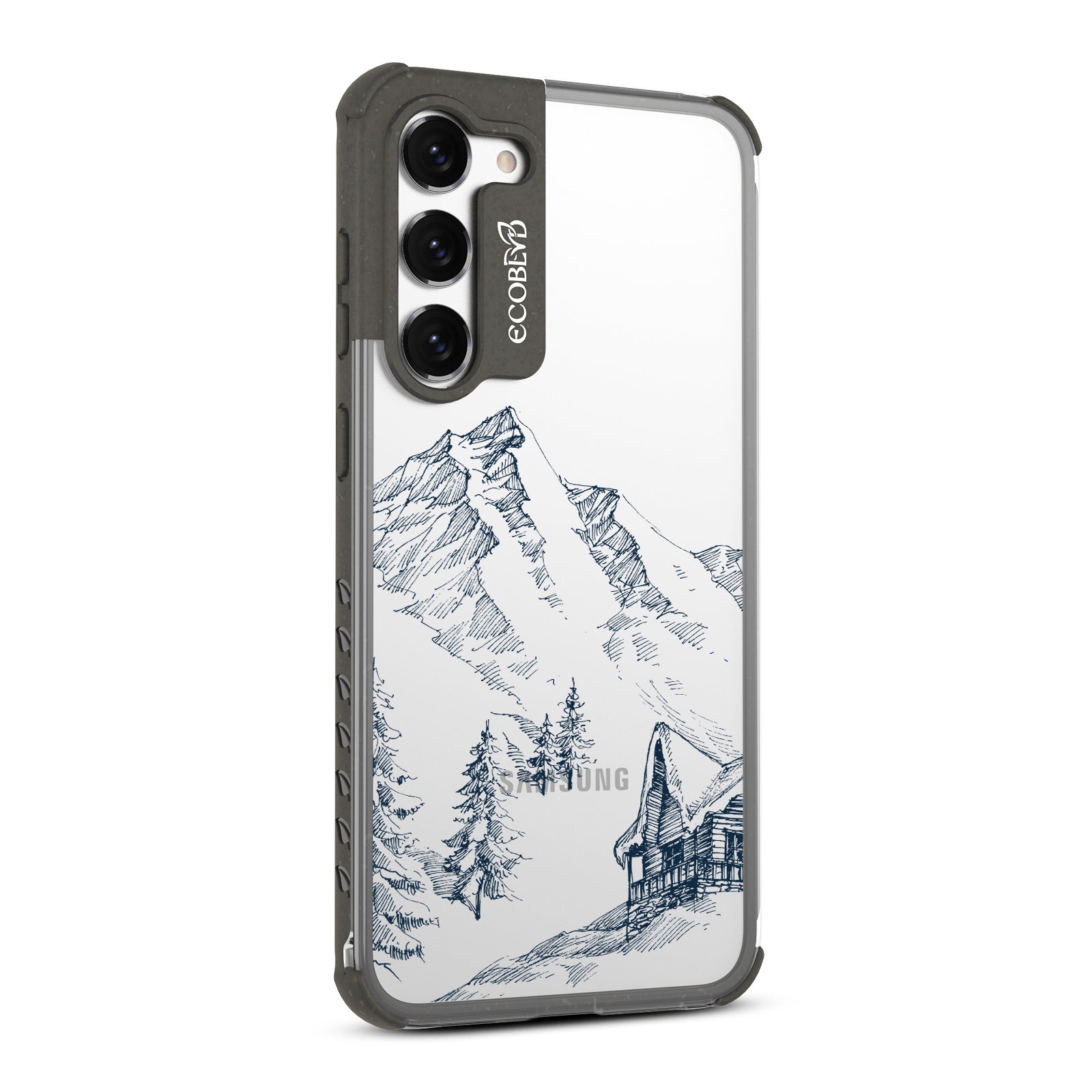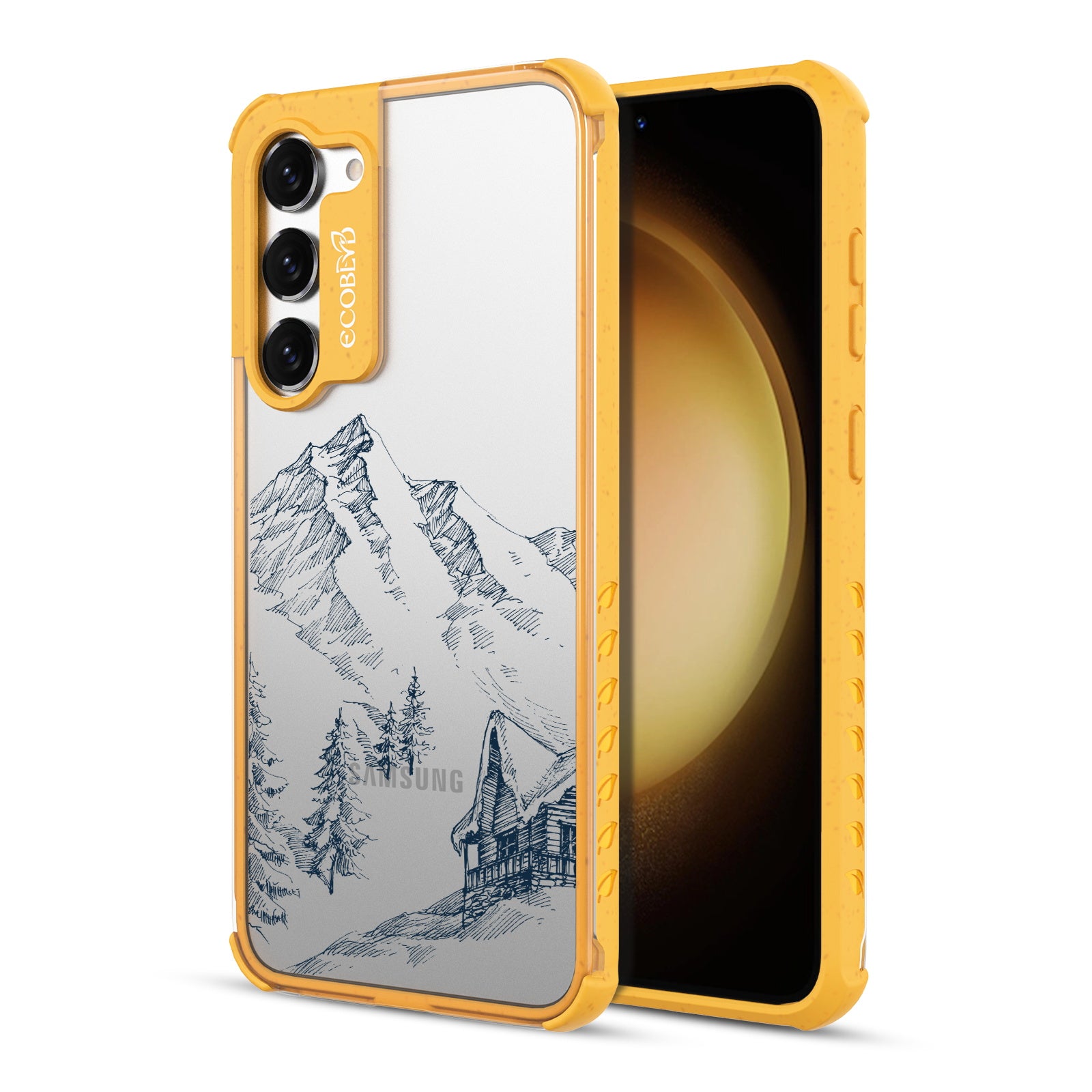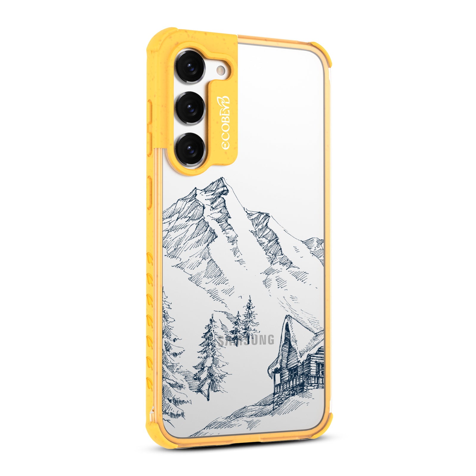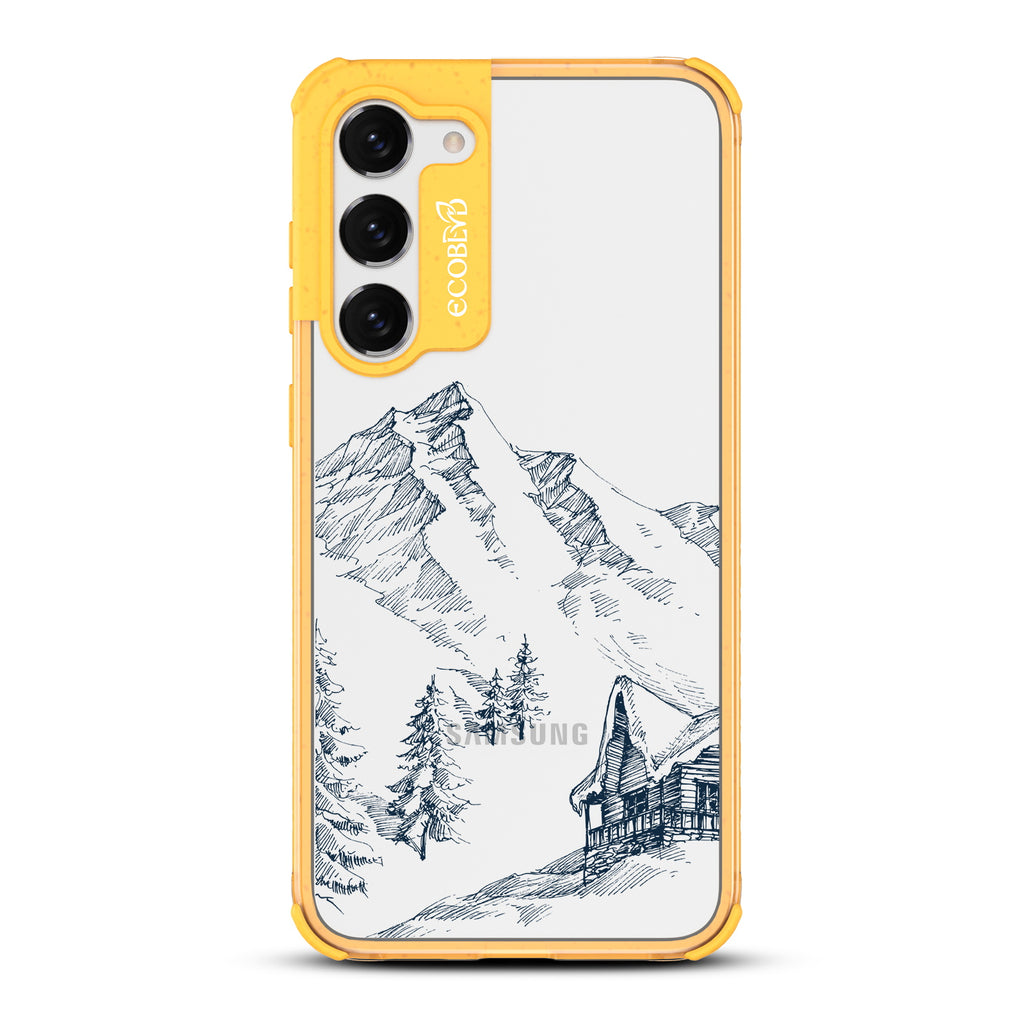 Enjoy an off-grid mountainside getaway right from your phone with the Cabin Retreat winter design on our Laguna clear compostable Galaxy S23 Plus case, as the hillside and snow-capped view provide an escape in five serene colors: Midnight Black, Cascade Blue, Foliage Green, Illuminating Yellow, and Wildflower Pink.