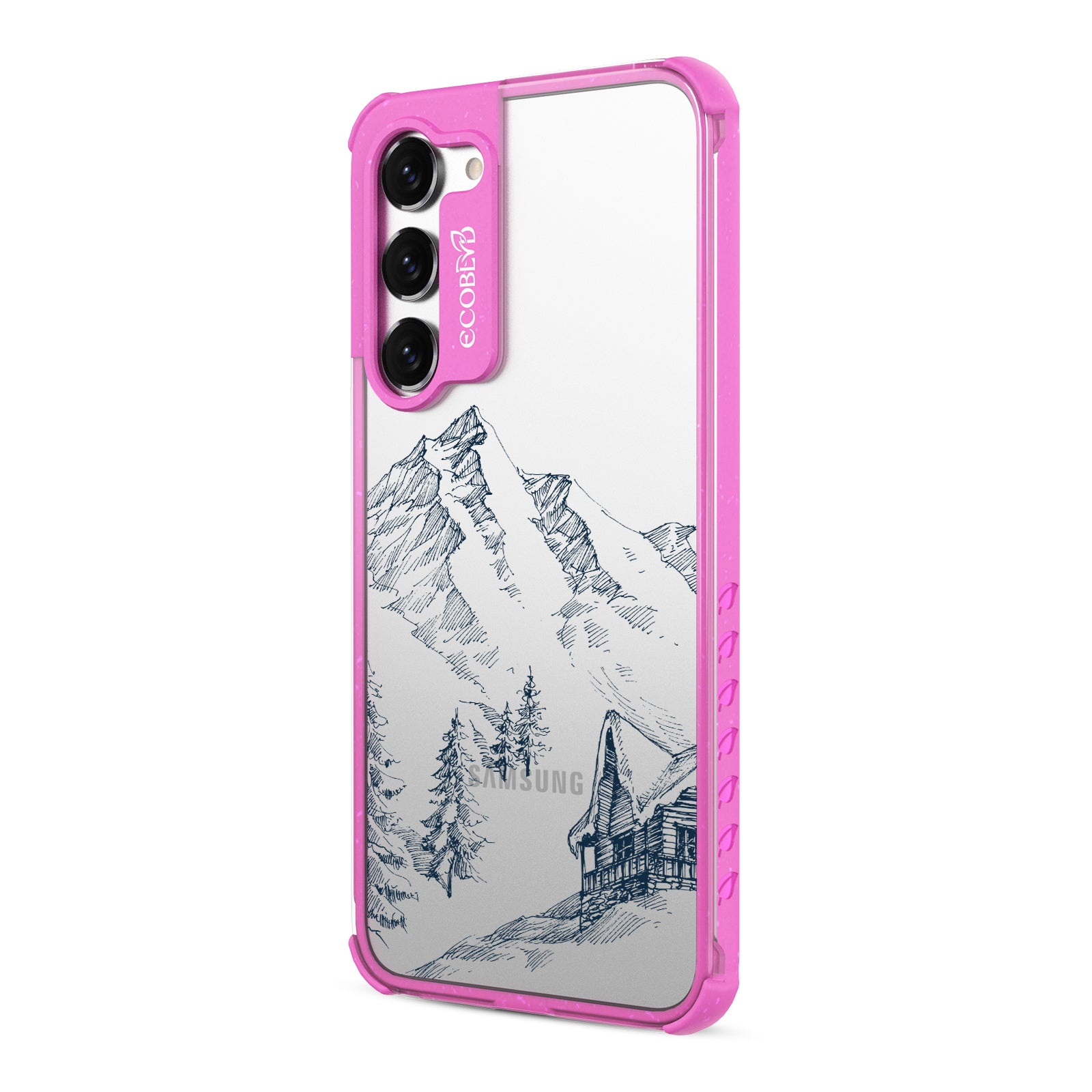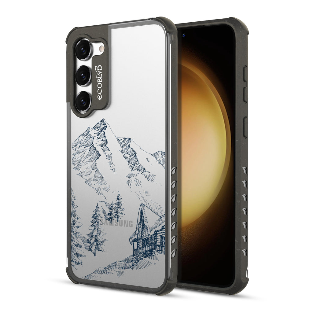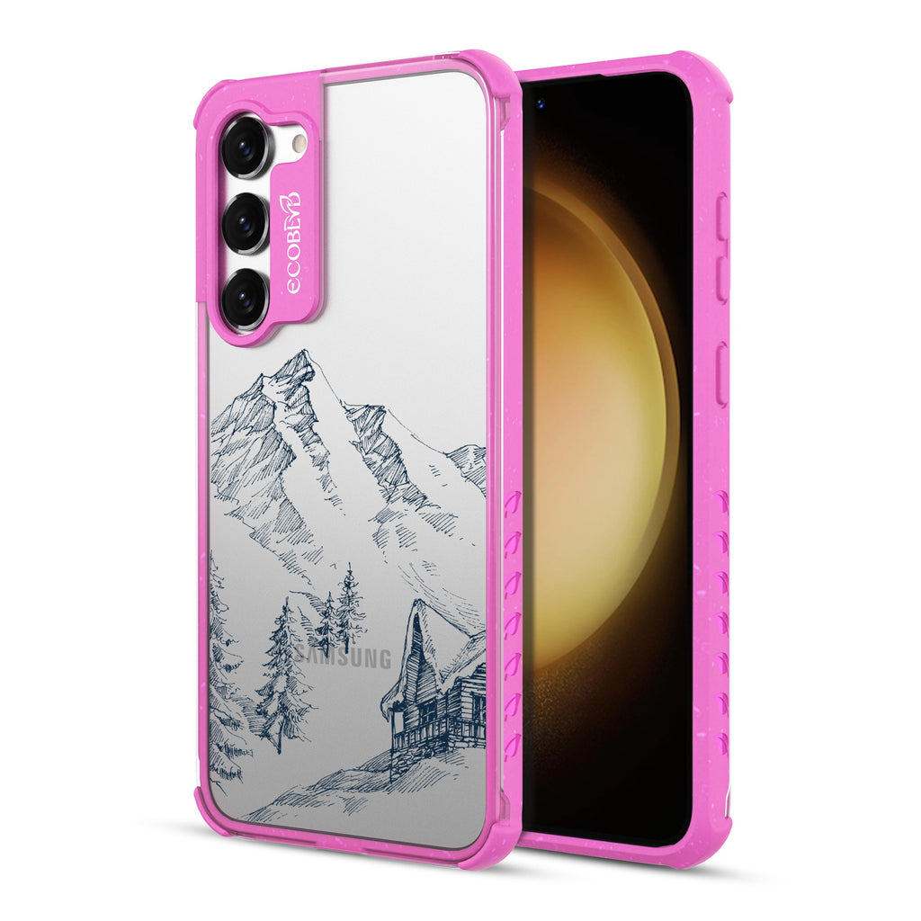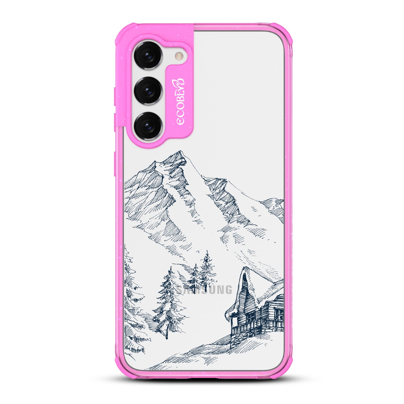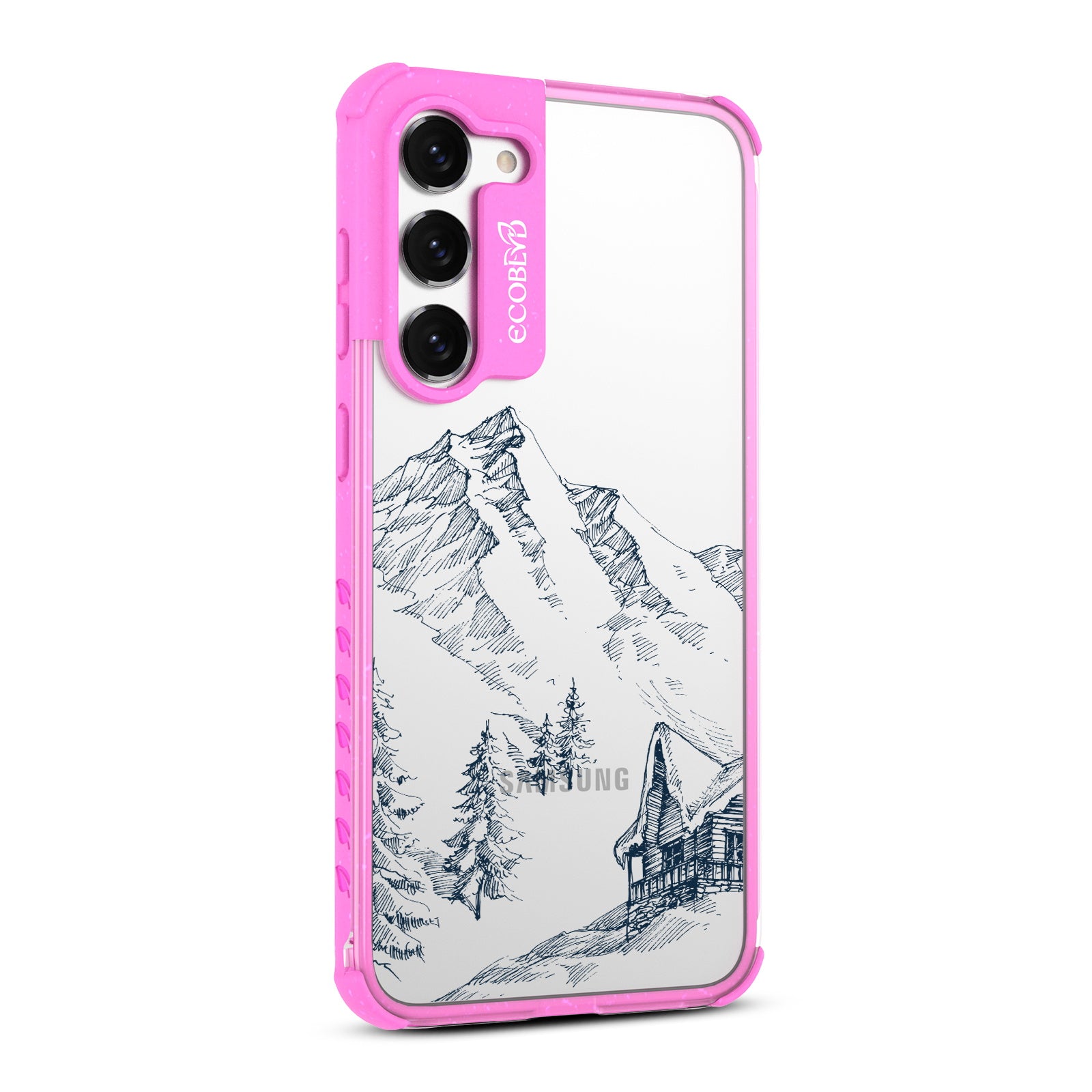 Enjoy an off-grid mountainside getaway right from your phone with the Cabin Retreat winter design on our Laguna clear compostable Galaxy S23 Plus case, as the hillside and snow-capped view provide an escape in five serene colors: Midnight Black, Cascade Blue, Foliage Green, Illuminating Yellow, and Wildflower Pink.