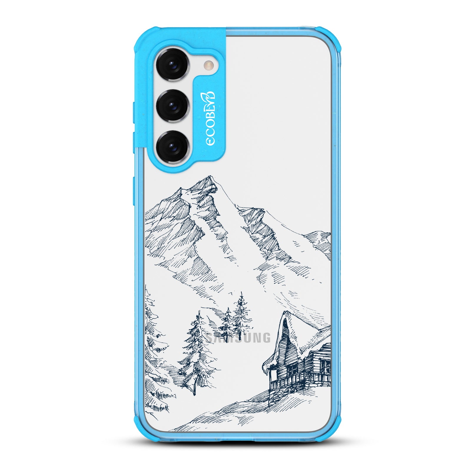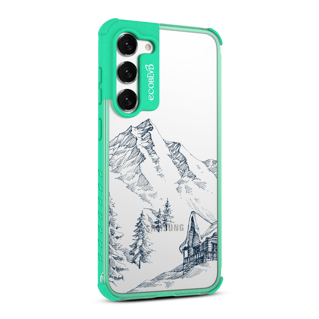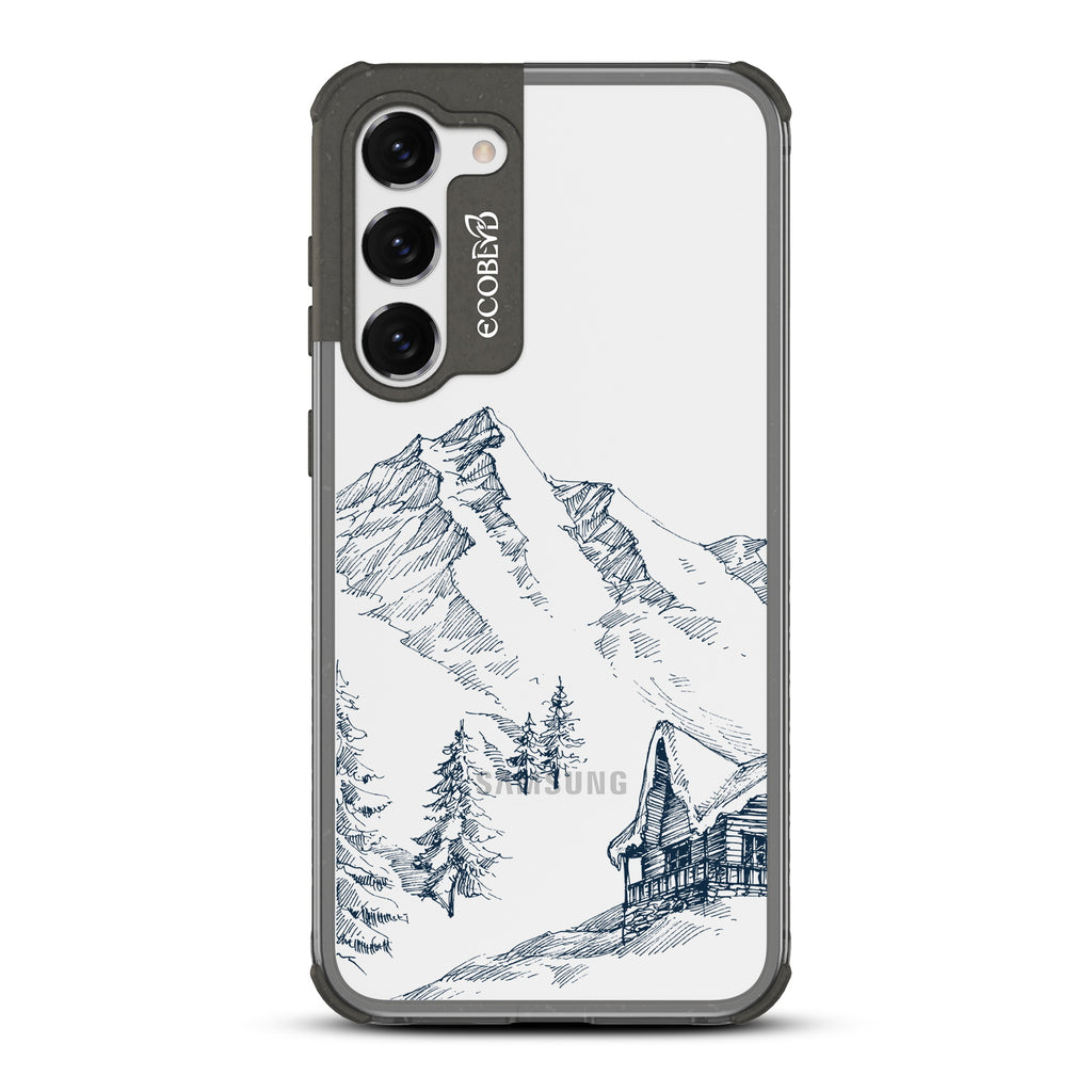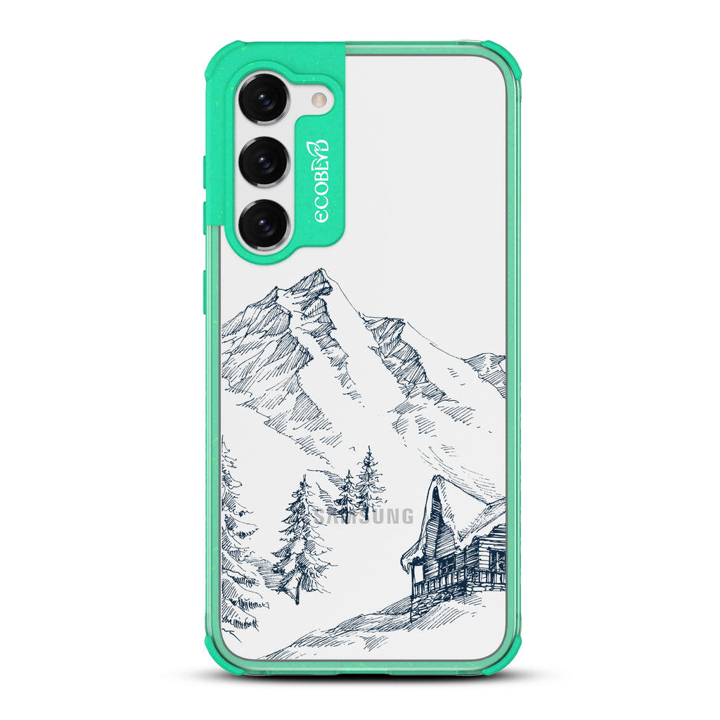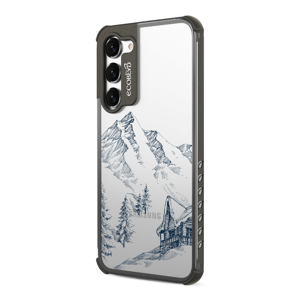 Enjoy an off-grid mountainside getaway right from your phone with the Cabin Retreat winter design on our Laguna clear compostable Galaxy S23 Plus case, as the hillside and snow-capped view provide an escape in five serene colors: Midnight Black, Cascade Blue, Foliage Green, Illuminating Yellow, and Wildflower Pink.
