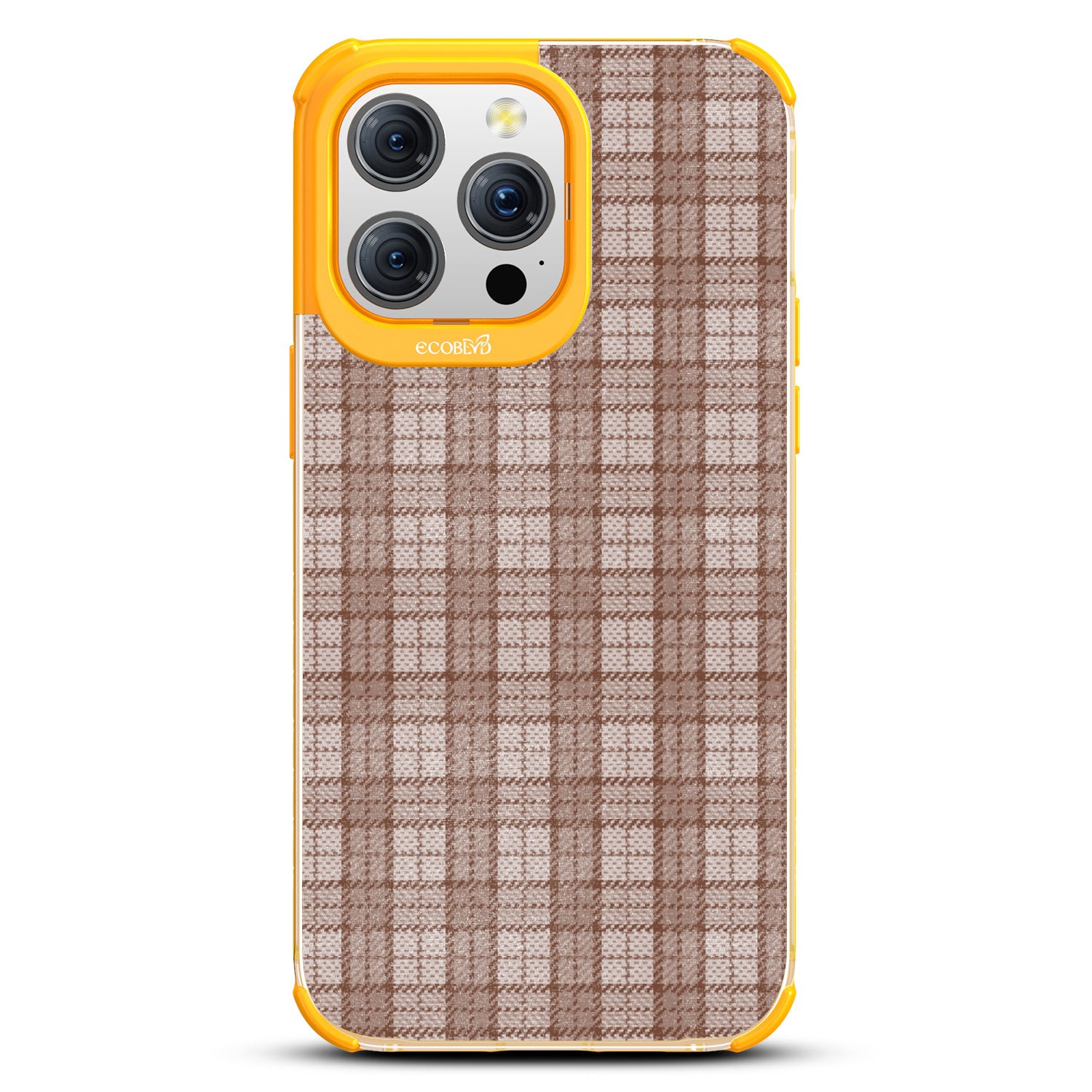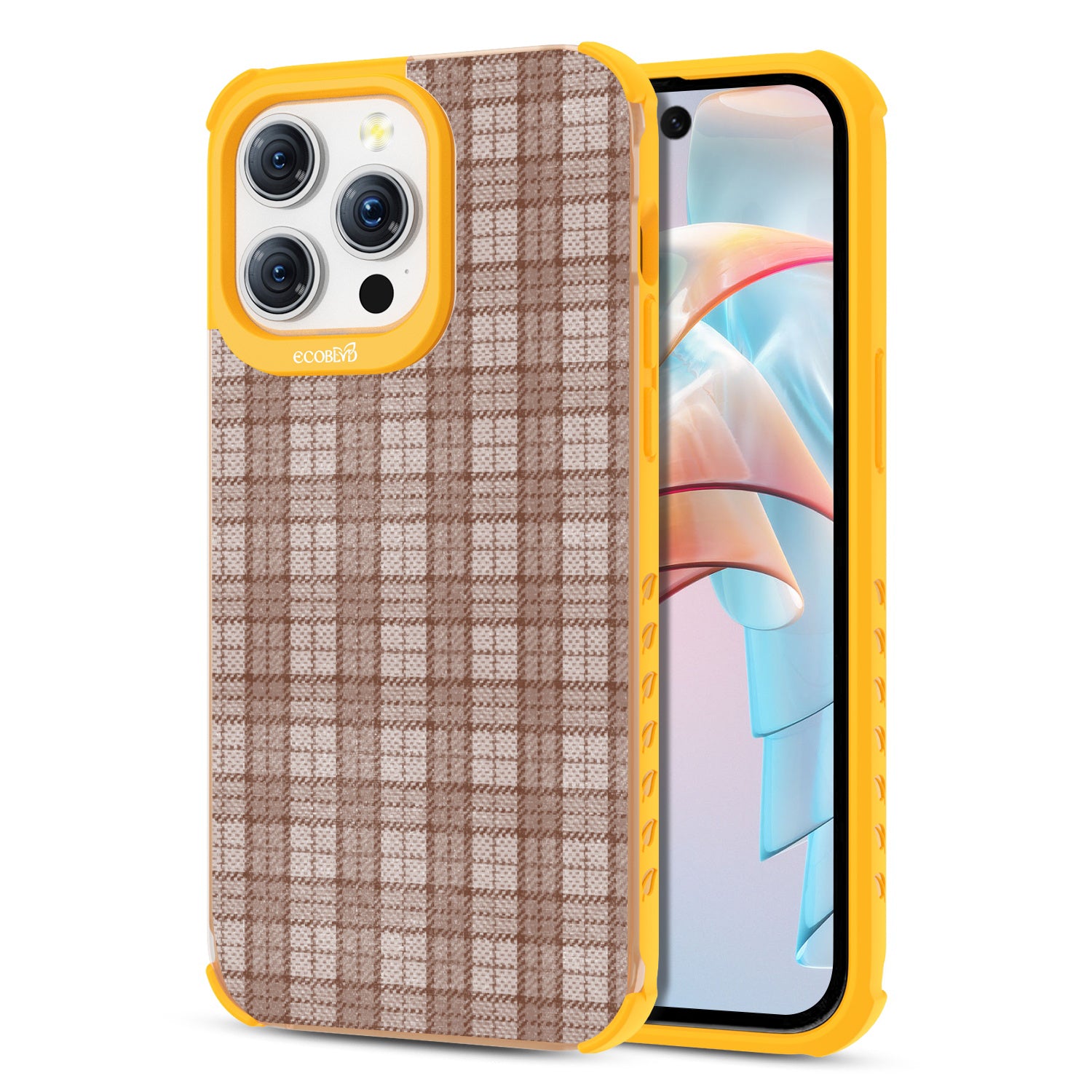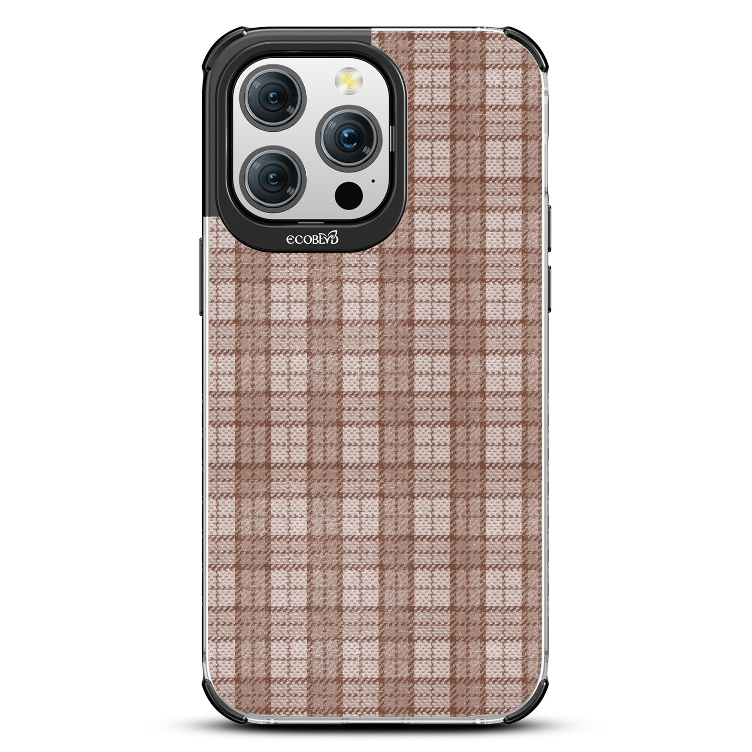 We bring you the cozy charm of Chestnut Tartan on our Laguna clear iPhone 15 Pro Max case, where the intricate chestnut and tan tones blend in a unique plaid pattern that embodies the spirit of the fall season. Your phone becomes a statement piece, showcasing the warmth of autumn's fashion.