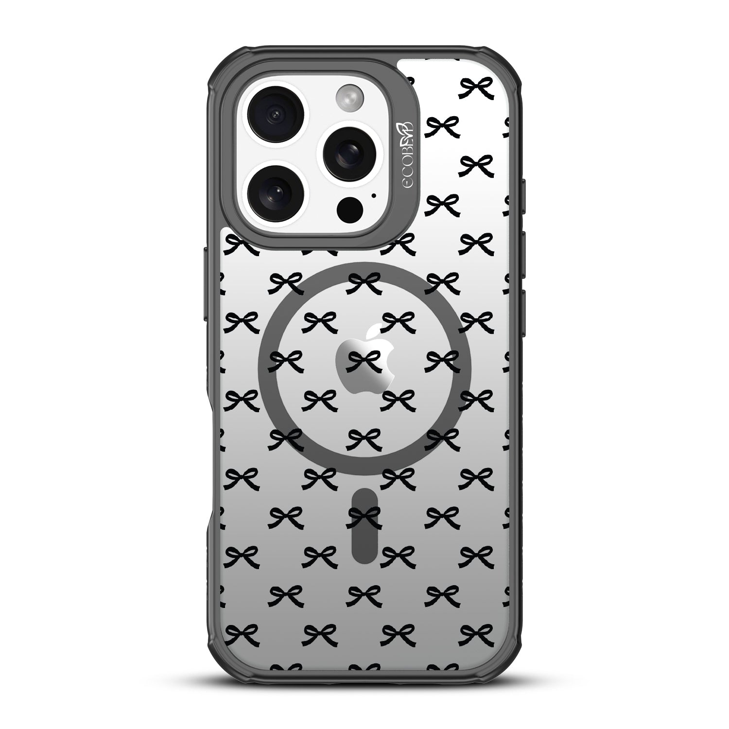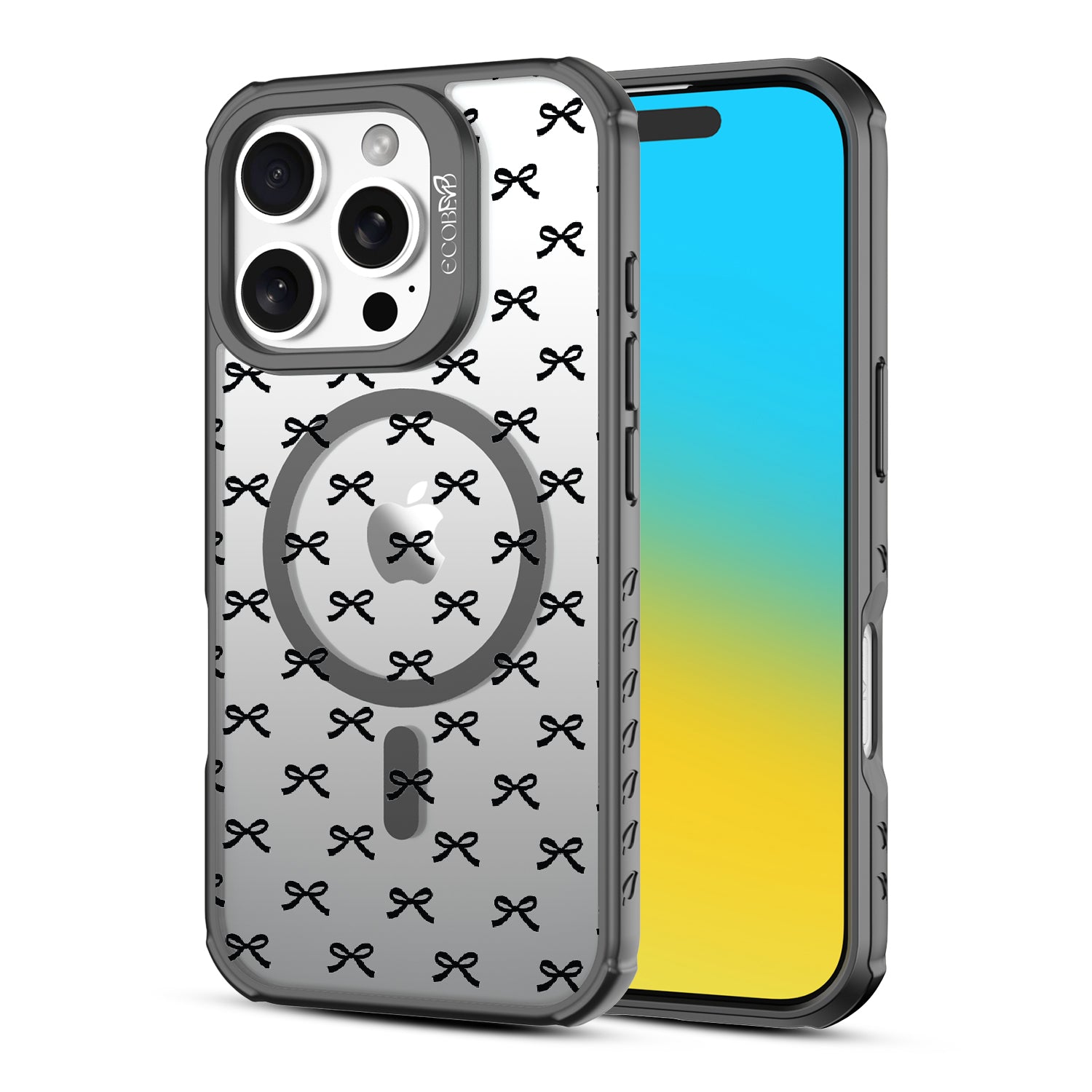 Get all dressed up to adorn and adore with the Coquette design on our Revive clear iPhone 16 Pro case Let the cute black bows be the stars of the show, gracing your phone with their dainty presence. As you hold your device, you'll feel the subtle embrace of everlasting bonds formed by each dainty knot, creating a sense of feminine connection and girlhood that goes beyond mere aesthetics.