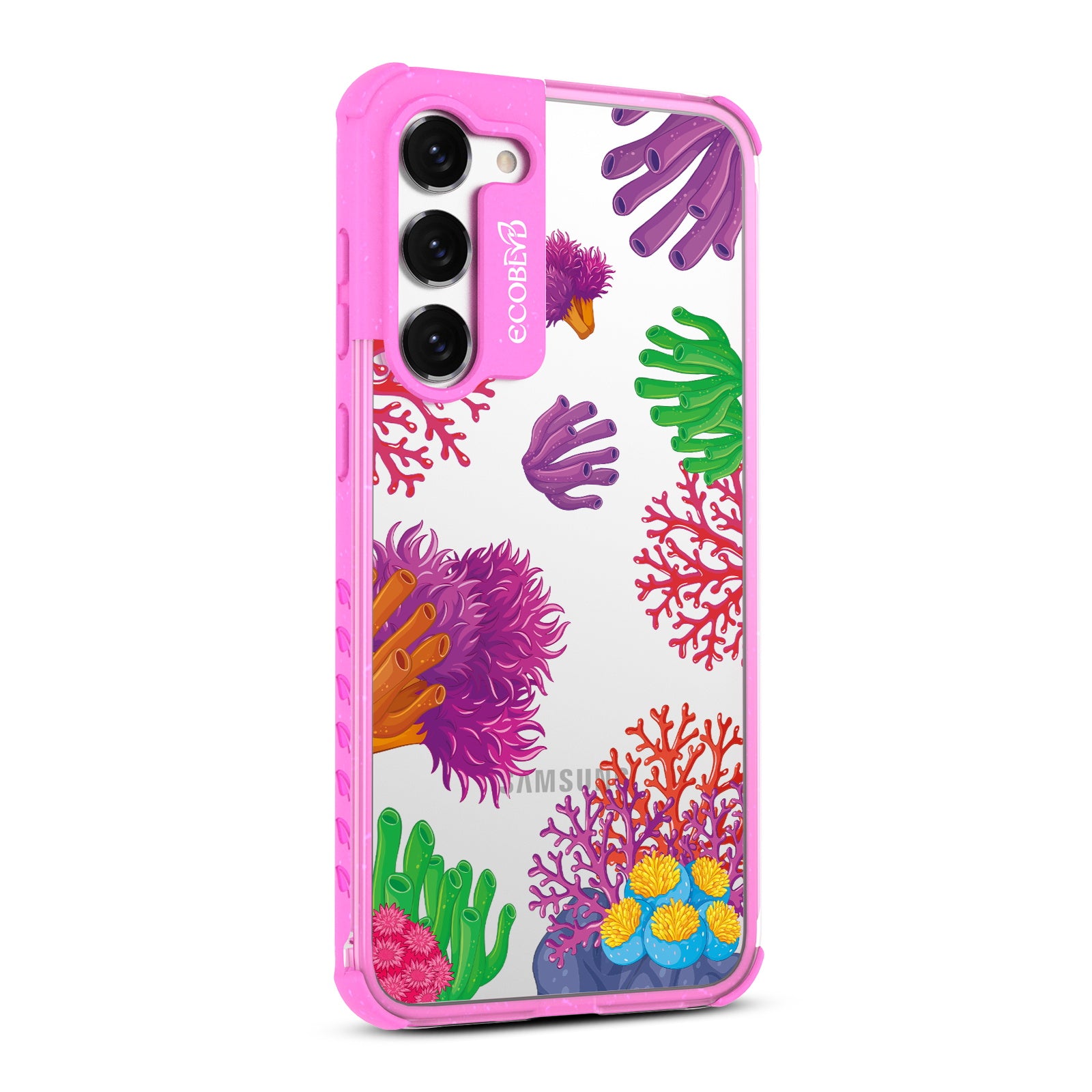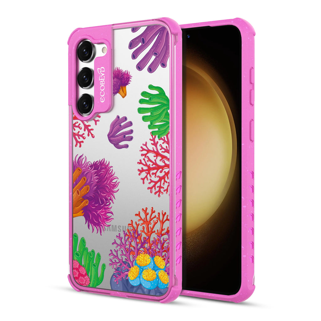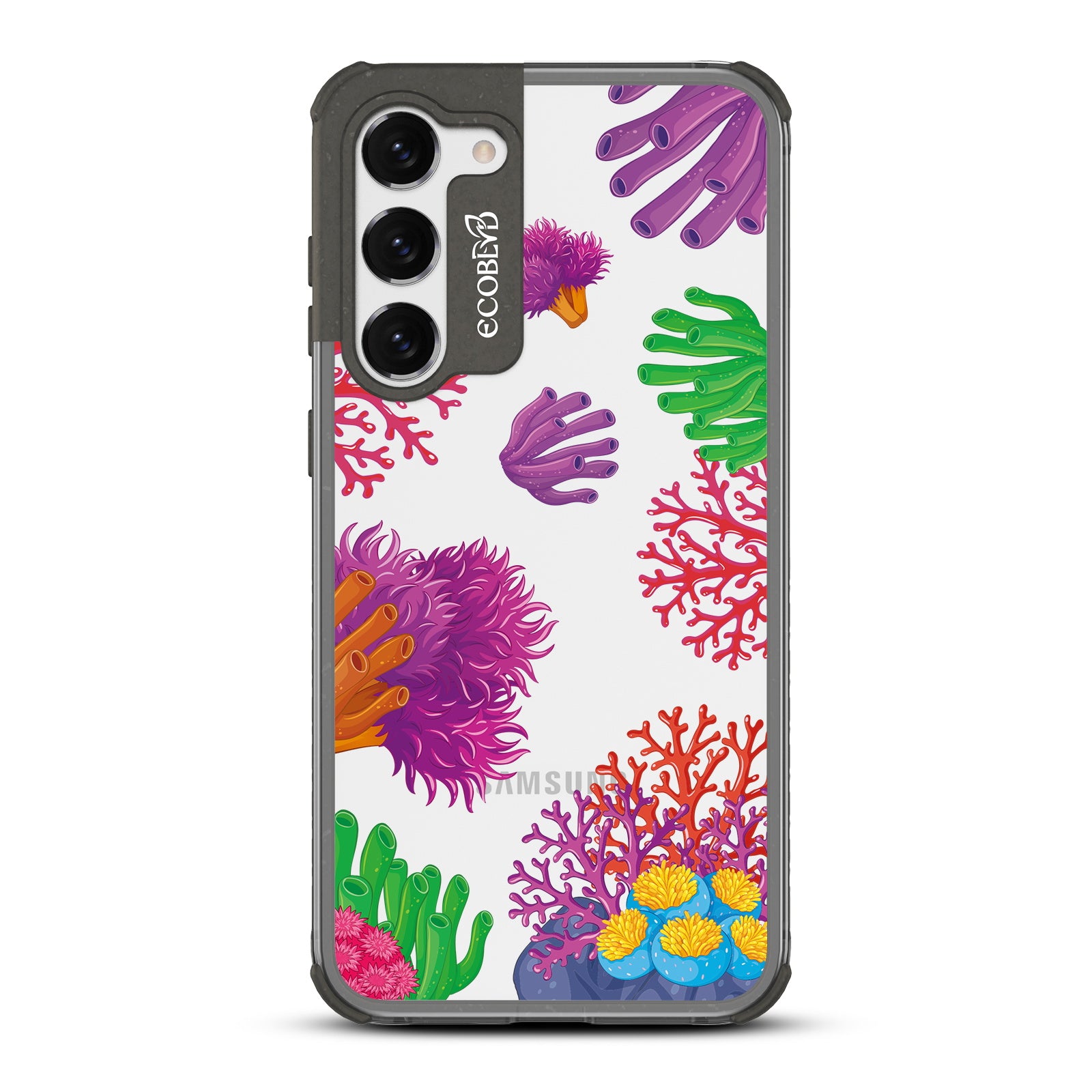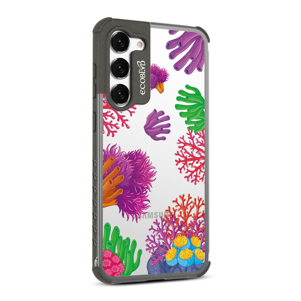 The Coral Reef design on our Laguna clear Galaxy S23 Plus case instantly transforms your phone into an undersea adventure as these colorful phone cases are covered in anemones, sea grass, and other stunning tropical underwater plants across five vibrant color options: Midnight Black, Cascade Blue, Foliage Green, Illuminating Yellow, and Wildflower Pink.