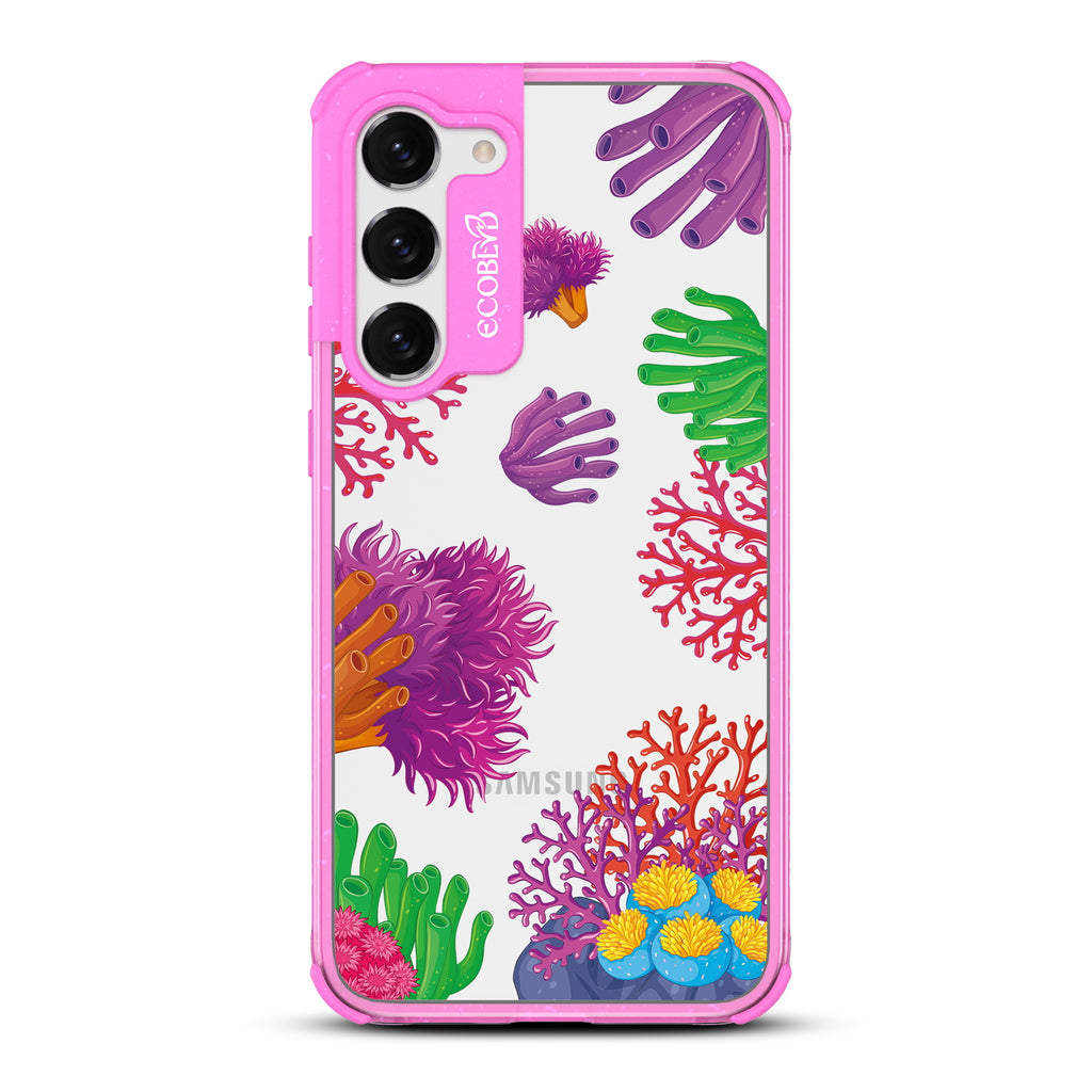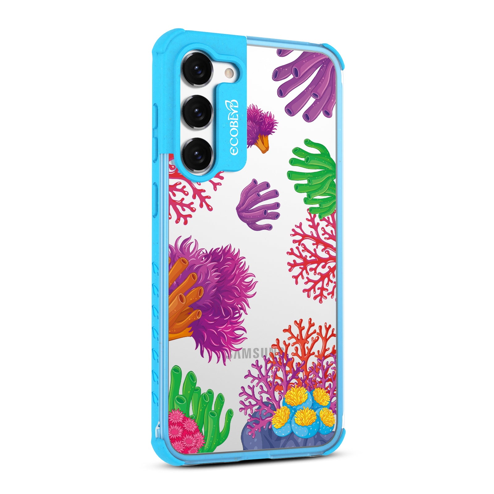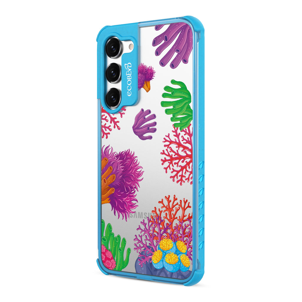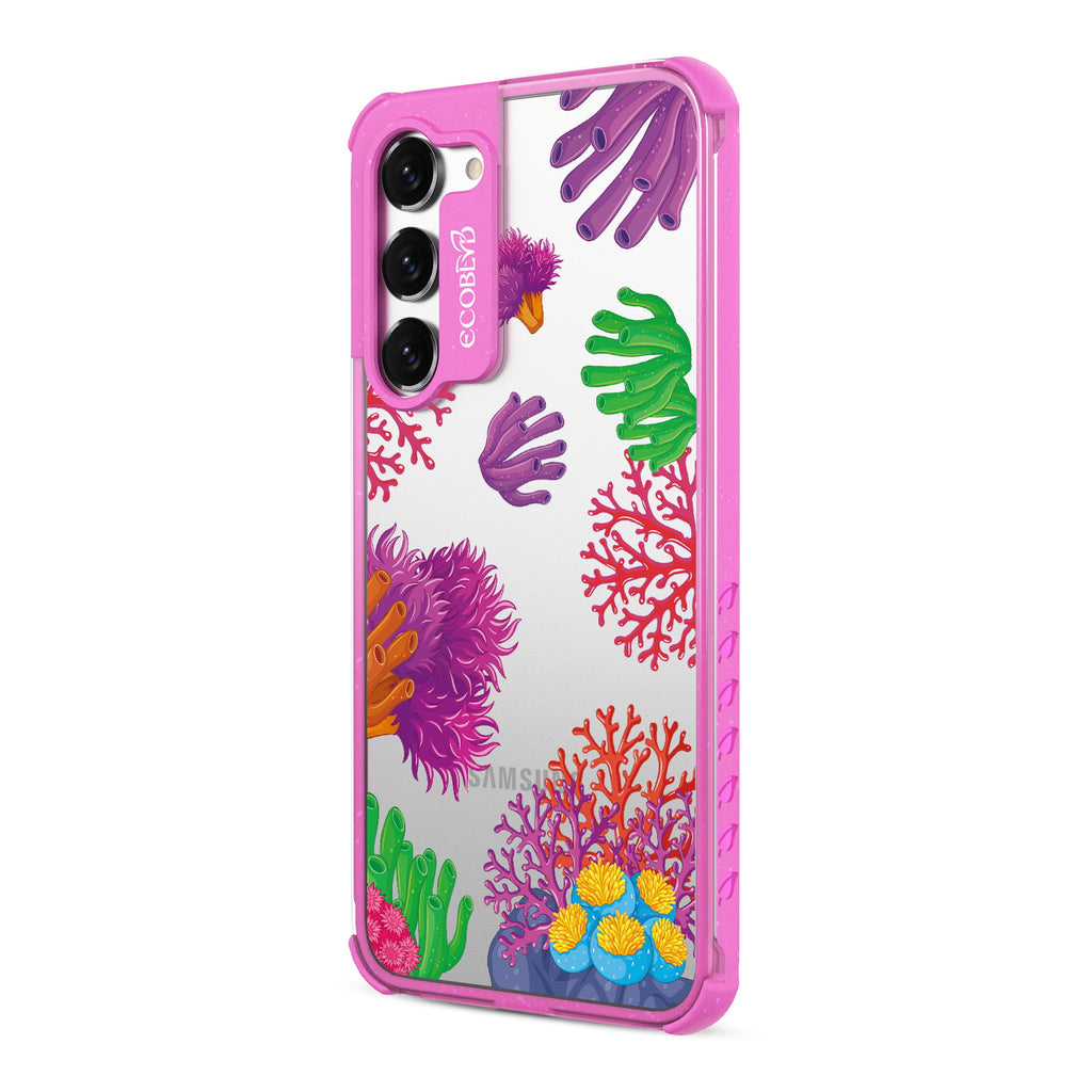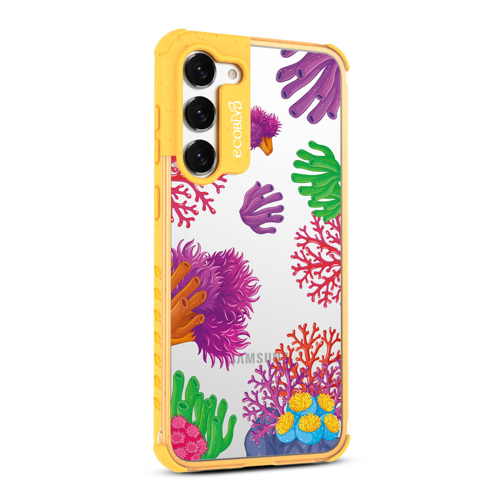 The Coral Reef design on our Laguna clear Galaxy S23 Plus case instantly transforms your phone into an undersea adventure as these colorful phone cases are covered in anemones, sea grass, and other stunning tropical underwater plants across five vibrant color options: Midnight Black, Cascade Blue, Foliage Green, Illuminating Yellow, and Wildflower Pink.