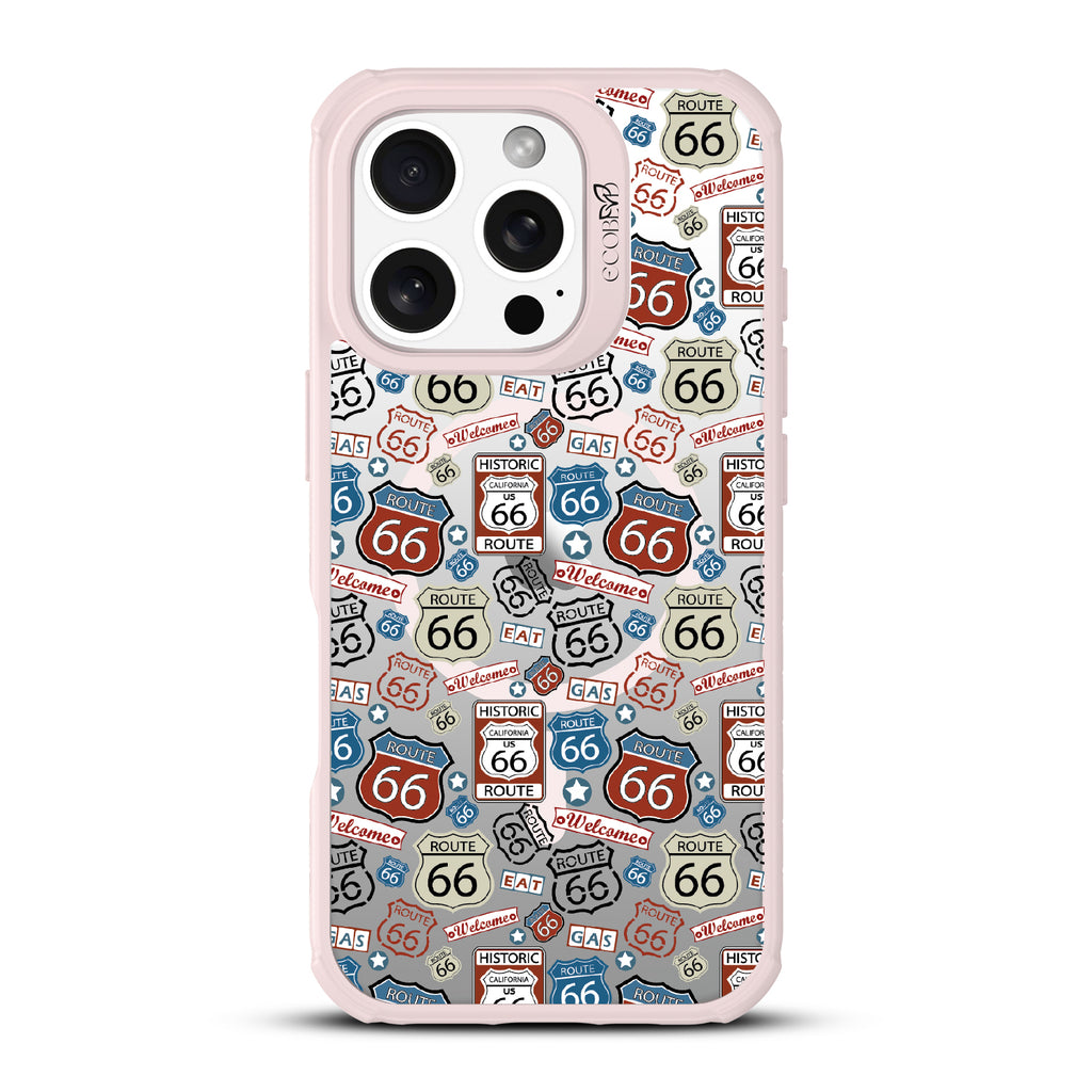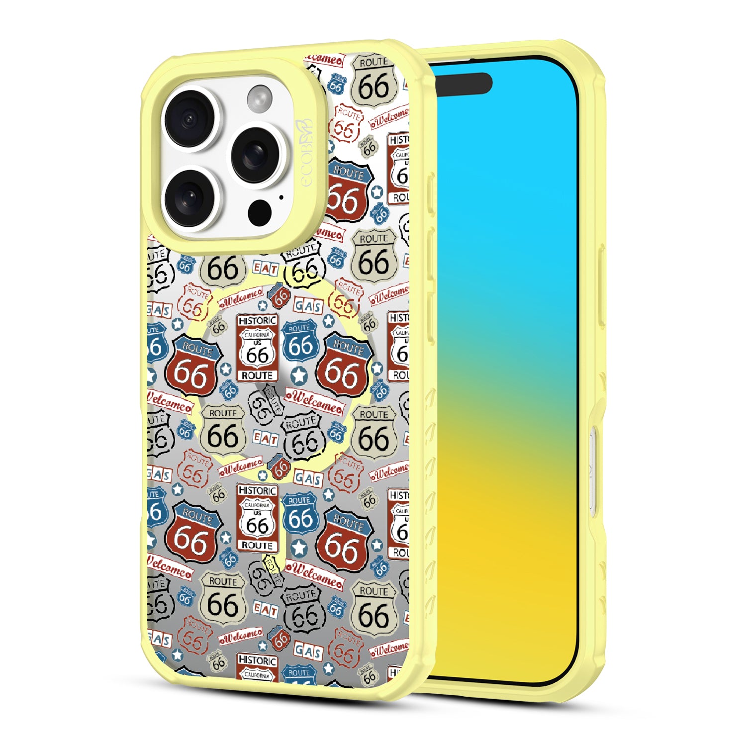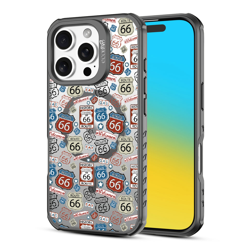 Travel the famed Route 66 with our Country Roads design on our Revive clear iPhone 16 Pro phone case. Showcasing iconic Route 66 signs, rustic road markers, and scenic stops, this design celebrates the timeless appeal of America’s most famous highway.