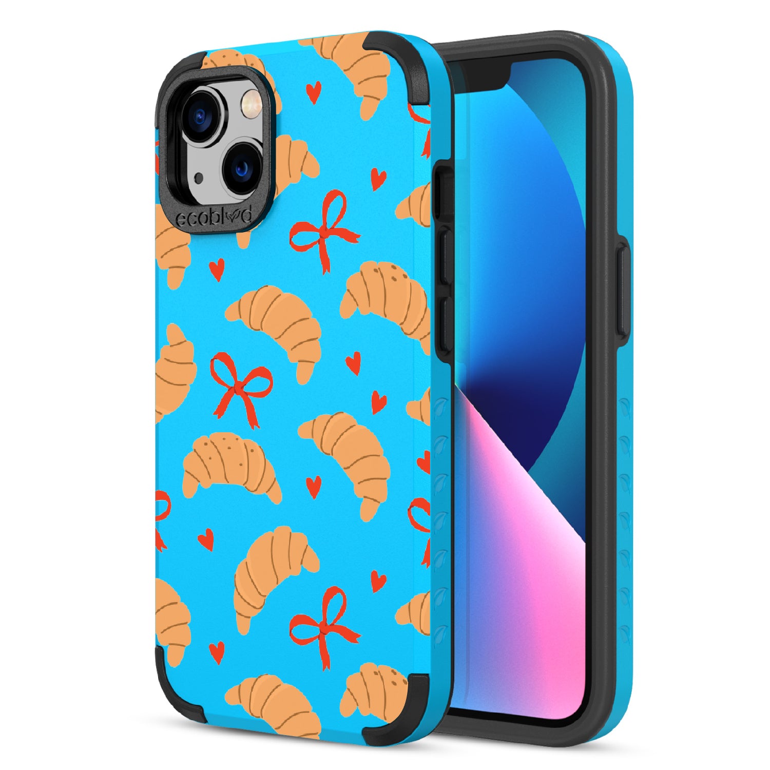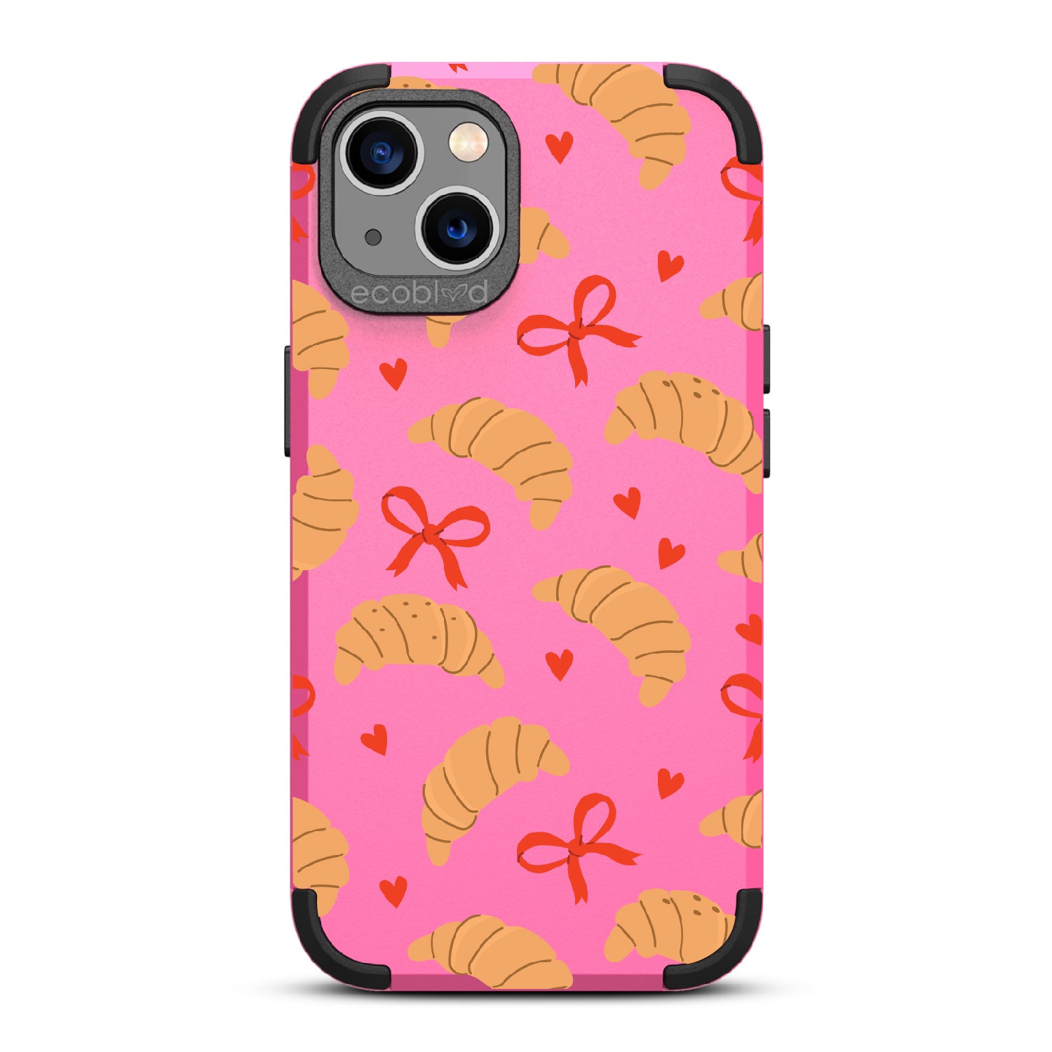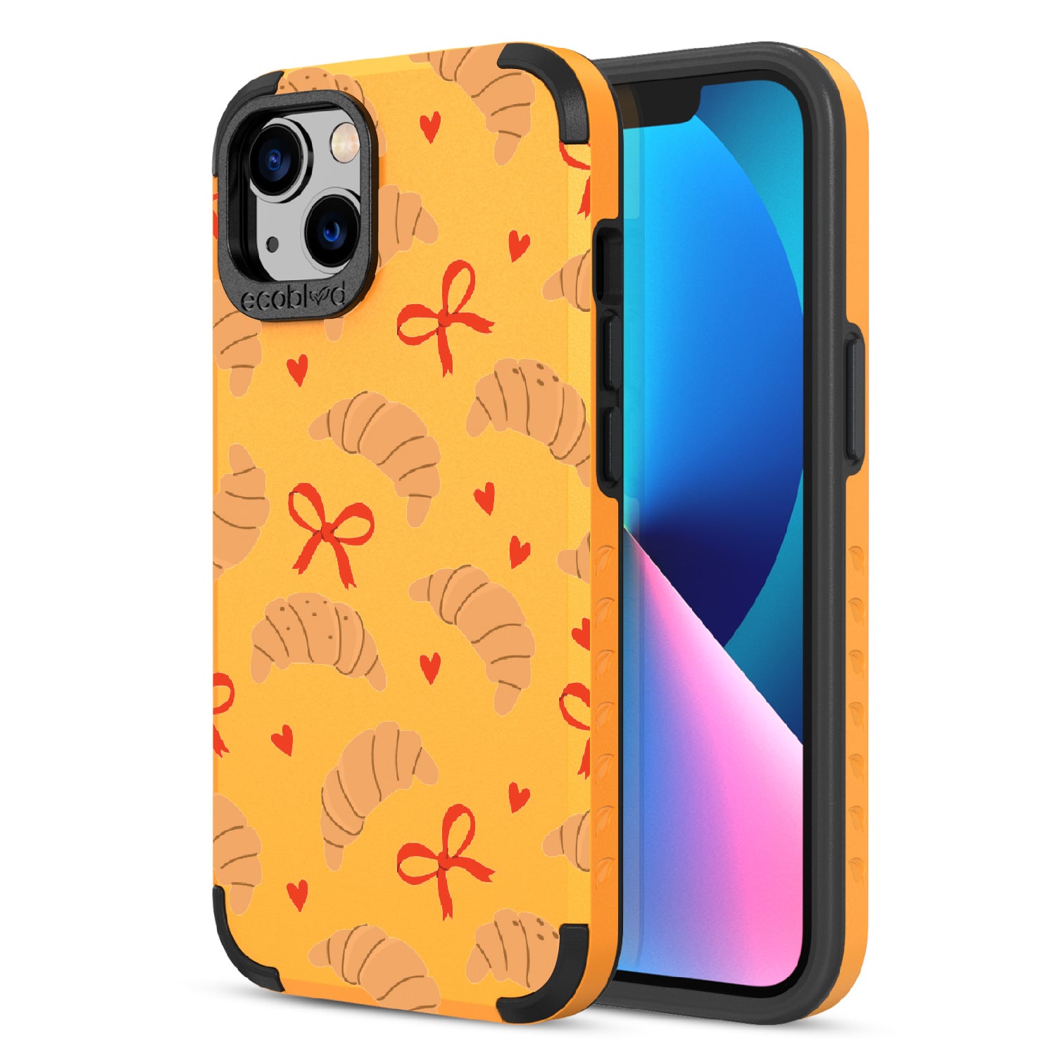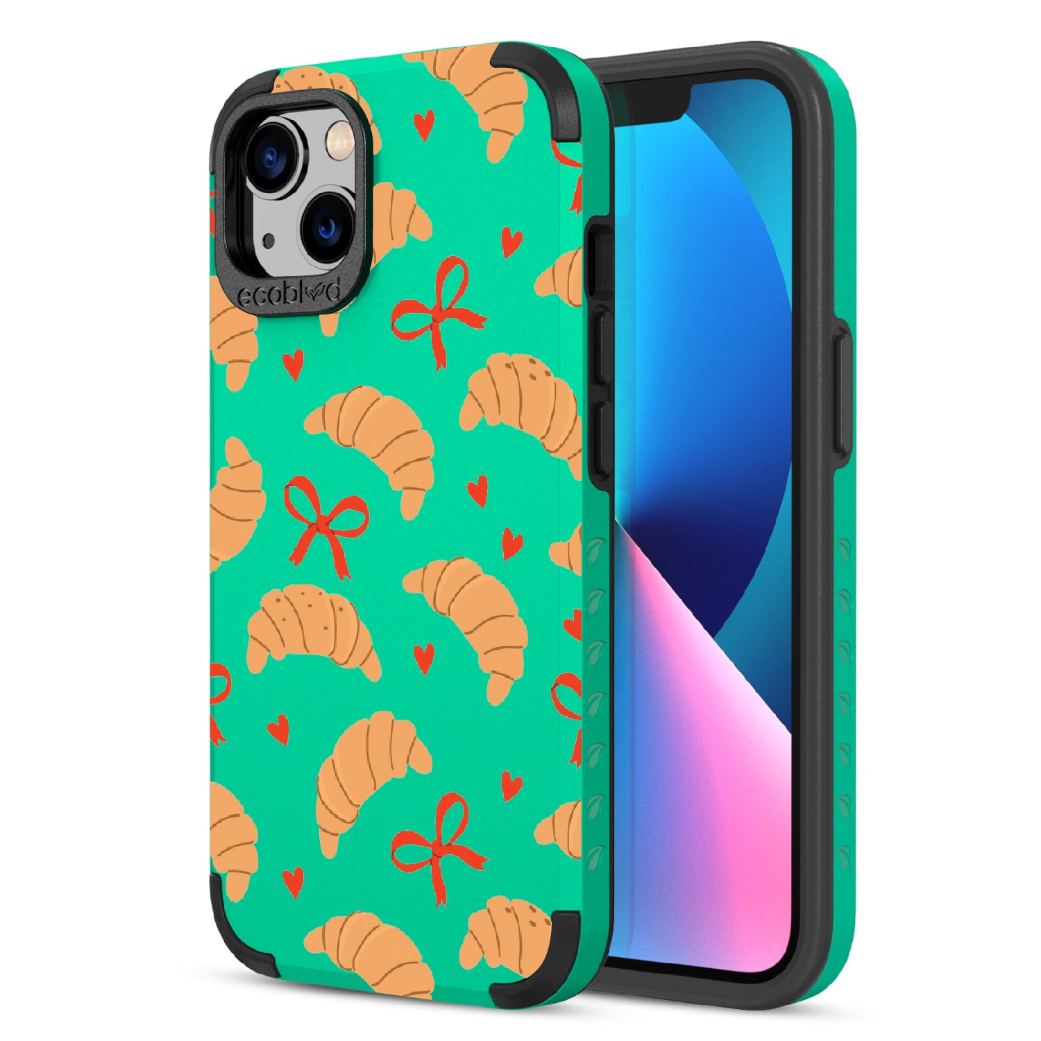 Good taste deserves the perfect recipe like the Croissant Couture design on our Mojave rugged and compostable iPhone 13 case! Softly folded croissants, tied with dainty red bows and sprinkled with sweet hearts, evoke the lightness and care of a true delicacy.